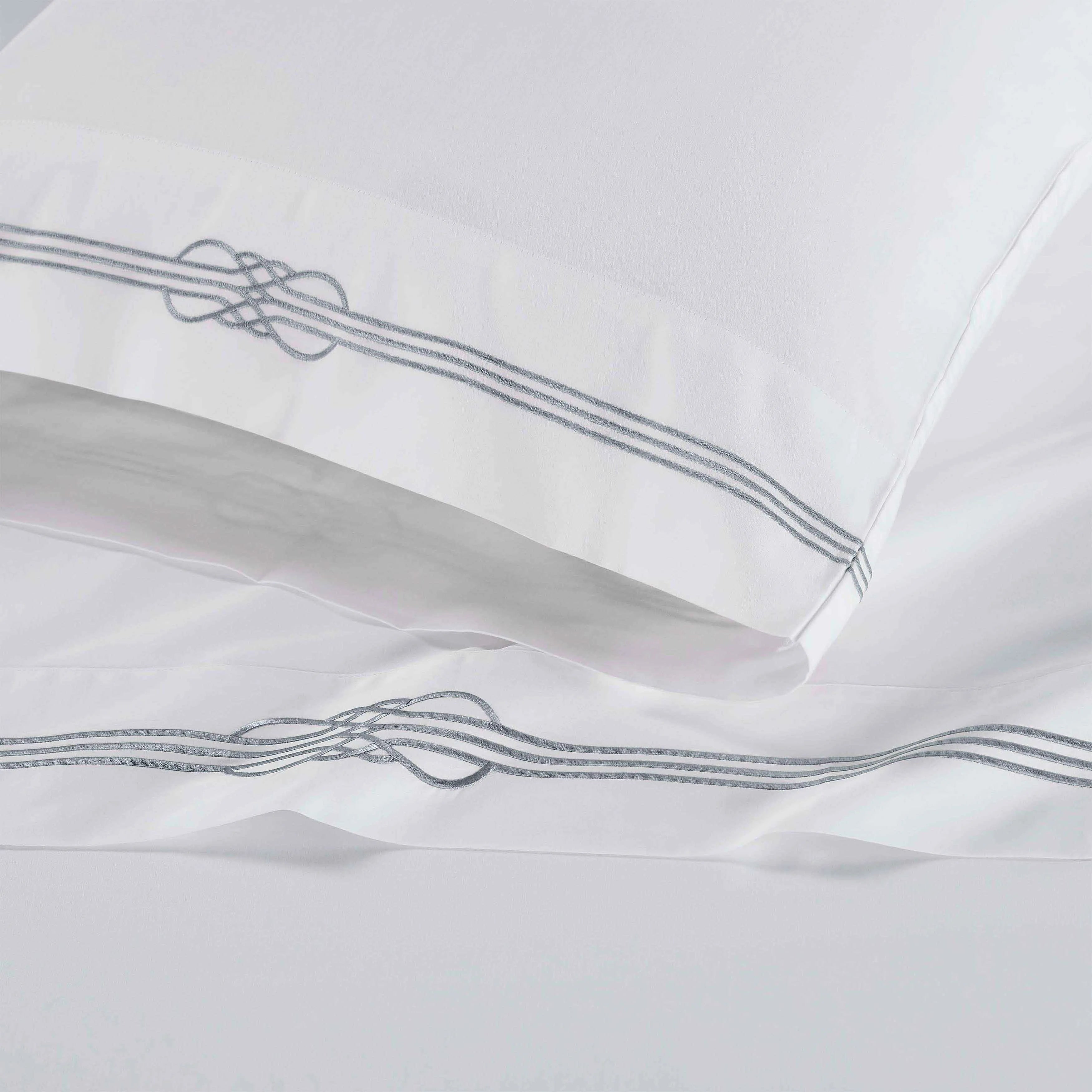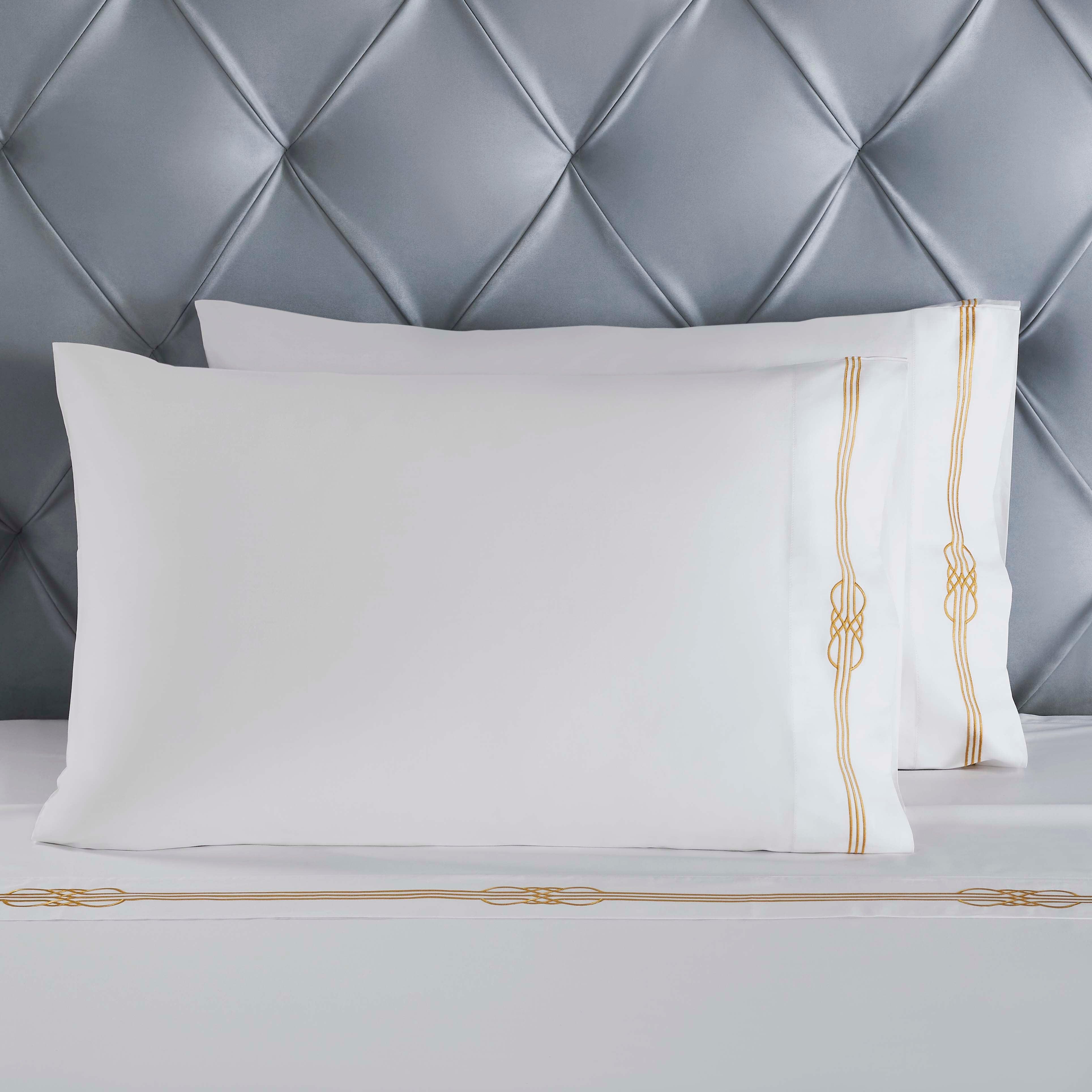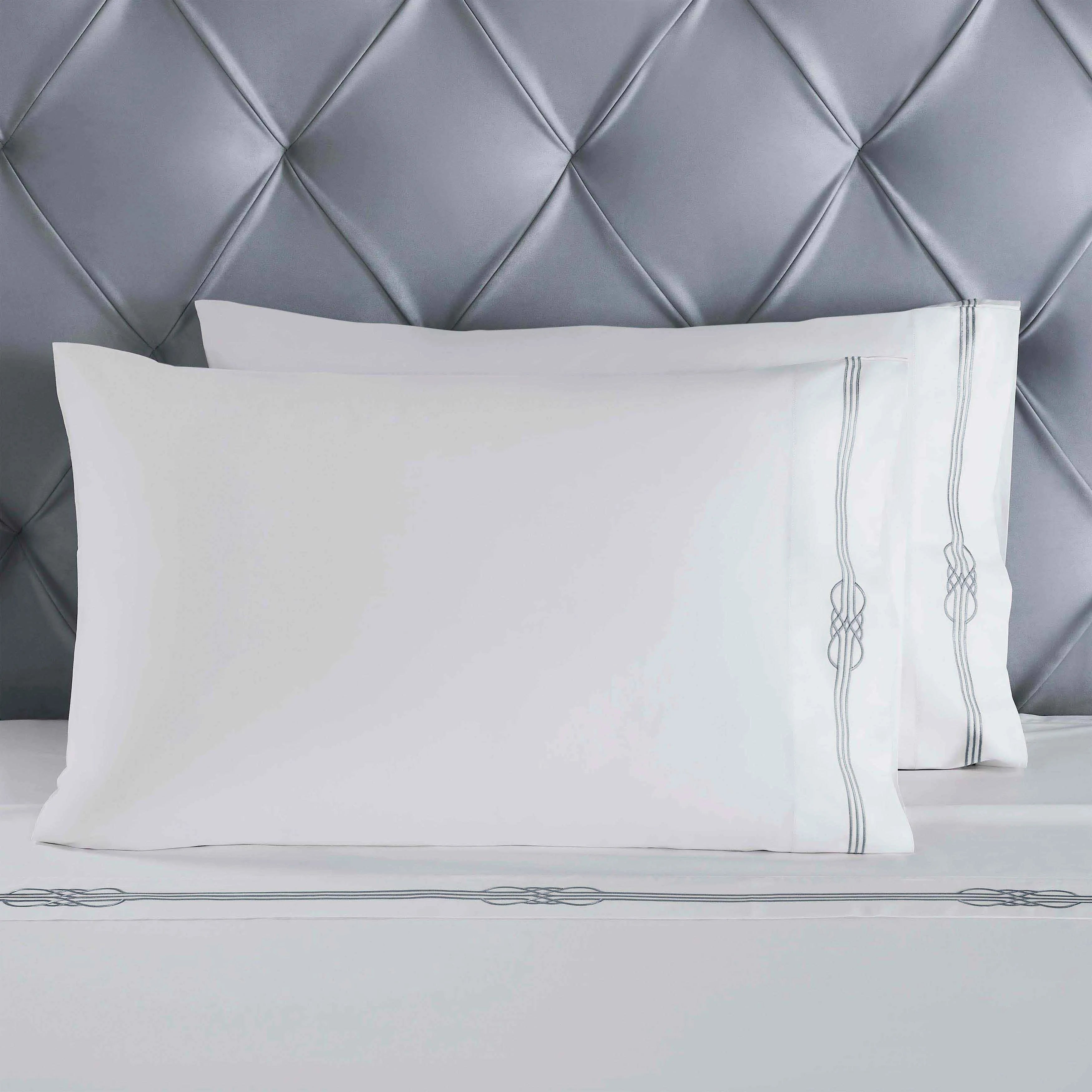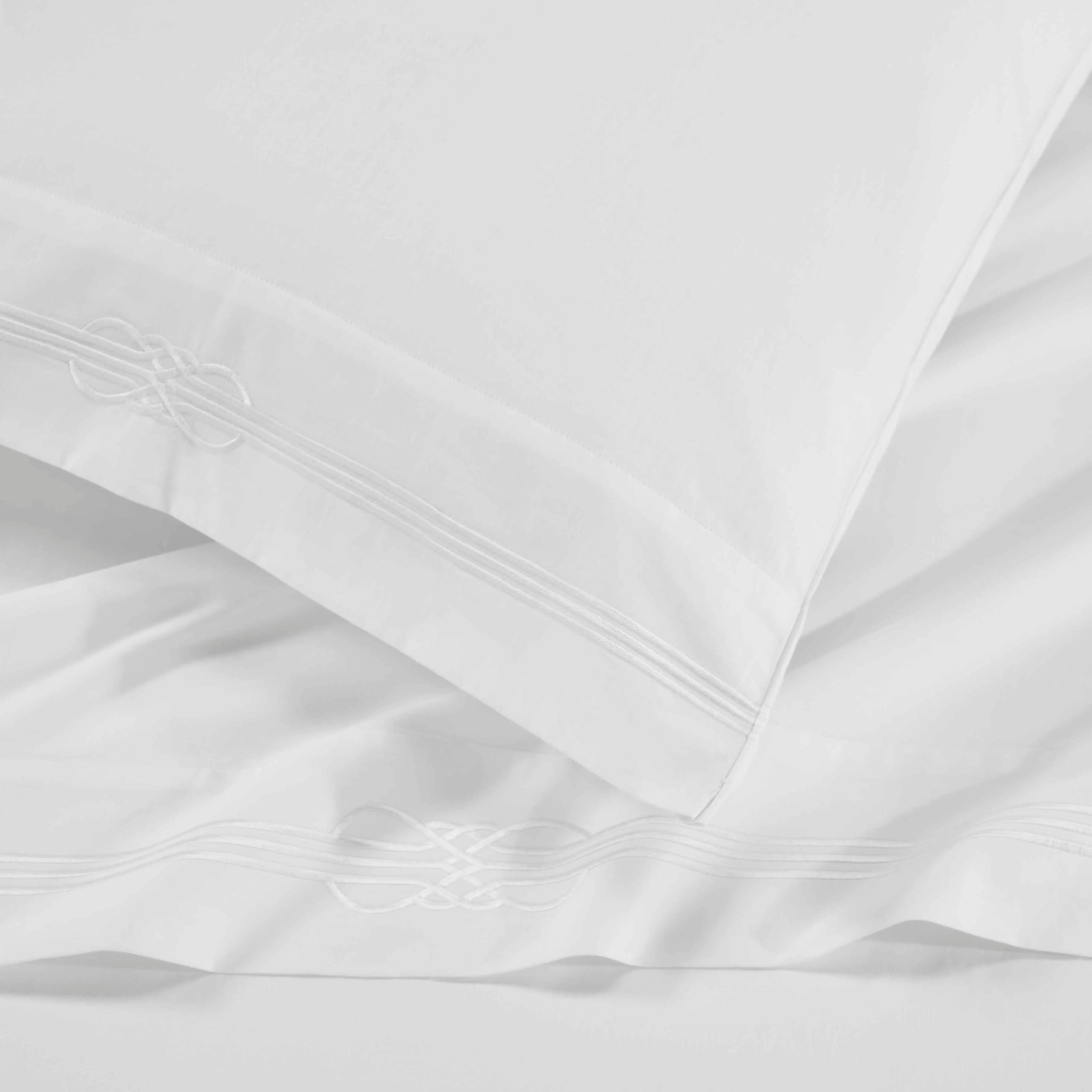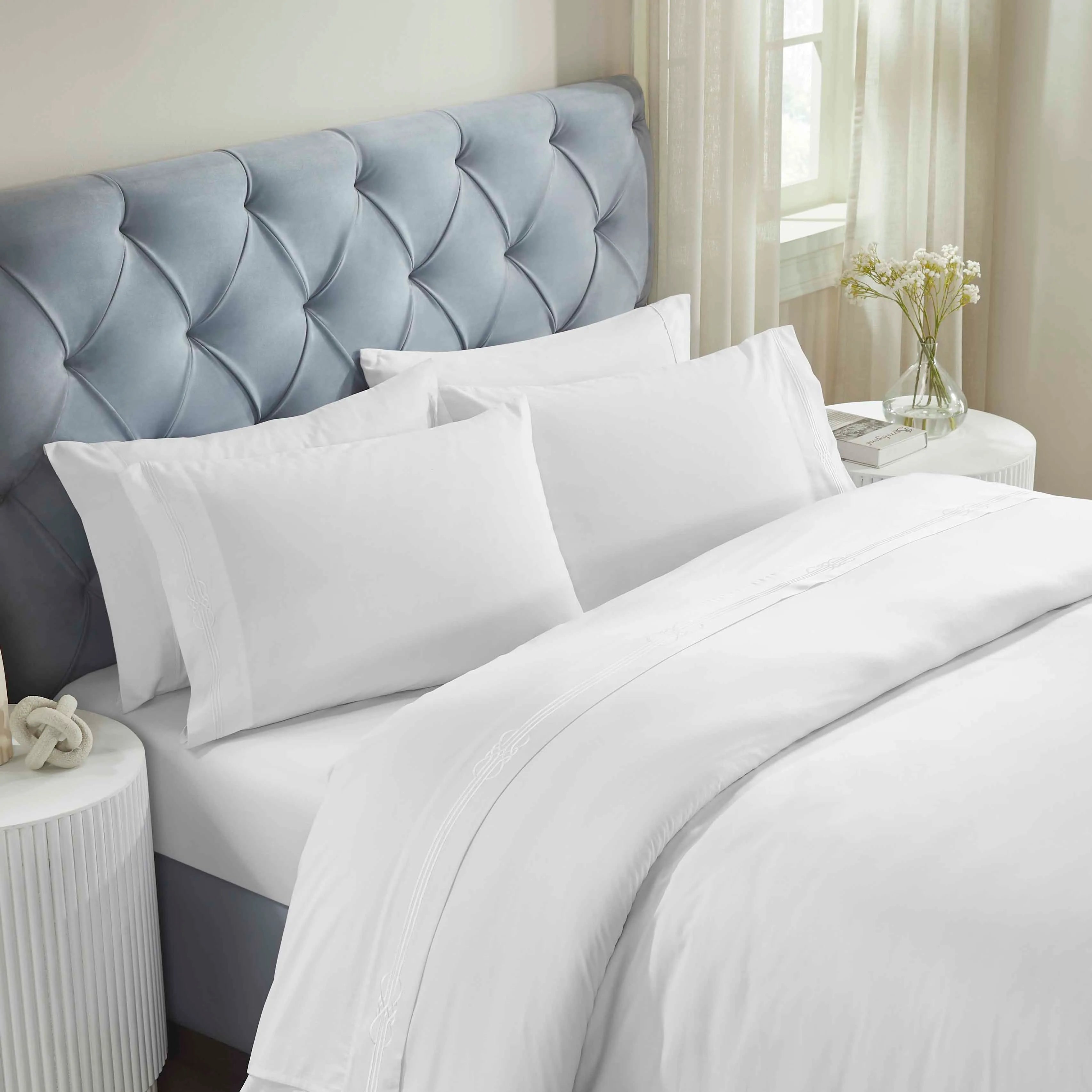 - Coordinated embroidery across the fitted sheet, flat sheet, and pillowcases for a polished appearance.