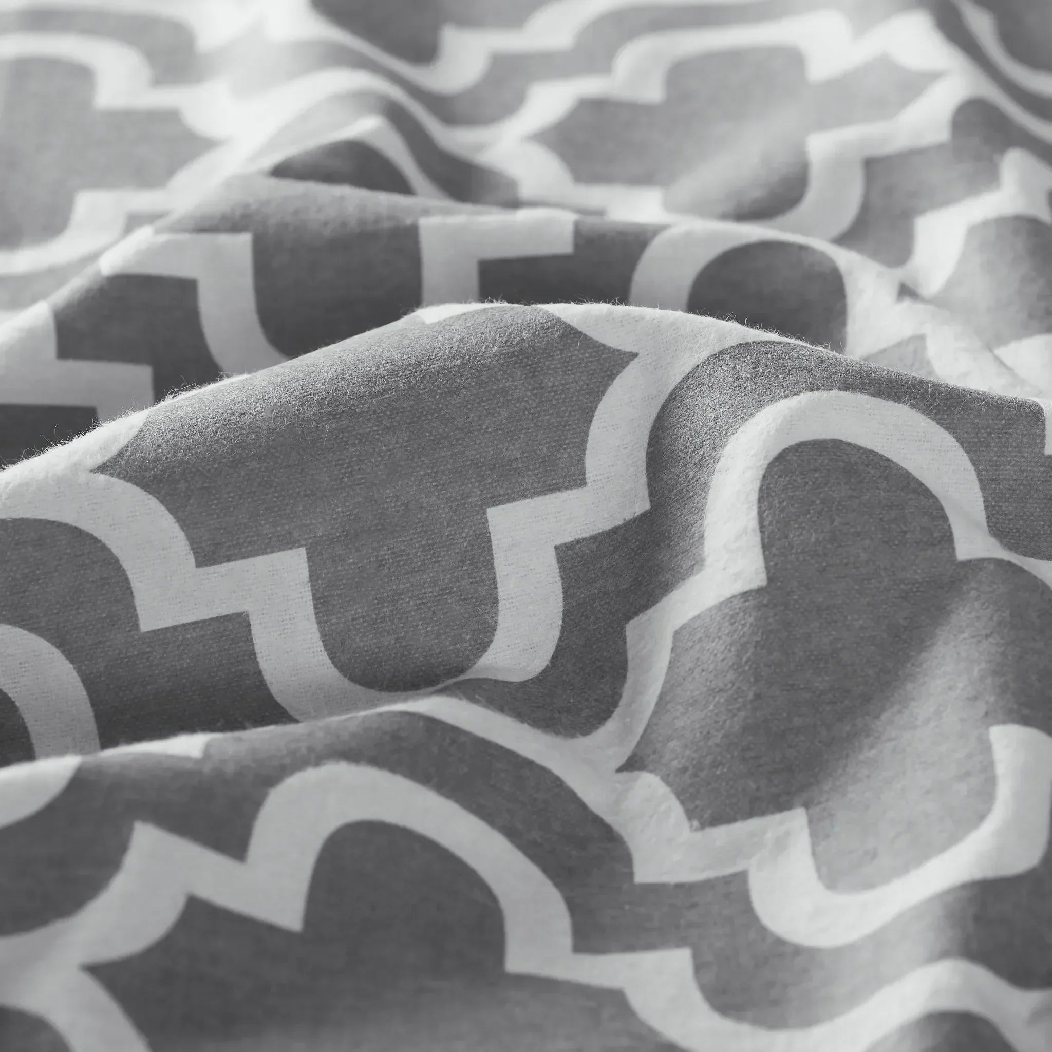 This bed sheet set is crafted from brushed cotton flannel, offering a soft and fuzzy texture that provides warmth and insulation. It features a continuous, symmetrical geometric design in crisp white against various solid-colored bases. The set includes 2 pillowcases, 1 flat sheet, and 1 fitted sheet, suitable for a standard bed.