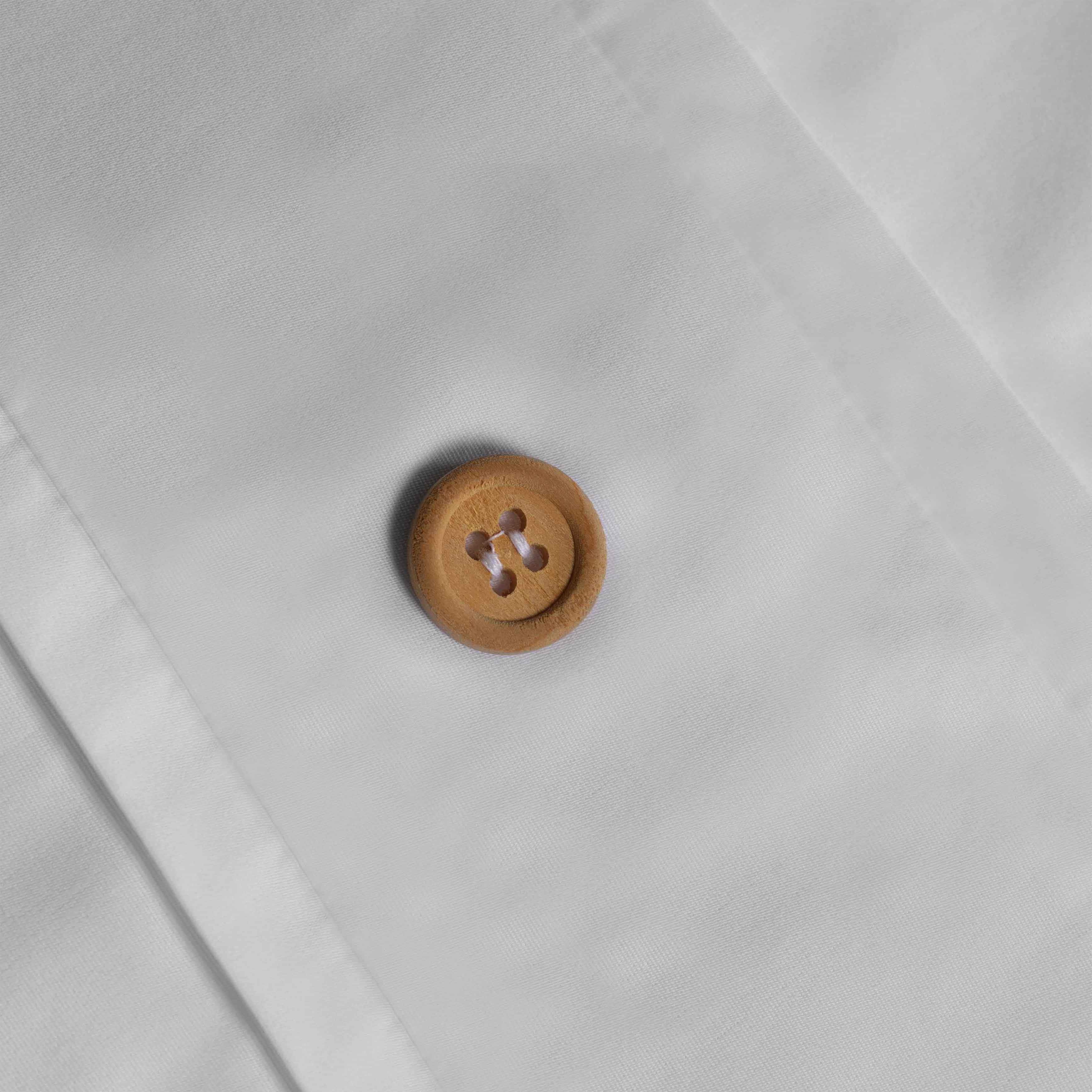 - A coordinated set of sheets, duvet, and pillowcases in white with matching button details for a cohesive look.