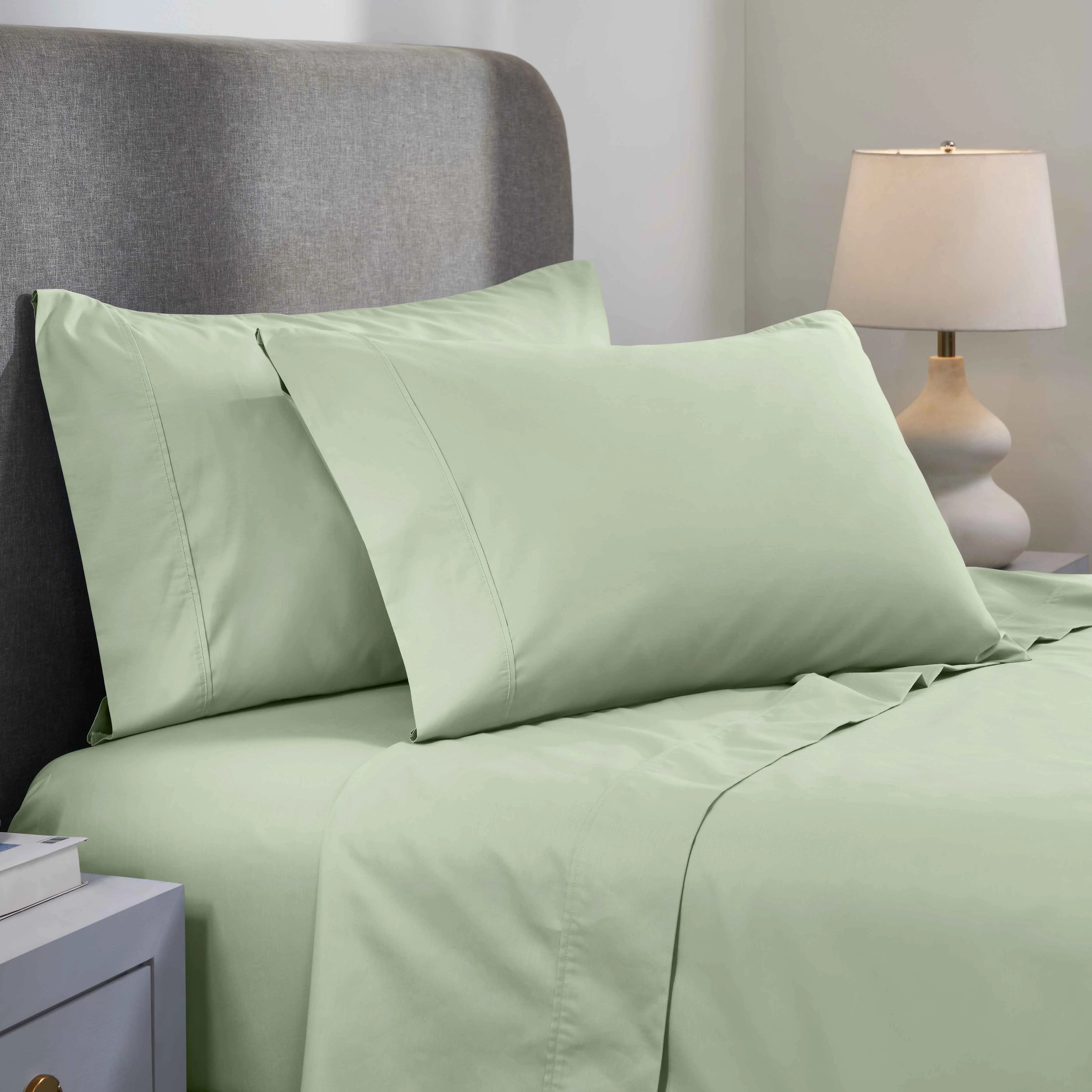 This product is a bed linen set, crafted from a durable cotton blend material. The set includes sheets and pillowcases in multiple solid, neutral colors. The smooth and tightly – woven fabric has a slight sheen, and the clean stitching ensures its long – lasting use.