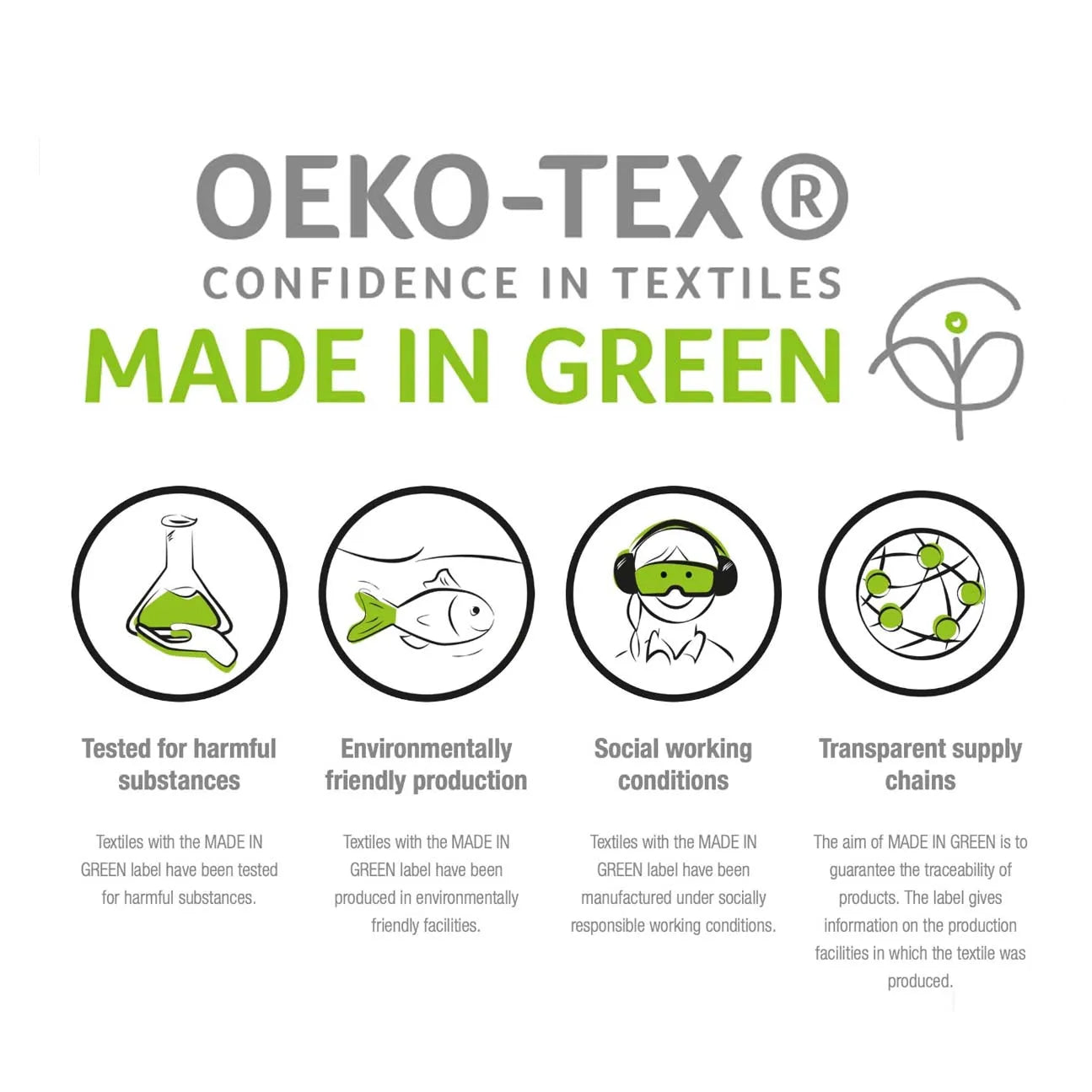 - OEKO – TEX MADE IN GREEN certification for safety, eco – friendliness, and ethical production