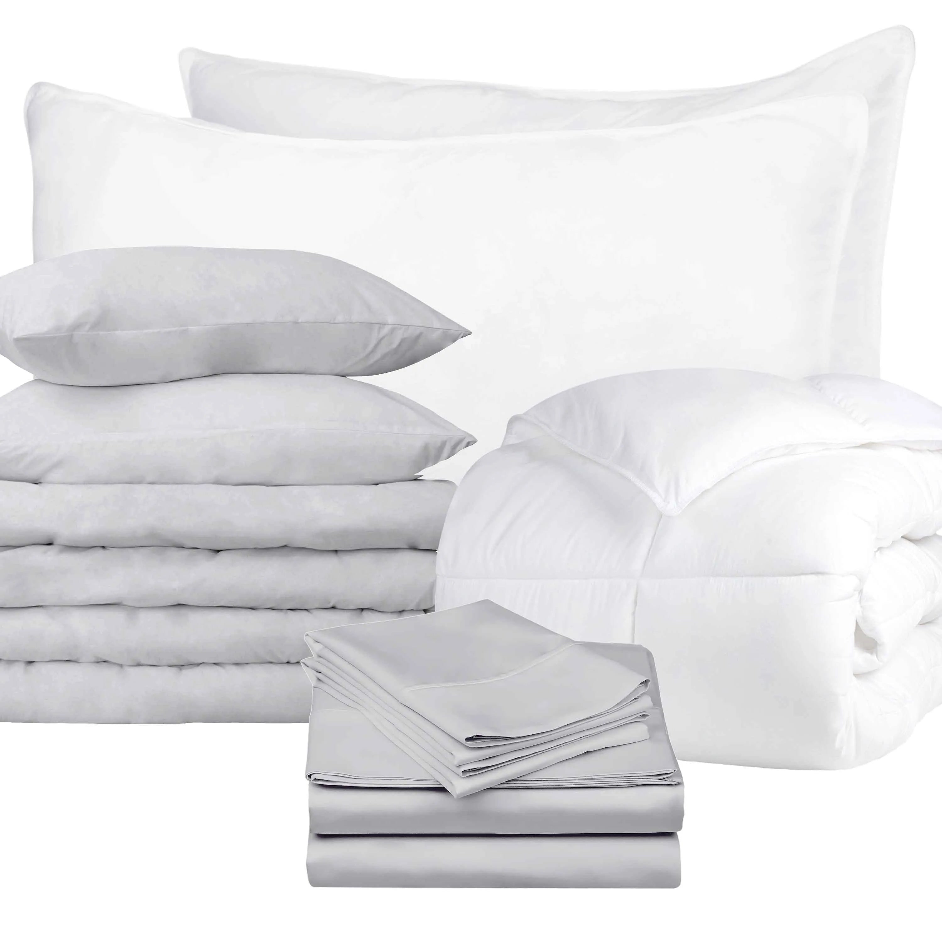 - Comprehensive set with a fitted sheet, flat sheet, multiple pillowcases, and a comforter.