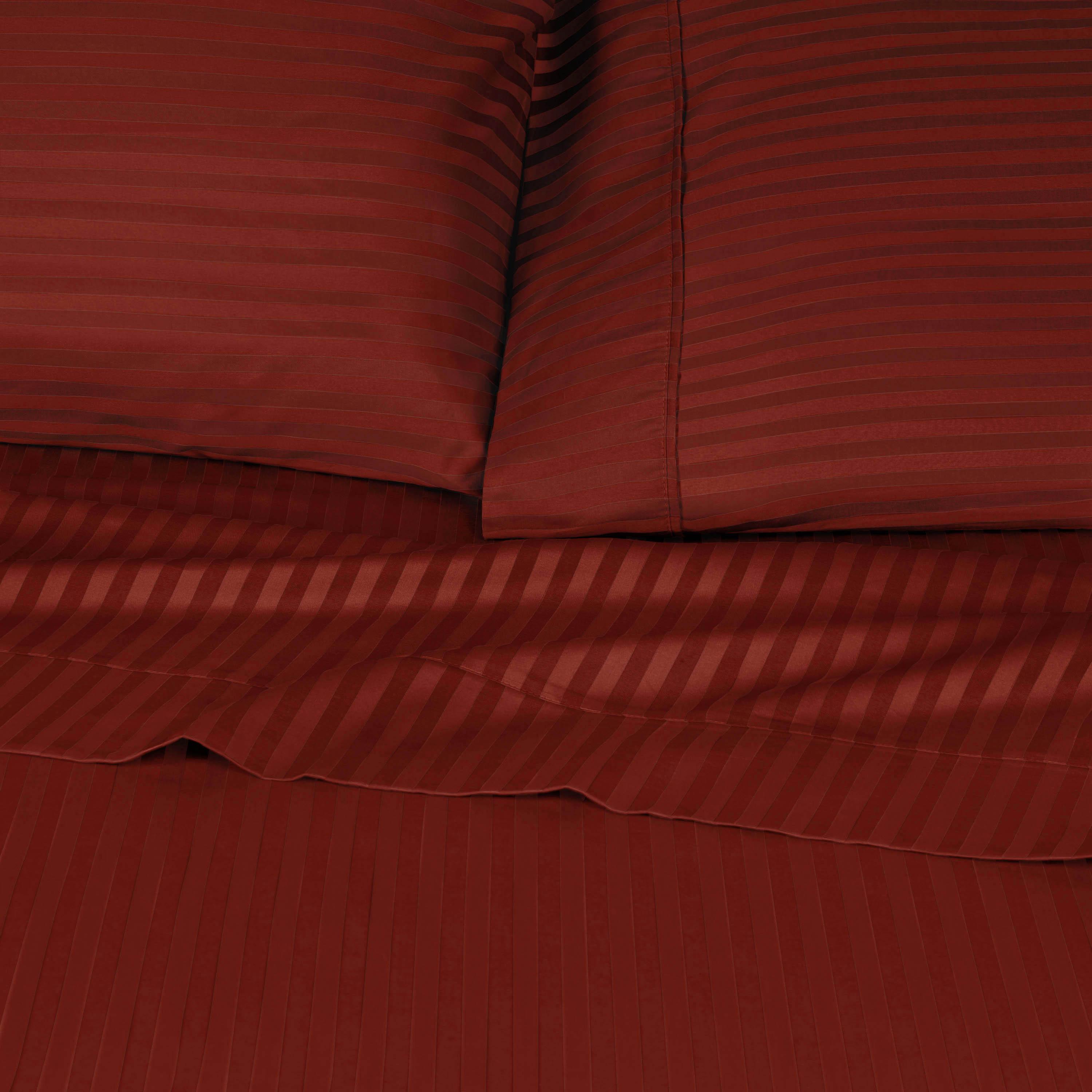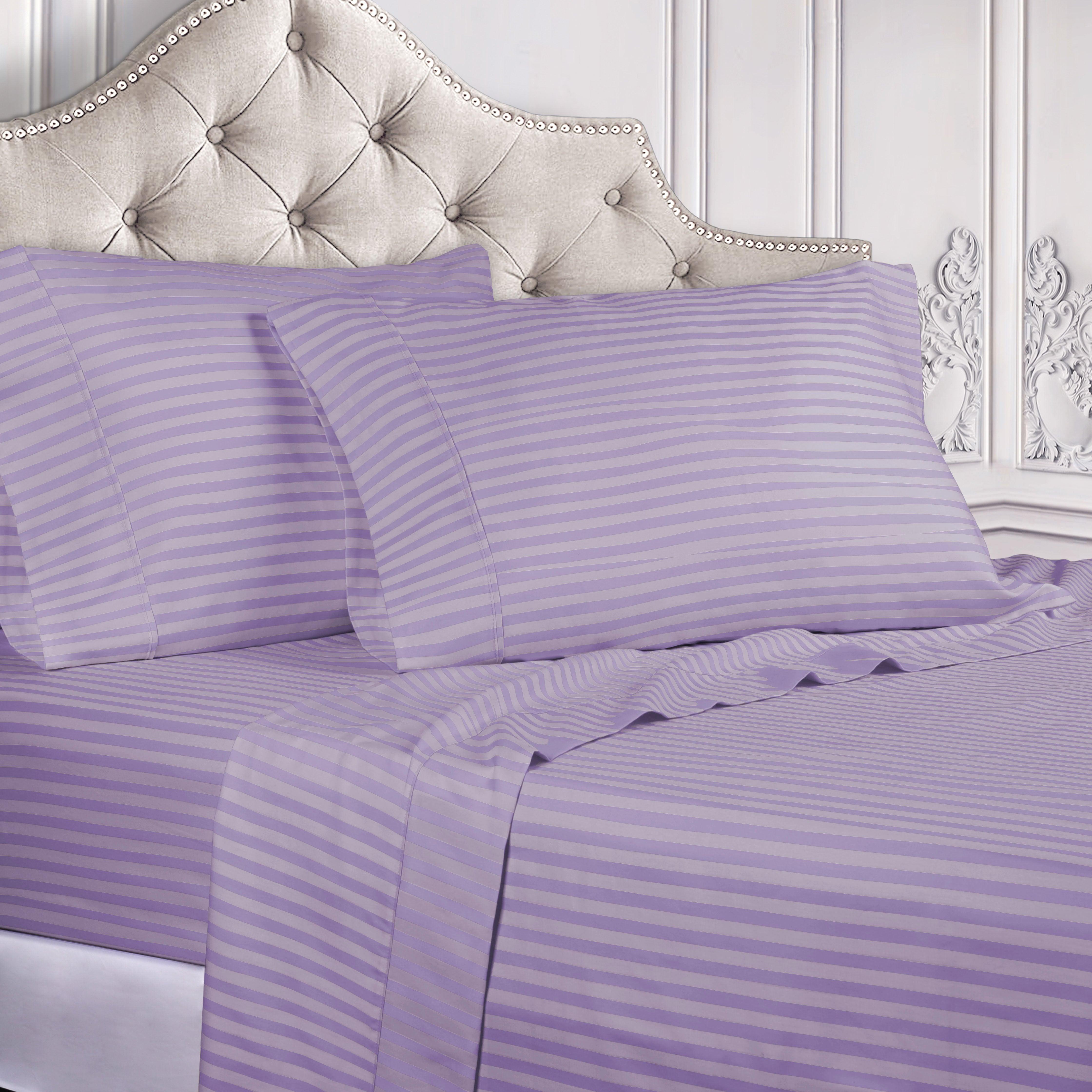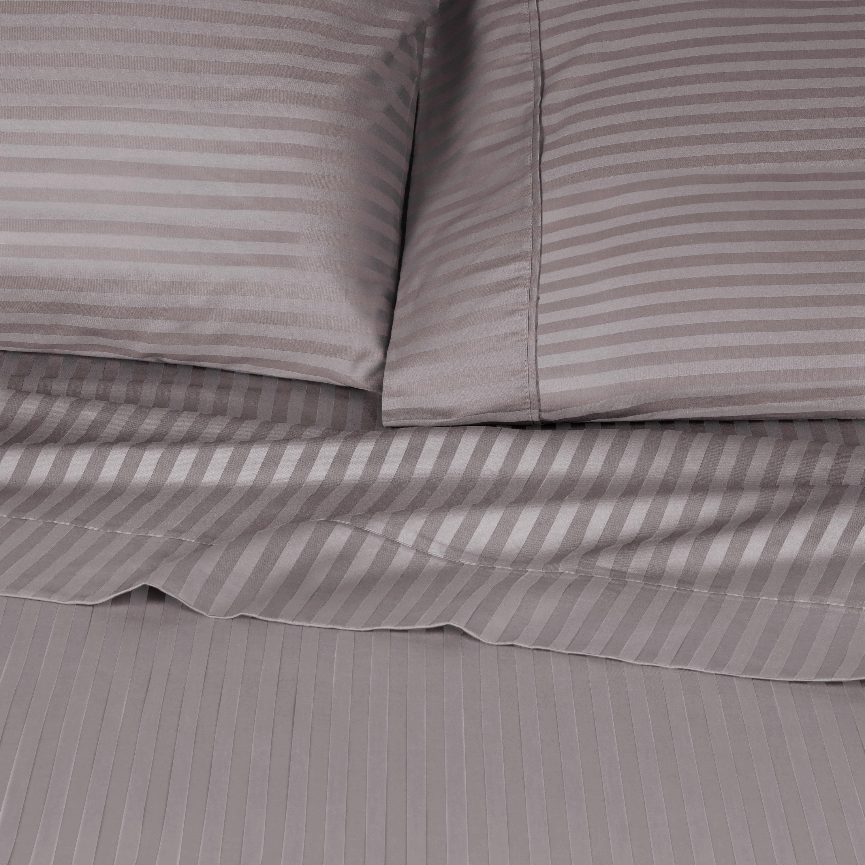 This bed sheet set offers a classic look with its vertical-striped design. Crafted from 100% Egyptian Cotton, it has a smooth, silky feel and a high thread count of 300, ensuring durability and comfort. The set comes with multiple pieces including a fitted sheet, flat sheet, and pillowcases, suitable for various bed sizes.