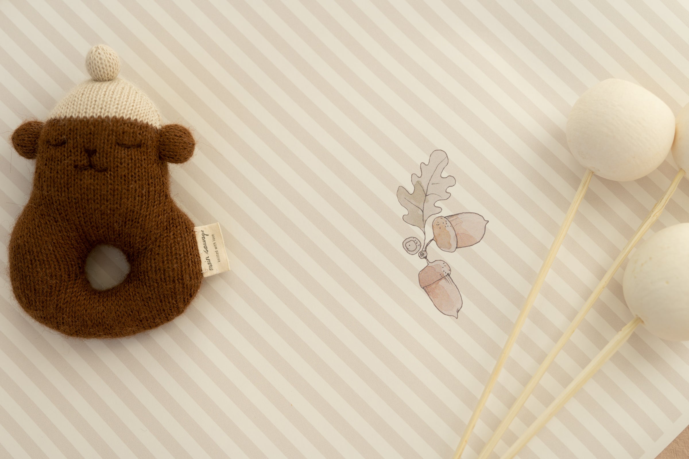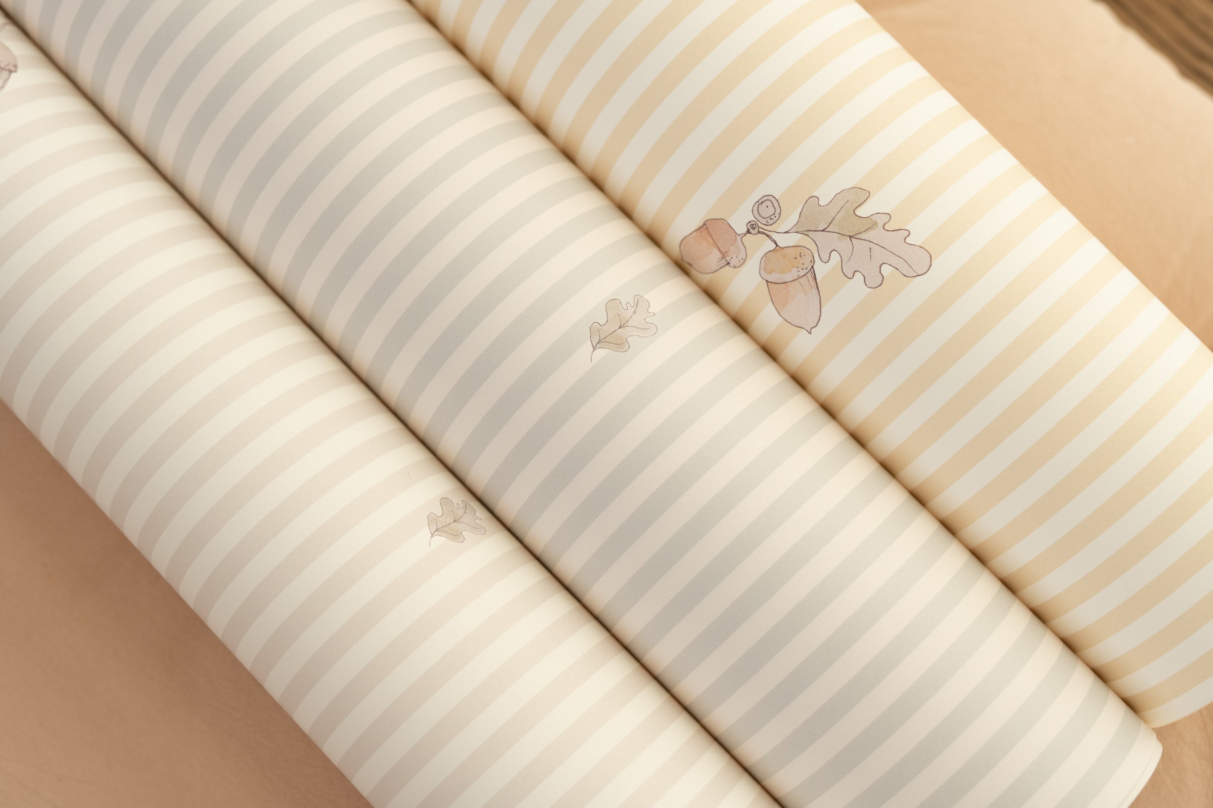 Delicate non-woven wallpaper in neutral grey-beige with hand-painted acorns Bring timeless calm into your space with our Acorn Stripes β grey beige wallpaper. Featuring hand-painted watercolour acorns scattered over thin vertical stripes in warm greys and beiges, this design is subtle, elegant and endlessly versatile. Perfect for nurseries, bedrooms, and Japandi-inspired interiors. Product details: Design: hand-painted acorns on soft grey-beige striped background Colours: dusty beige, light grey, warm neutral tones Material: high-quality non-woven (vlies) wallpaper Finish: matte, smooth Pattern repeat: every 50 cm Production: made to order β each roll is printed just for you Sizes & Installation Β 2 strips per roll: β’ 50 Γ 270 cm β’ 50 Γ 310 cm Each set covers 1 meter of wall width Β Installation: β’ Paste the wall (not the wallpaper) β’ Use non-woven wallpaper paste β’ Surface must be clean, smooth, and dry β’ Instructions: Download the step-by-step non-woven wallpaper guide How many rolls do I need? Each set = 2 strips (50 cm wide) = 1 m wall width. Examples: 2.3 m wide wall β order 3 sets 4 m wide wall β order 4 sets Tip: Always add 5β10 cm for margin, as walls are rarely perfectly straight. Lead time & delivery Production: 1β3 working days Shipping: 2β7 working days (EU) Check β Double Check Please carefully inspect your wallpaper before installation. Verify colours, pattern alignment, and length immediately upon delivery. We allow a cutting tolerance of up to 1 mm per strip. If the deviation is larger, we will gladly reprint your order. *Once the wallpaper has been cut and installed, it is no longer possible to objectively determine whether any irregularity originates from production or from handling during installation. For this reason, claims raised after installation are very difficult to assess. Important Notes This wallpaper is not kept in stock β itβs printed to order. Not sure about the colour or pattern scale?We recommend ordering a sample first.