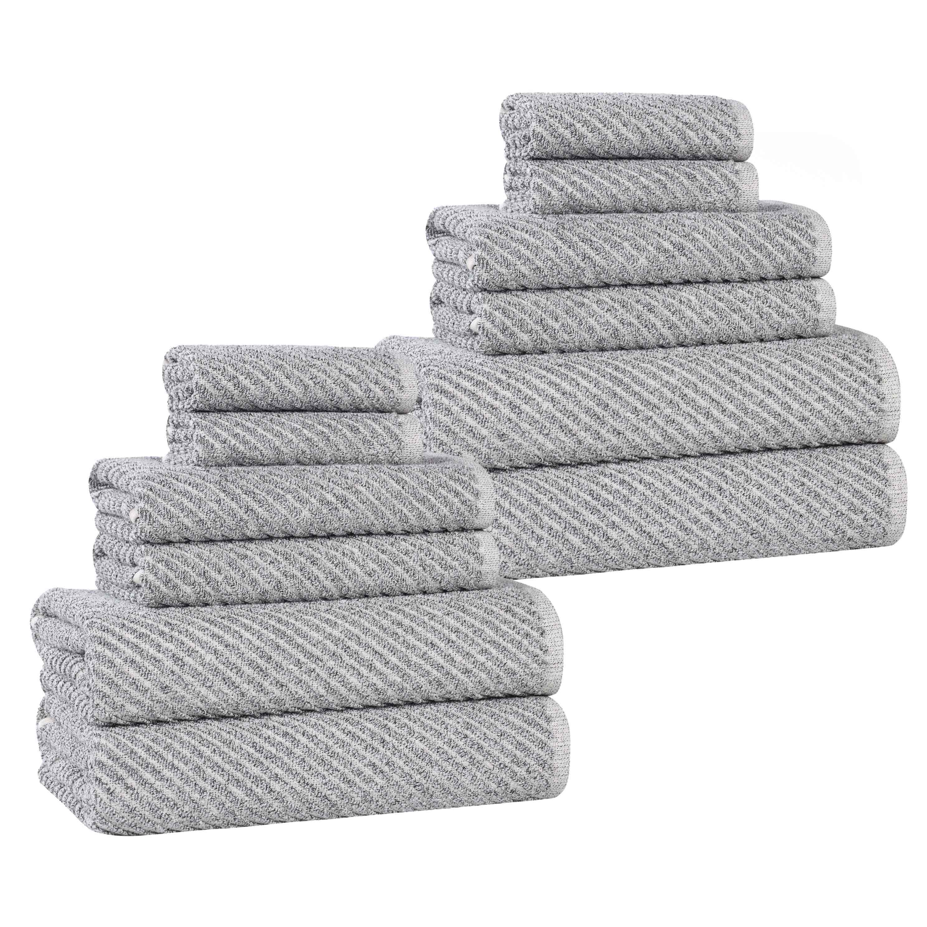 This is a luxurious 12-piece towel set that offers both style and functionality. The towels feature a diagonal chevron pattern in a raised, textured weave, adding visual interest. With a blend of 80% cotton and 20% viscose, they are soft, absorbent, and durable, perfect for daily use in the bathroom.