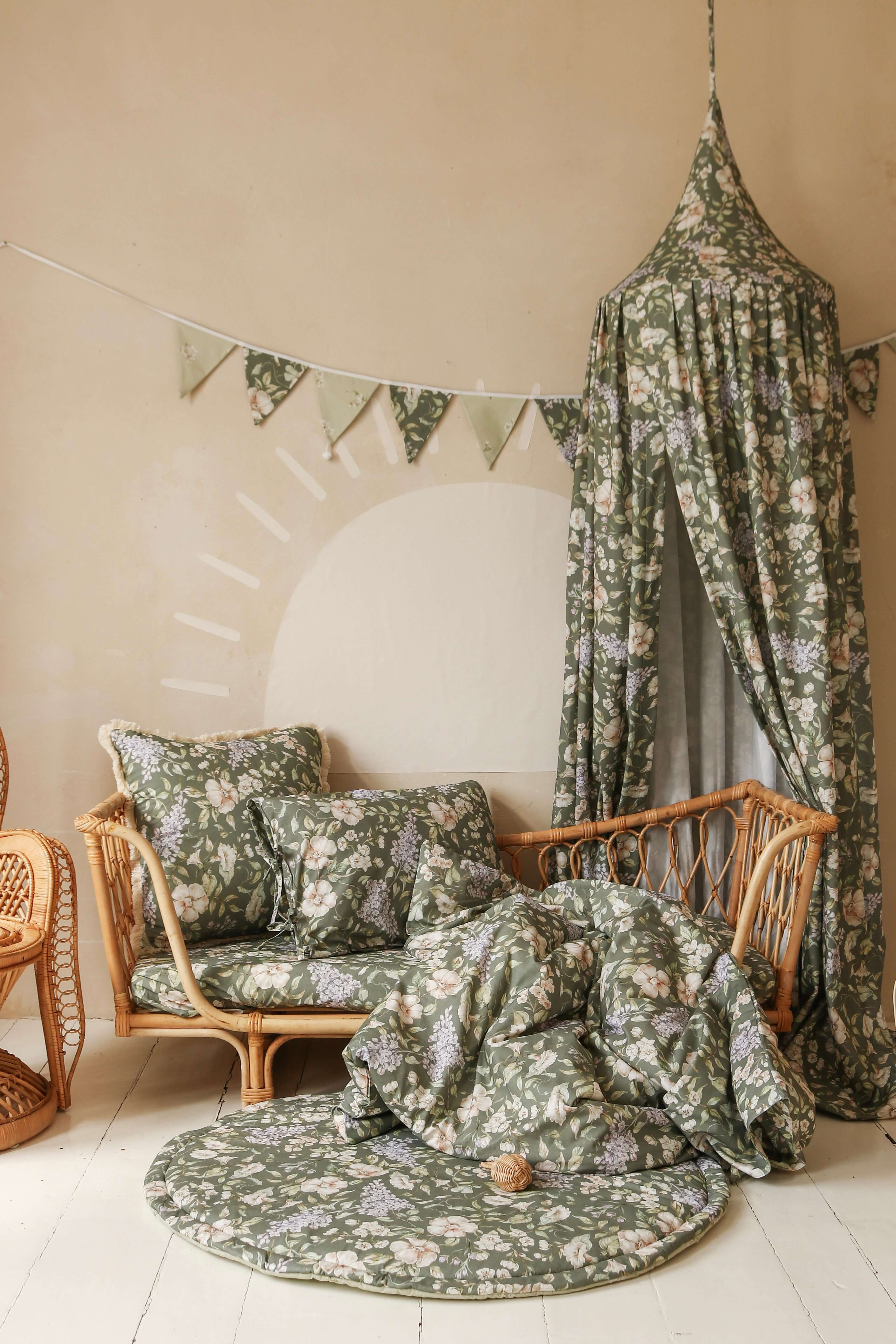 Keep your babyβs essentials tidy and close at hand with our Apple Blossom crib organizer. Made from soft cotton, it features delicate white apple blossoms on a fresh green background β a calming and elegant accent for any nursery. The two roomy pockets are perfect for pacifiers, wipes, toys or brushes. Product features Dimensions: 50 x 32 cm Fabric: 100% cotton β soft and breathable Color: Light green base with white apple blossom print Washing: Machine washable at 40Β°C Preparation time: 2β3 business days Handmade in the Netherlands by Roksana (Matuu)
