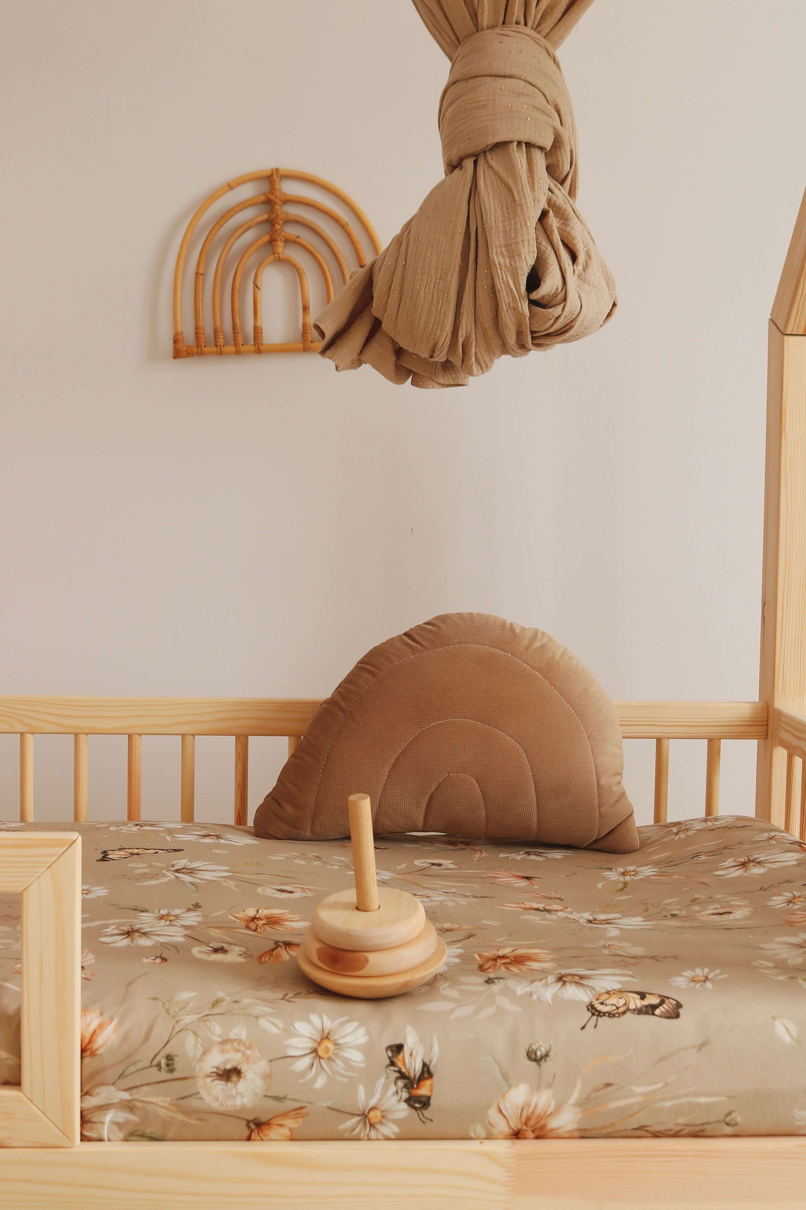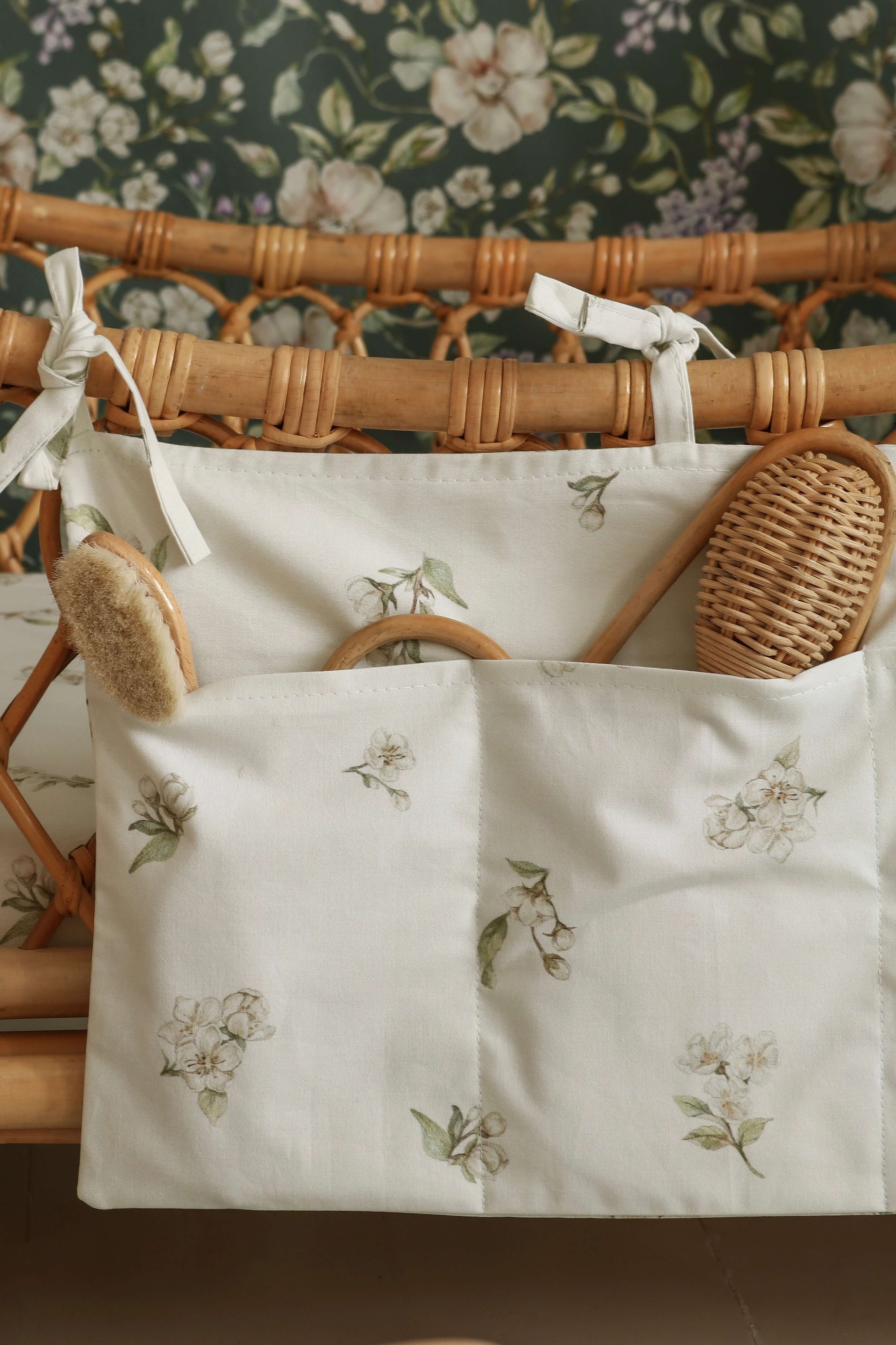 Stay effortlessly organized with this beautiful Apple Blossom on White crib organizer. Handcrafted from soft cotton, it features a delicate floral apple blossom print on a clean white background. With two roomy pockets, itβs perfect for storing pacifiers, brushes, teethers or other daily baby essentials. Tie it easily onto a crib or playpen and bring subtle charm to your babyβs nursery. Product features Dimensions: 50 x 32 cm Fabric: 100% cotton β soft, breathable, and safe for babies Color: Crisp white with delicate apple blossom floral pattern Washing: Machine washable at 40Β°C Preparation time: 2β3 business days Handmade in the Netherlands by Roksana (Matuu)