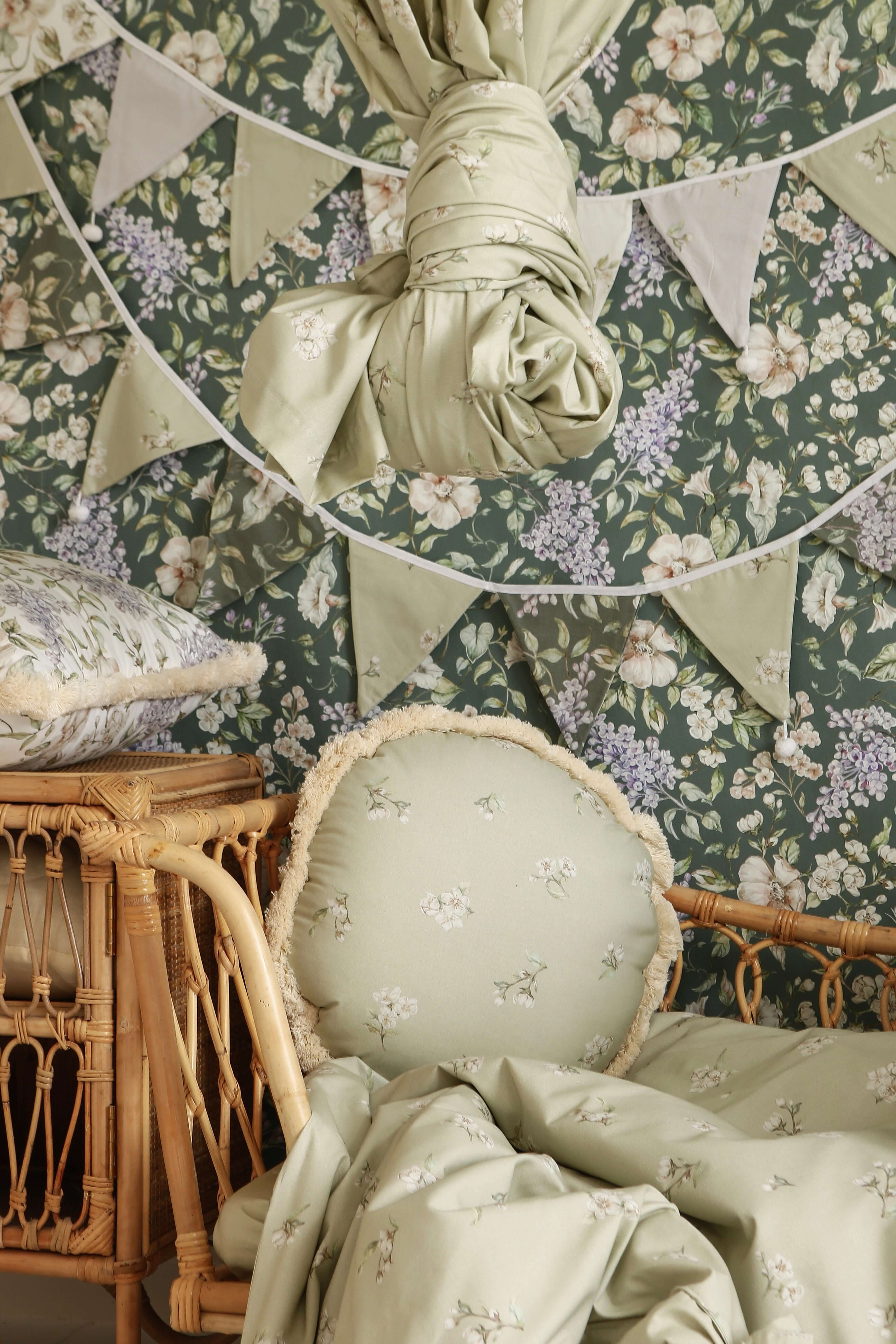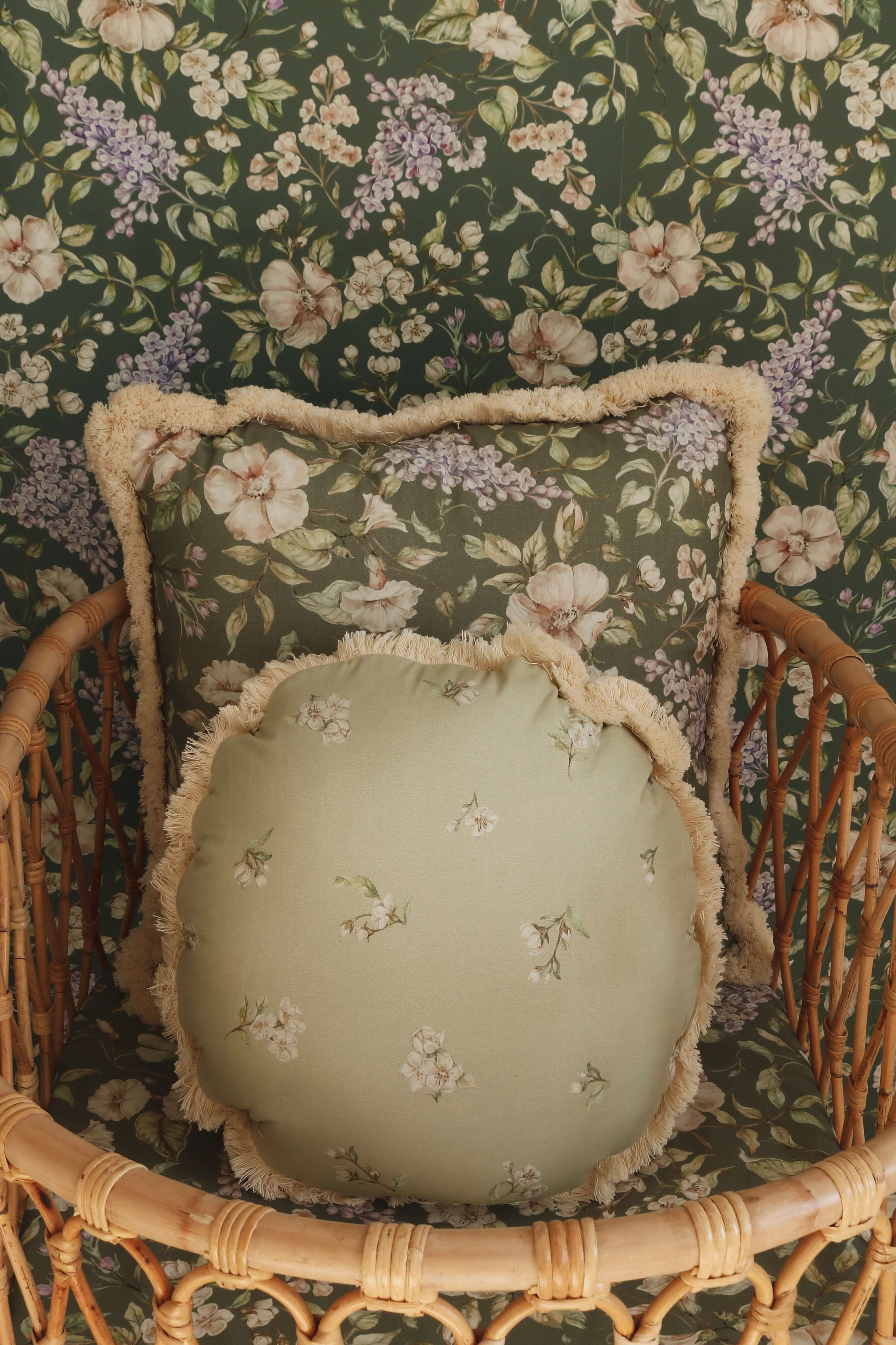 Gorgeous green round flowers pillow with ecru fringes. Size – diameter 40 cm You can combine different pillows to discover better results. Washing instruction:Machine wash in 40 degrees, dry flat Processing time: 1-3 work days