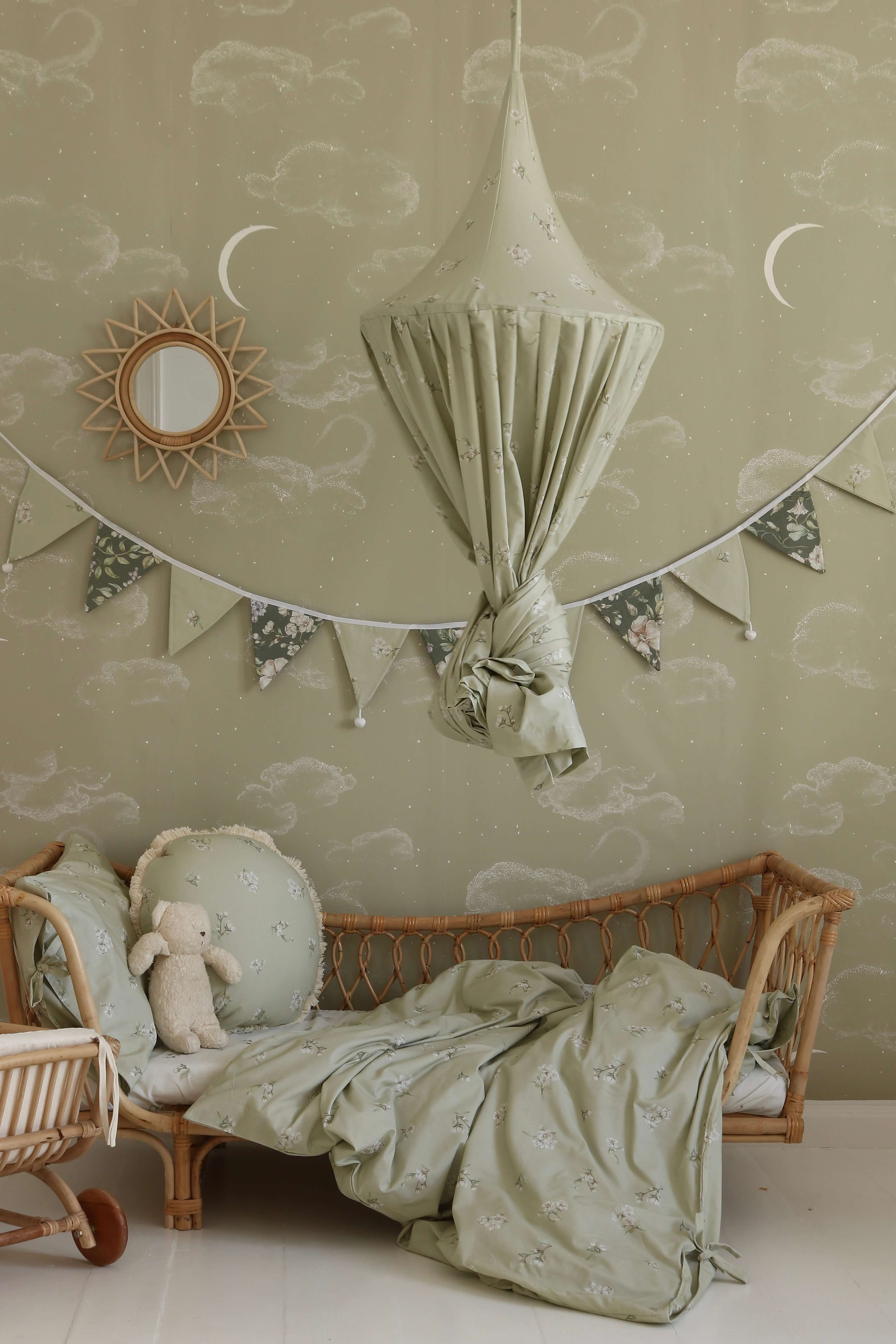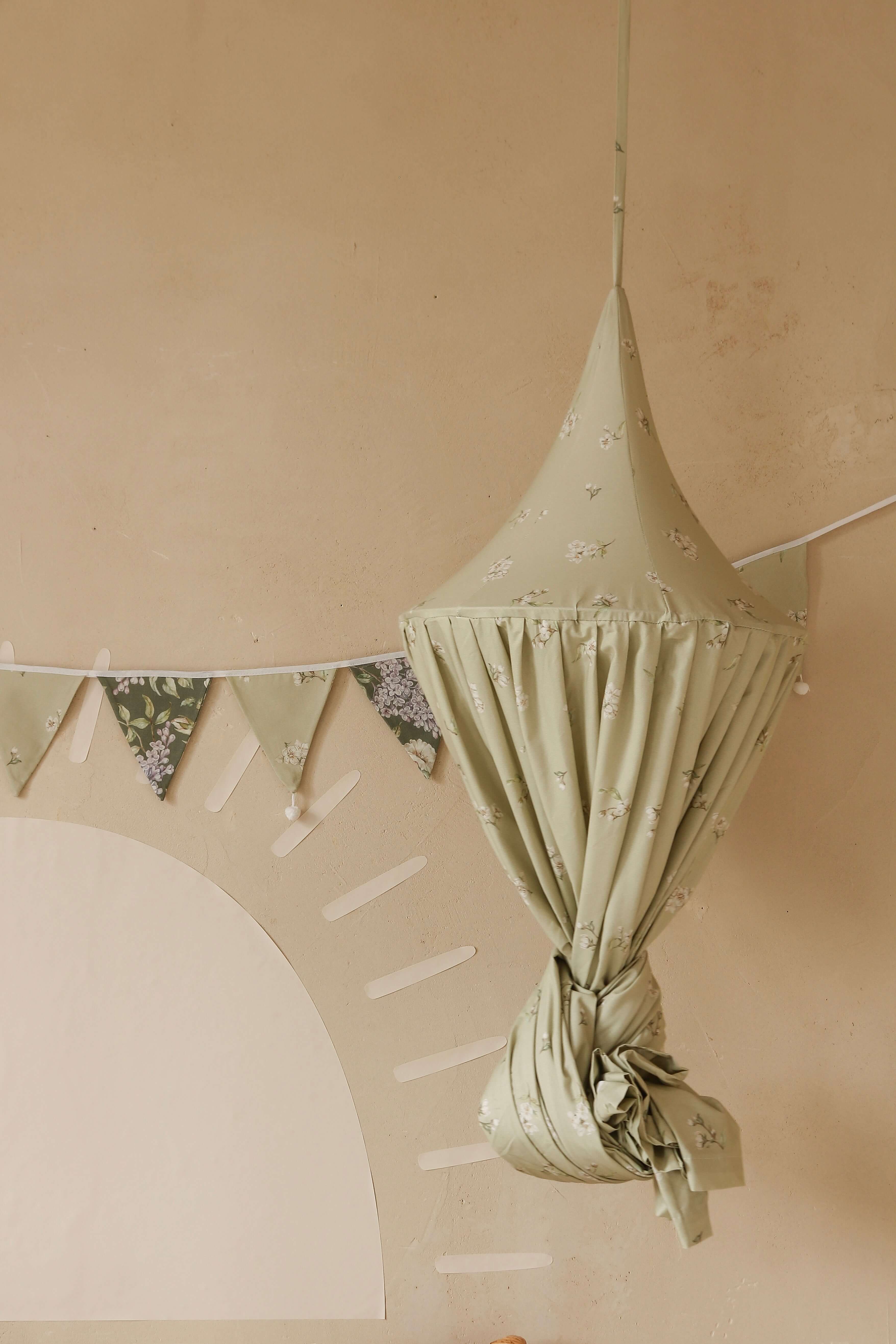 Add a fresh, floral touch to your child’s room with our Apple Blossoms on Light Green canopy – handcrafted from soft, breathable cotton with a charming print of delicate white apple blossoms on a soft green background. This canopy gently filters the light, creating a cozy, peaceful atmosphere perfect for rest, reading or imaginative play. Ideal for hanging above a crib, toddler bed or play corner, it brings a gentle springtime feeling to any nursery – perfect for boho, vintage or botanical interiors. Easy to hang, washable, and designed with care in the Netherlands. Product details: Fabric: 100% cotton (OEKO-TEX® certified) Print: White apple blossoms on light green background Height: approx. 235 cm (fabric) + 60 cm hanging ties Hoop diameter: 50 cm (metal ring included, hidden inside) Interior loop: For hanging mobile, pendant or lights Mounting: Two cotton straps – fits any ceiling hook Care: Remove hoop before washing. Machine wash at 30°C (gentle cycle), air dry Handmade in the Netherlands by Matuu Preparation time: 2–3 business days Perfect for: Baby or toddler bed canopy Floral or nature-inspired nursery Soft spring-themed decor Handmade baby shower gift