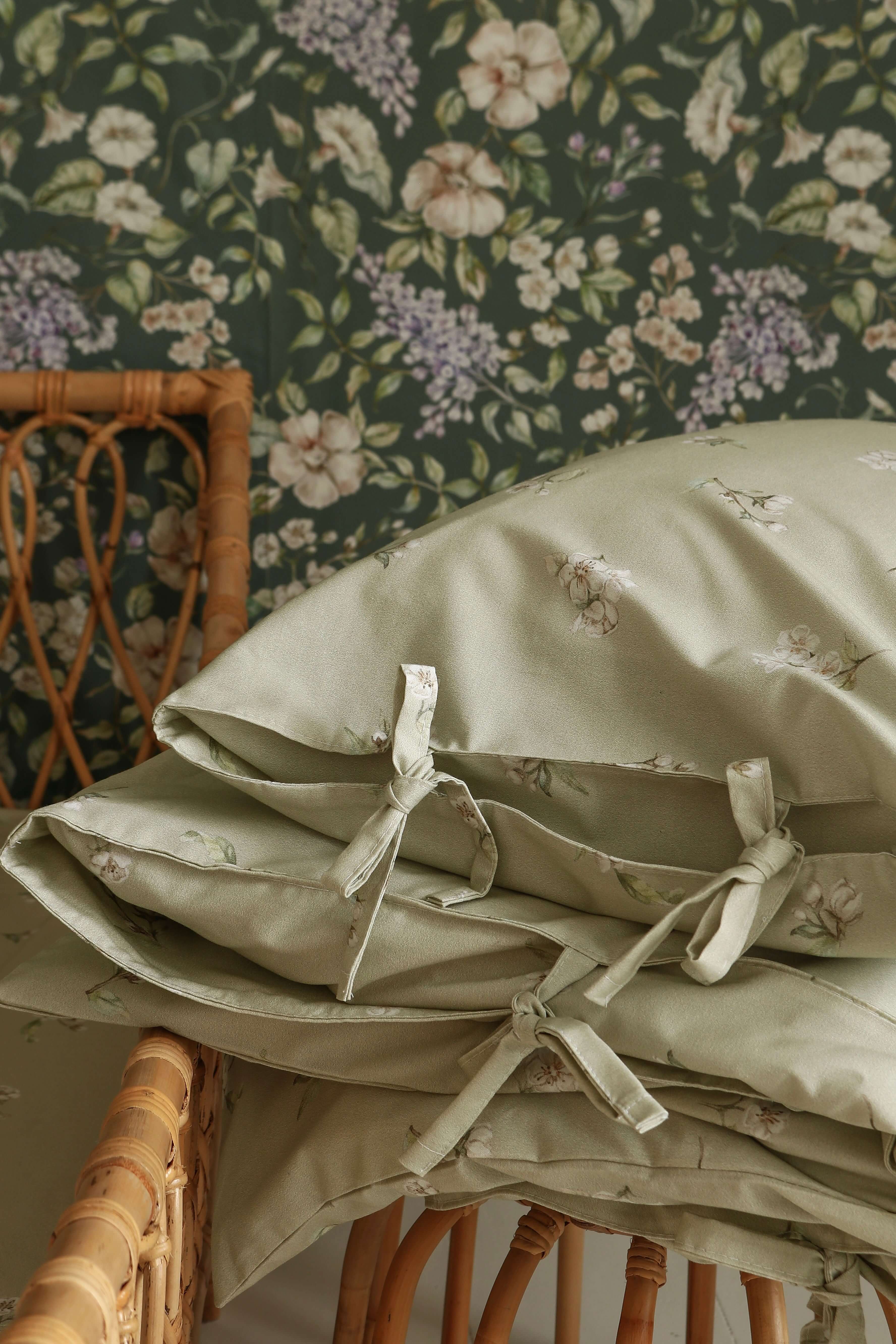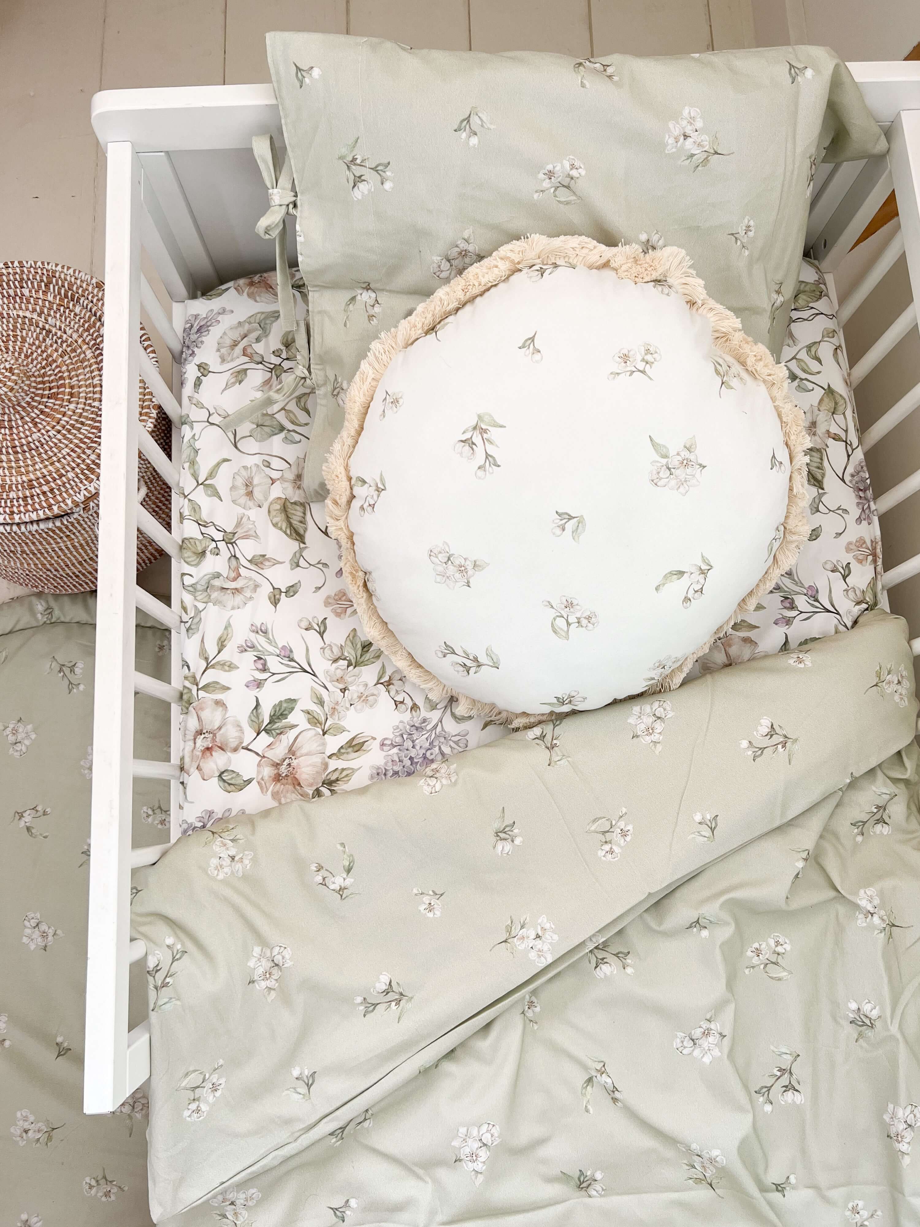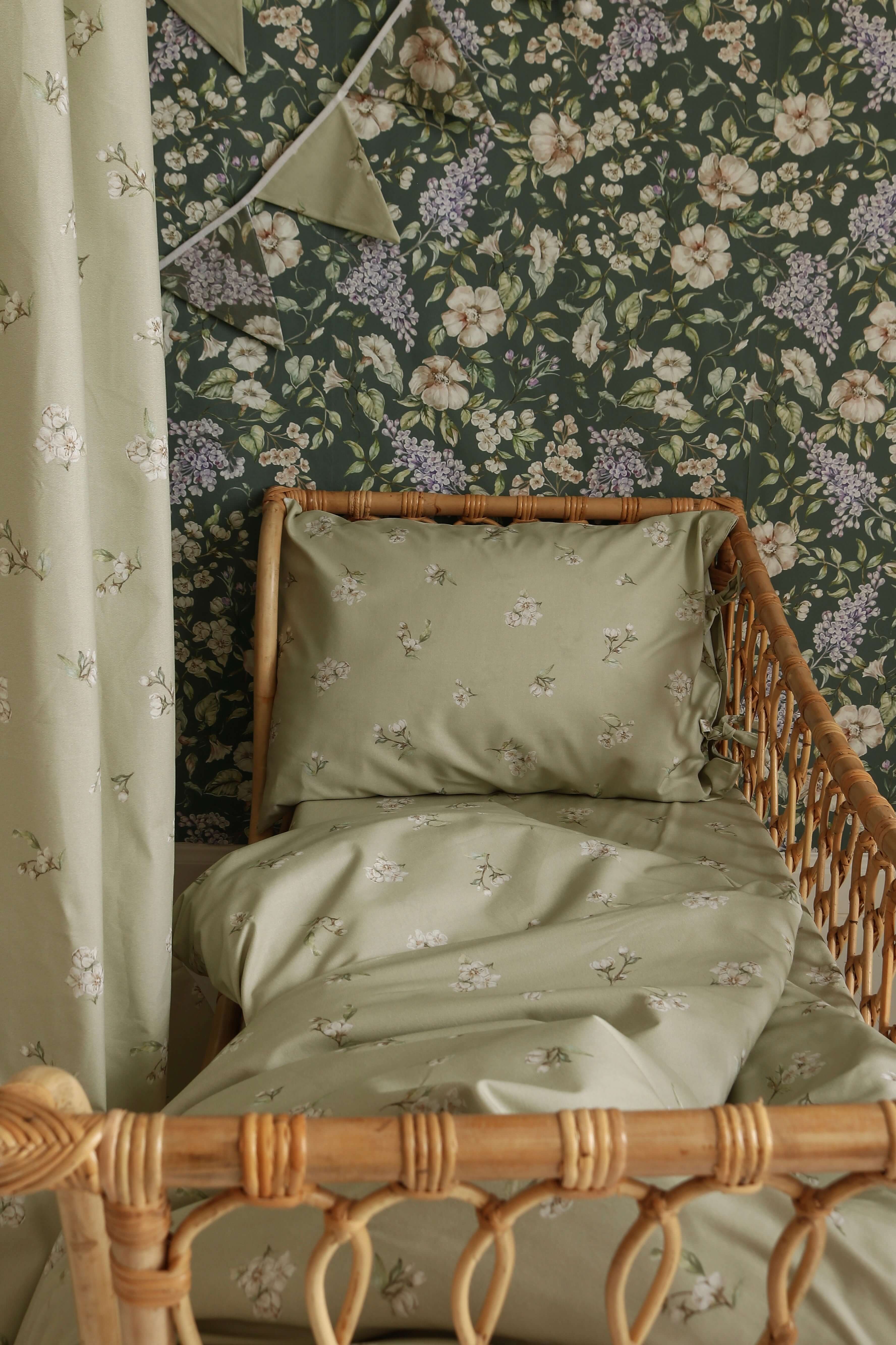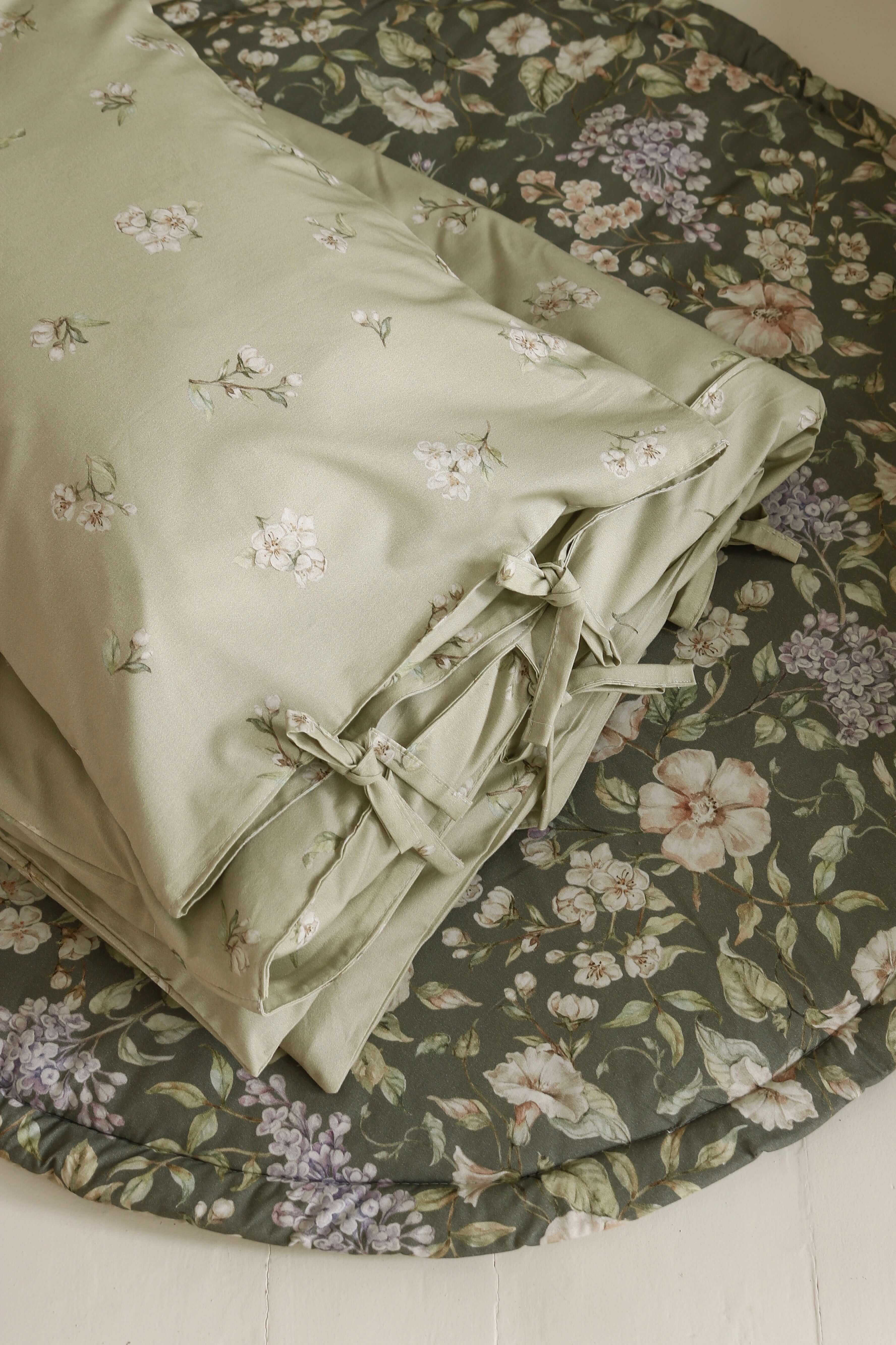Bring freshness and natural charm into your interior with the Apple Blossoms on Light Green bedding set. Crafted from soft, breathable enzyme-washed cotton, this bedding has a naturally softened texture that feels gentle on the skin and ensures long-lasting comfort. The design features a delicate apple blossom print in white and soft beige tones, set against a calm light green background – a soothing combination perfect for nurseries, kids’ rooms, and even adult bedrooms. Its botanical style blends seamlessly with boho, vintage, or nature-inspired interiors. Each set includes a duvet cover and pillowcase, finished with cotton tie closures for an elegant and minimal look. Safe for sensitive skin and OEKO-TEX® certified, every piece is handmade in the Netherlands with care and attention to detail. Product Details Material: 100% enzyme-washed cotton – OEKO-TEX® certified Design: Light green background with delicate white and beige apple blossoms Closure: Cotton ties (no zippers or buttons) Set includes: 1 duvet cover + 1 pillowcase (all sizes) Sizes: Crib, toddler, junior, and single bed Care: Machine wash at 40 °C, gentle cycle; do not tumble dry; iron on low if needed Preparation time: 2–3 business days Handmade in the Netherlands by Matuu Perfect For Botanical and floral-themed nurseries Cozy toddler and kids’ rooms Neutral and nature-inspired bedrooms Parents looking for soft green accents Baby shower or birthday gifts