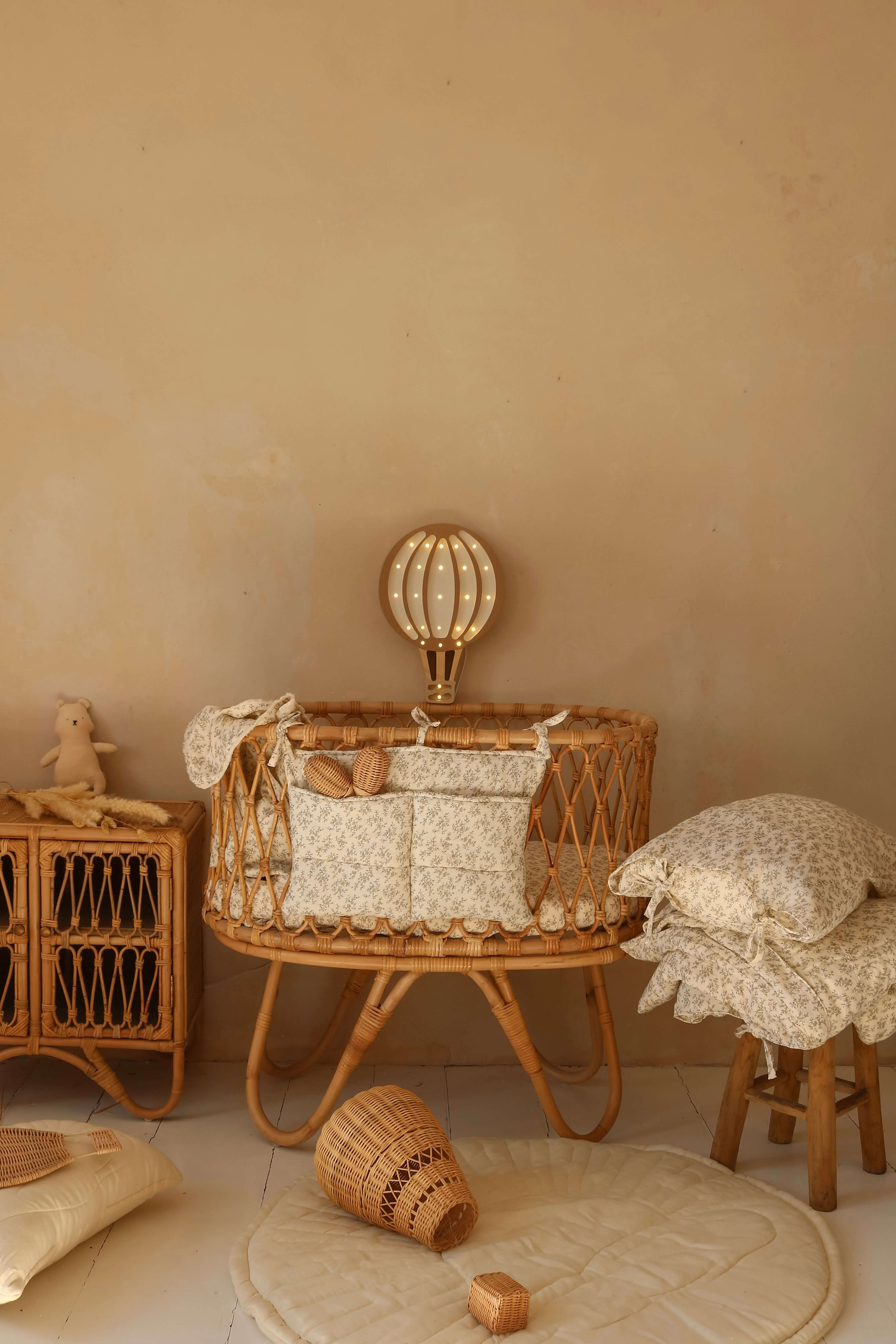 Add a soft, romantic touch to your child’s room with our Apple Blossoms on Lilac canopy – handmade from breathable, OEKO-TEX® certified cotton. The fabric features delicate white apple blossom sprigs scattered across a dusty lilac background, creating a gentle and soothing atmosphere. Hang it above a crib, toddler bed or play area to create a dreamy, protected space for sleep, reading or play. Its light cotton fabric filters sunlight softly, while the floral design adds a timeless charm to any boho, vintage or nature-inspired nursery. Easy to hang with cotton ties and designed with a built-in loop for adding a pendant, mobile or lights. A beautiful and thoughtful choice for parents who love calm, natural interiors. Product details: Fabric: 100% cotton (single layer), OEKO-TEX® certified Color/Print: Dusty lilac with tiny white apple blossoms Height: approx. 235 cm (fabric) + 60 cm cotton hanging ties Ring diameter: 50 cm (metal hoop included, hidden inside) Mounting: Two cotton ties – fits any ceiling hook Interior loop: For pendant, mobile or fairy lights Care: Remove hoop before washing. Machine wash at 30°C (gentle), air dry Preparation time: 2–3 business days Handmade in the Netherlands by Matuu Perfect for: Crib or toddler bed canopy Floral, boho or soft-gender-neutral nursery Lilac or spring-inspired baby rooms Thoughtful baby shower gift