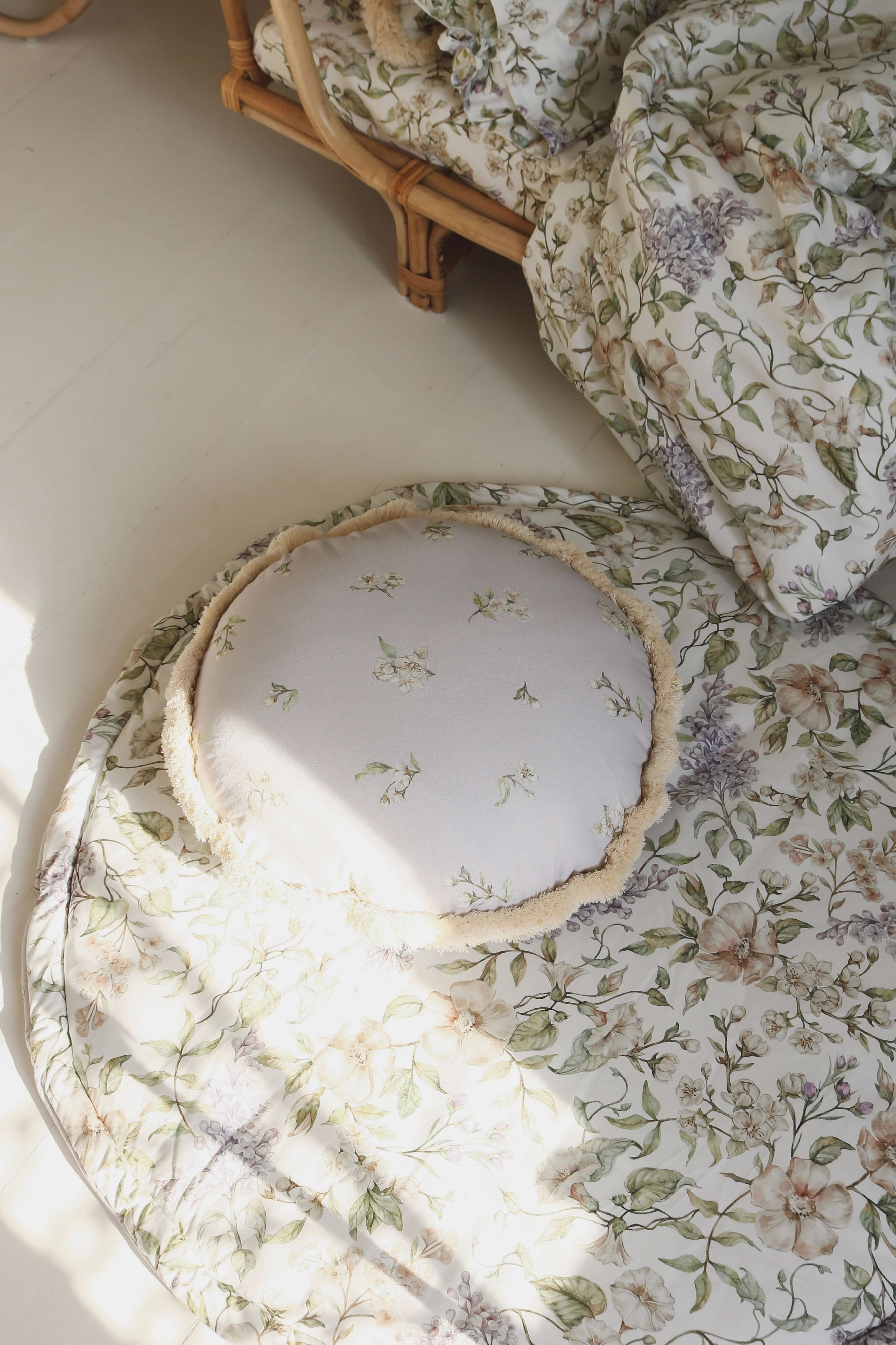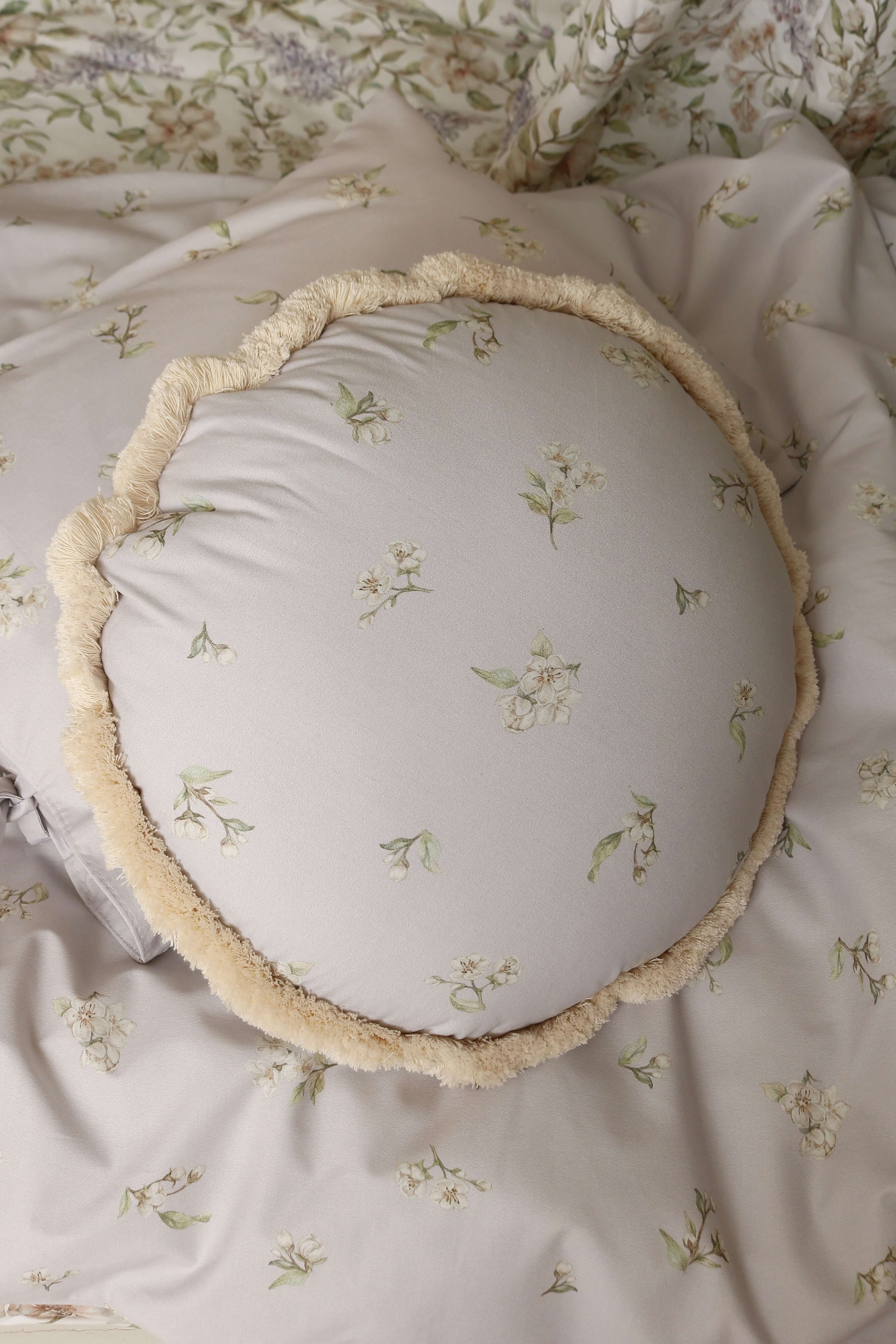 | Product Type | Round decorative cushion with fringed trim and floral pattern |