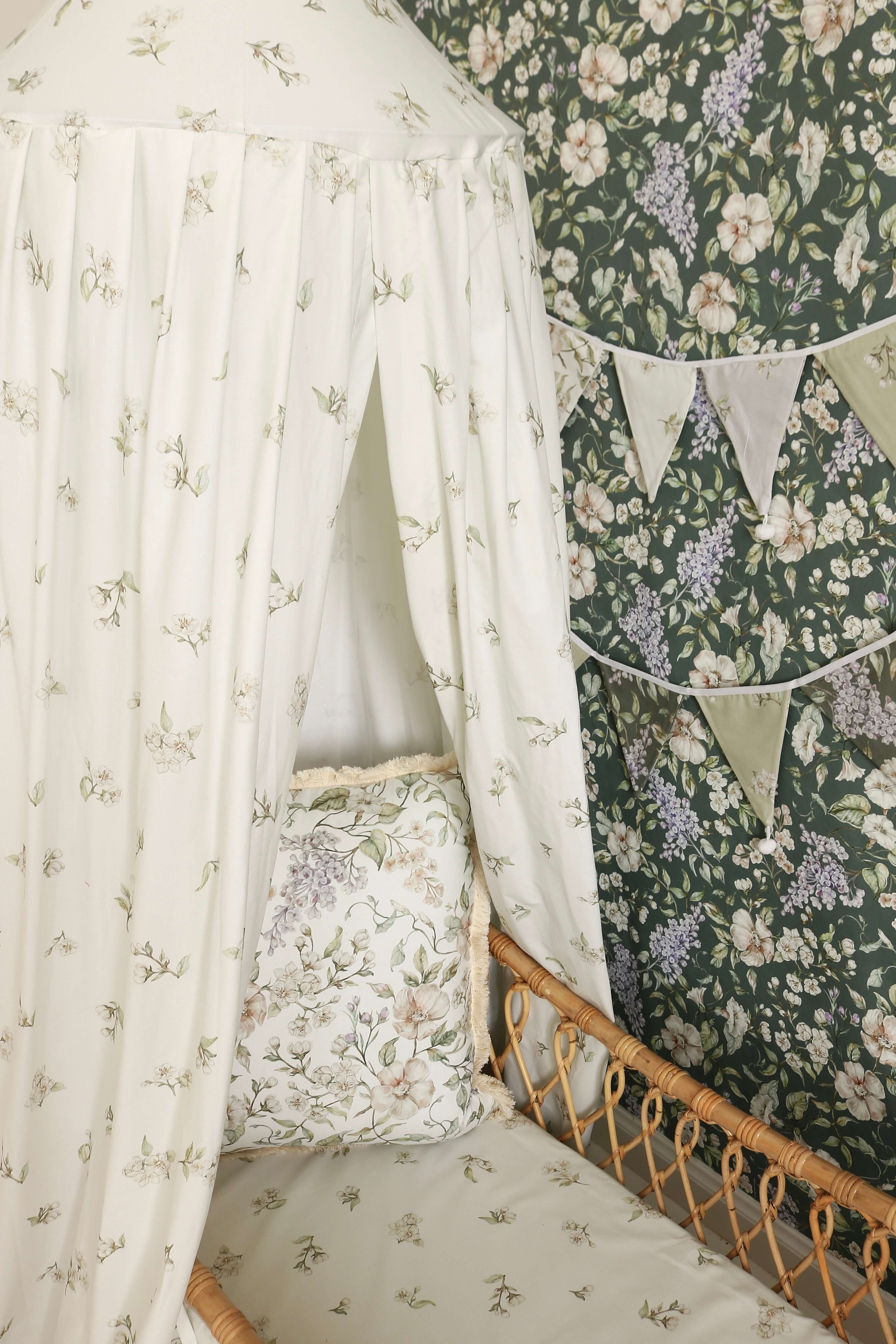 Bring timeless charm and gentle elegance to your nursery with our Apple Blossoms on White canopy. Handcrafted from breathable, OEKO-TEX® certified cotton, this delicate canopy features a romantic print of tiny white apple blossoms scattered across a crisp white background – fresh, airy, and perfect for spring-inspired interiors. Ideal for hanging above a crib, toddler bed, or cozy play corner, the canopy softly filters the light, creating a soothing and dreamy space. Its calm color palette fits beautifully with Scandinavian, floral, boho, or nature-inspired rooms. Easy to install and care for – with cotton ties, a hidden metal hoop, and a built-in interior loop for hanging decor or lights. Product details: Fabric: 100% cotton (single layer), OEKO-TEX® certified Print: Tiny white apple blossoms on a white background Height: approx. 235 cm (fabric) + 60 cm cotton hanging ties Ring diameter: 50 cm (metal hoop included, hidden inside) Mounting: Two fabric ties – fits any ceiling hook Interior loop: For pendant, mobile or fairy lights Care: Remove hoop before washing. Machine wash at 30°C (gentle cycle), air dry Preparation time: 2–3 business days Handmade in the Netherlands by Matuu Perfect for: Crib or toddler bed canopy Spring-themed or botanical nursery decor Neutral or floral baby rooms Thoughtful handmade baby shower gift