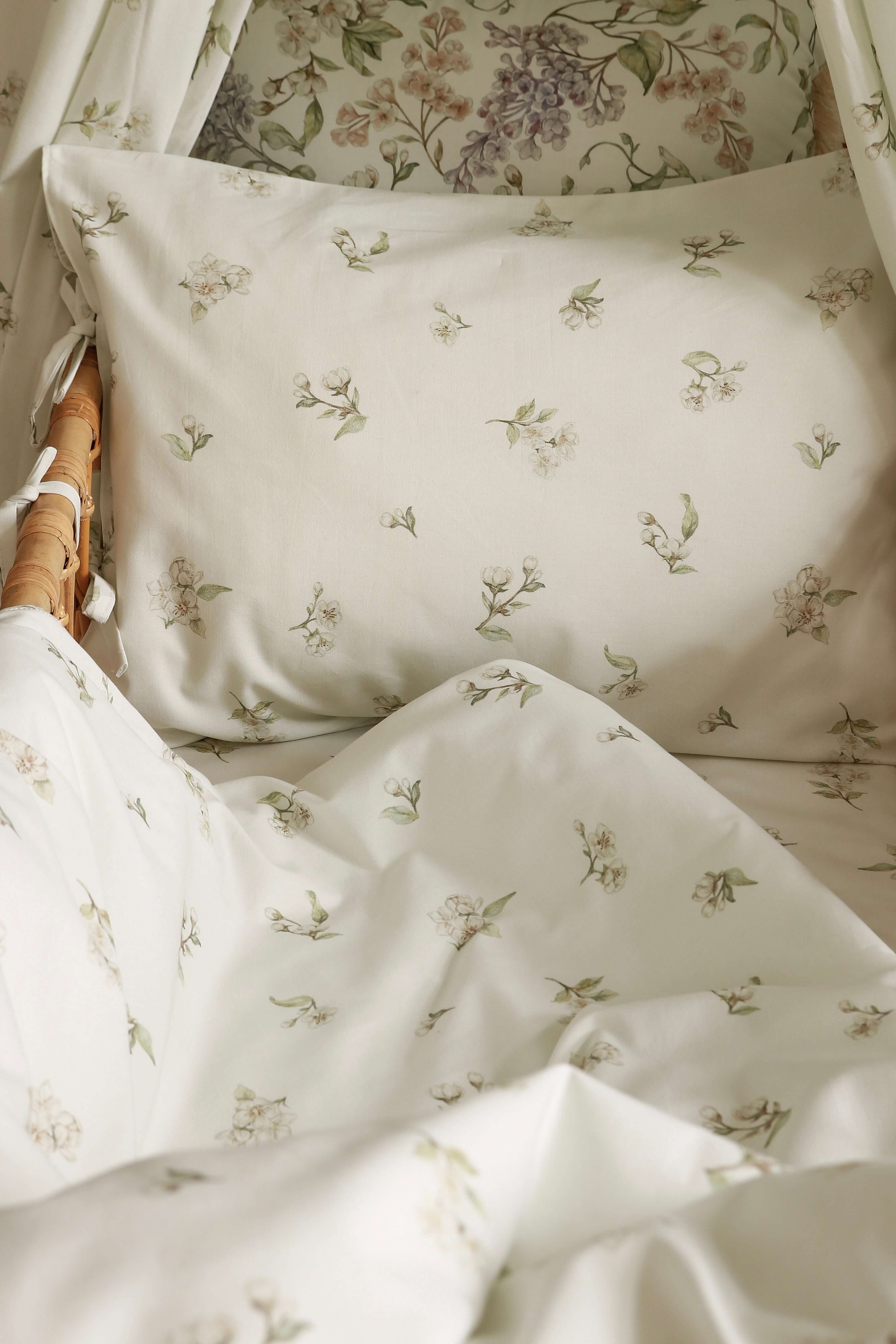 Bring the fresh beauty of spring into your home with the Apple Blossoms on White bedding set. Crafted from soft, breathable enzyme-washed cotton, this set combines natural comfort with a delicate floral design. The bedding features a crisp white background adorned with hand-painted apple blossom branches in soft beige, warm brown, and gentle green tones. The light and timeless palette makes it perfect for boho, vintage, or nature-inspired nurseries, kids’ rooms, and adult interiors. Each set includes a duvet cover and pillowcase, secured with cotton tie closures for a minimal, handmade finish. OEKO-TEX® certified and handmade in the Netherlands, it’s both safe for sensitive skin and made to last. Product Details Material: 100% enzyme-washed cotton – OEKO-TEX® certified Design: White base with beige blossoms, warm brown centers, and soft green branches Closure: Cotton ties (no zippers or buttons) Set includes: 1 duvet cover + 1 pillowcase (all sizes) Sizes: Crib, toddler, junior, and single bed Care: Machine wash at 40 °C, gentle cycle; do not tumble dry; iron on low if needed Preparation time: 2–3 business days Handmade in the Netherlands by Matuu Perfect For Parents who love fresh and light floral designs Boho, vintage, or nature-inspired nurseries Cozy toddler and kids’ rooms Gender-neutral bedrooms A thoughtful baby shower, birthday, or holiday gift