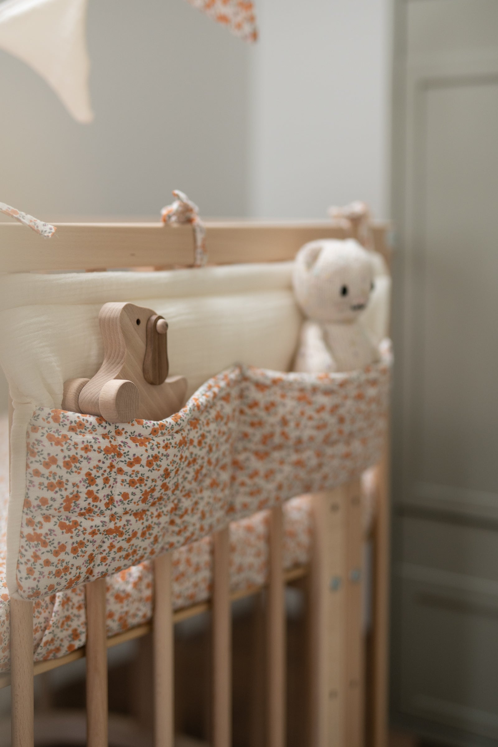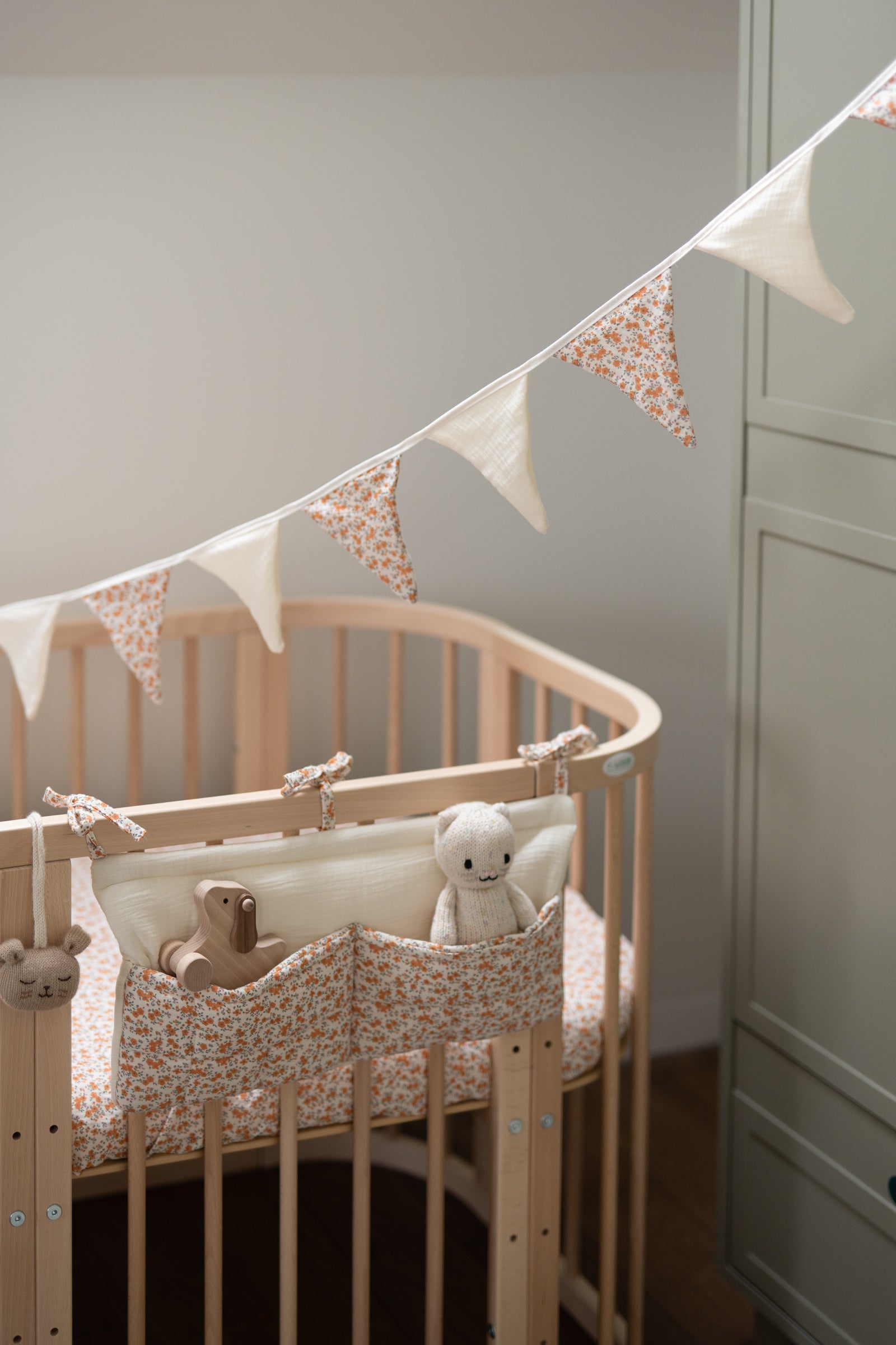 Keep your baby’s crib tidy and charming with our Autumn Meadow crib organizer – a sweet and practical solution for nursery storage. Made from soft cotton muslin, this bed pocket features a delicate floral print in warm autumn tones, perfect for adding a gentle, vintage-inspired accent to your baby’s space. Designed with two spacious front pockets, it’s perfect for keeping small items like pacifiers, teethers, wipes or a favorite toy close at hand. Easy to tie onto any crib or playpen. Product features: • Dimensions: 50 x 32 cm • Fabric: 100% cotton muslin – soft, lightweight and breathable • Color: Cream base with small orange floral print • Machine washable at 40°C • Handmade with love in the Netherlands by Roksana (Matuu) • Production time: 2–3 business days Need a custom size? Just send a message – we’re happy to help!