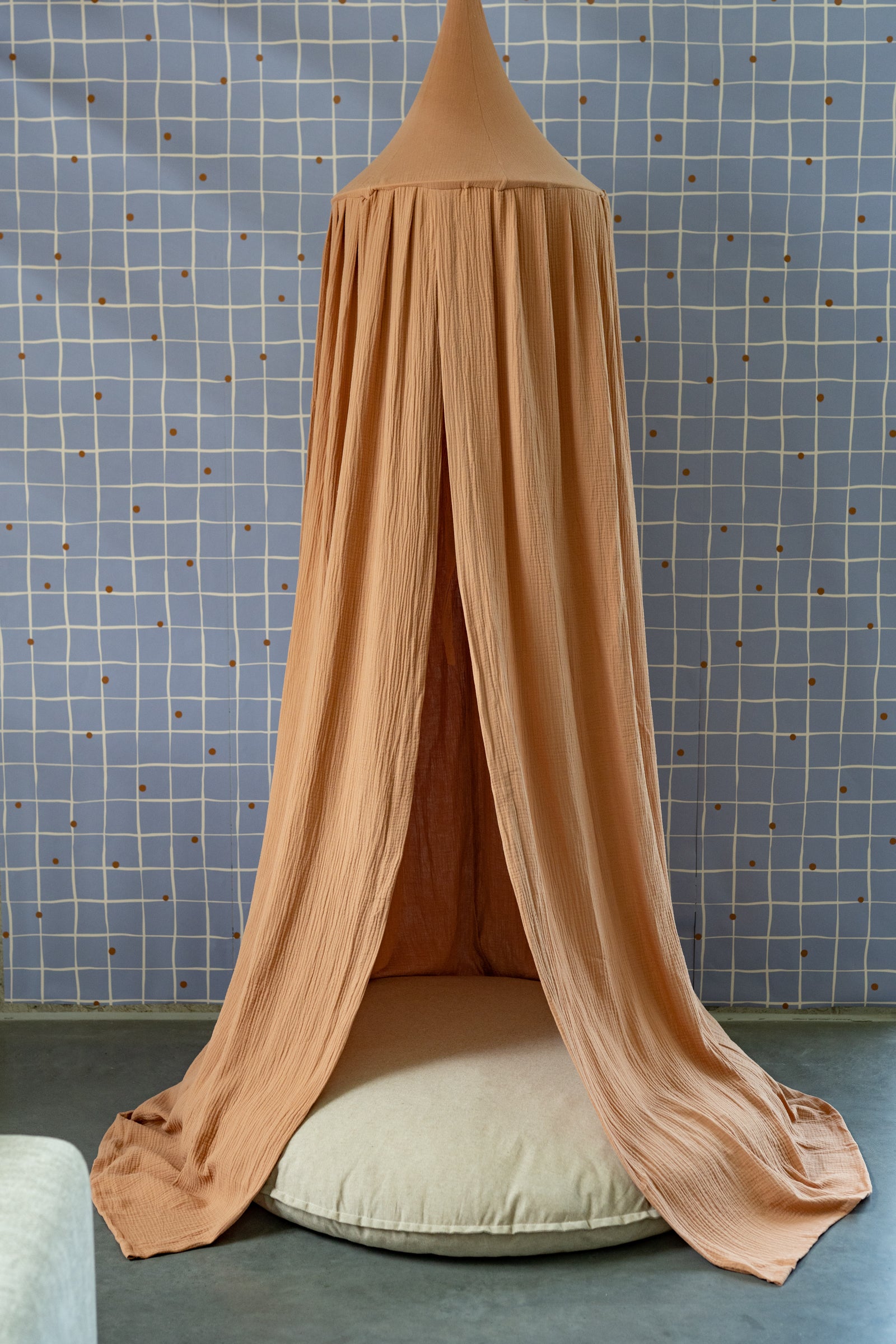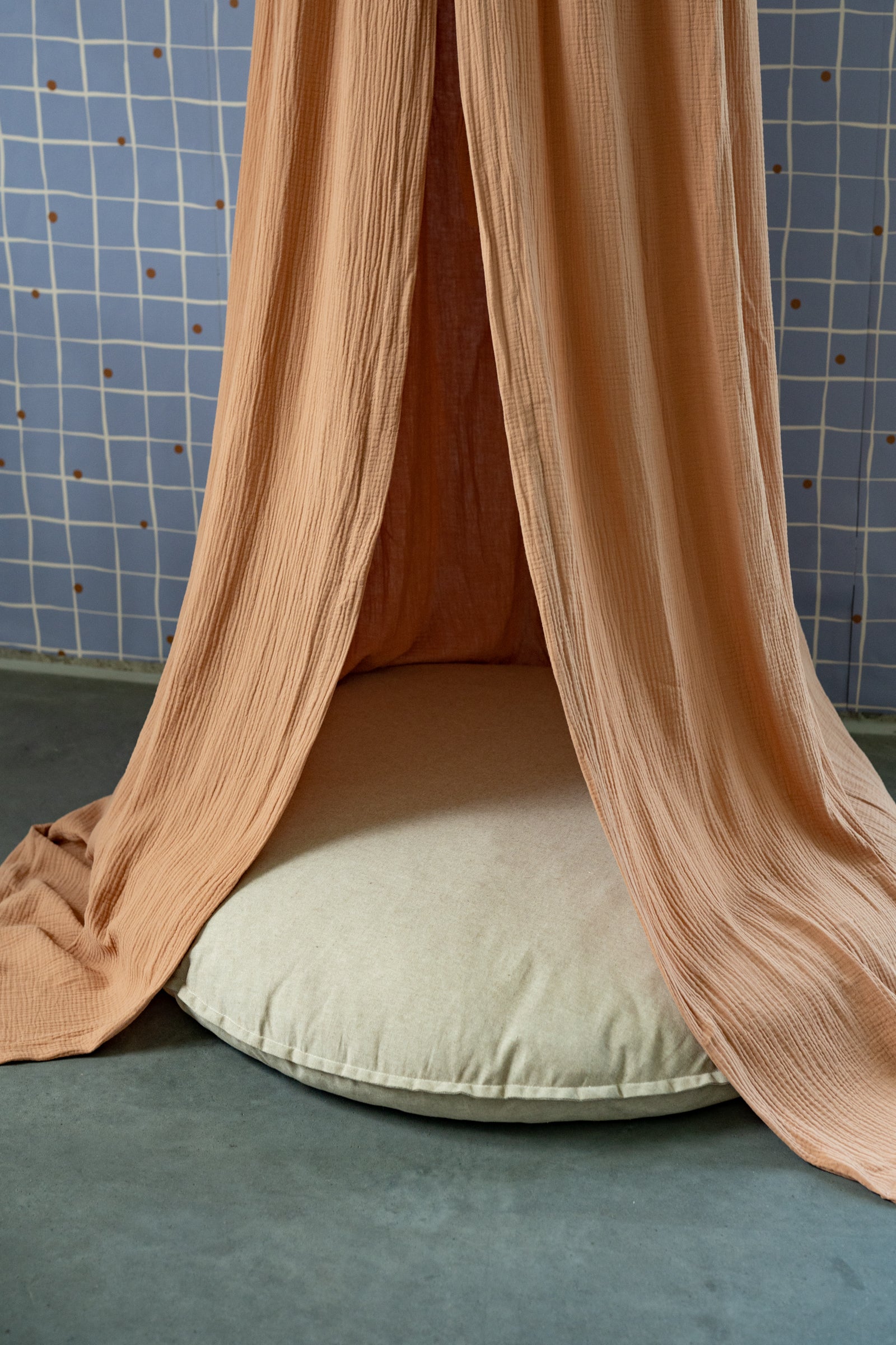 Create a calm and timeless space for your little one with our Beige Dune canopy โ a soft, lightweight canopy made from 100% breathable muslin cotton. With its warm, sandy-beige tone and natural texture, it softly filters the light, bringing a peaceful, cozy feeling to any nursery. Perfect for hanging above a crib, toddler bed, reading nook, or play mat, this canopy adds a gentle touch of boho or neutral style. Whether youโre decorating a baby girlโs room, a boyโs room, or a gender-neutral space, the subtle color blends beautifully with any interior. Handmade in the Netherlands with care and attention to detail. Includes a sturdy hidden hoop and long cotton ties for easy hanging and removal. Safe, sustainable, and designed to grow with your child. Product Details: Fabric: 100% cotton muslin (OEKO-TEXยฎ certified) Color: Beige Dune โ warm neutral Height: approx. 235 cm + 60 cm cotton ties Hoop diameter: 50 cm (metal hoop included, hidden inside) Mounting: Two cotton ties โ fits any ceiling hook Interior loop: For pendant, mobile or fairy lights Washing: Remove hoop before washing. Machine wash at 30ยฐC (gentle cycle), air dry Processing time: 2โ3 next business days Handmade in the Netherlands by Matuu Perfect for: Baby bed canopy or crib drape Cozy reading or play nook Minimal, boho or Scandinavian nursery Handmade and thoughtful baby shower gift