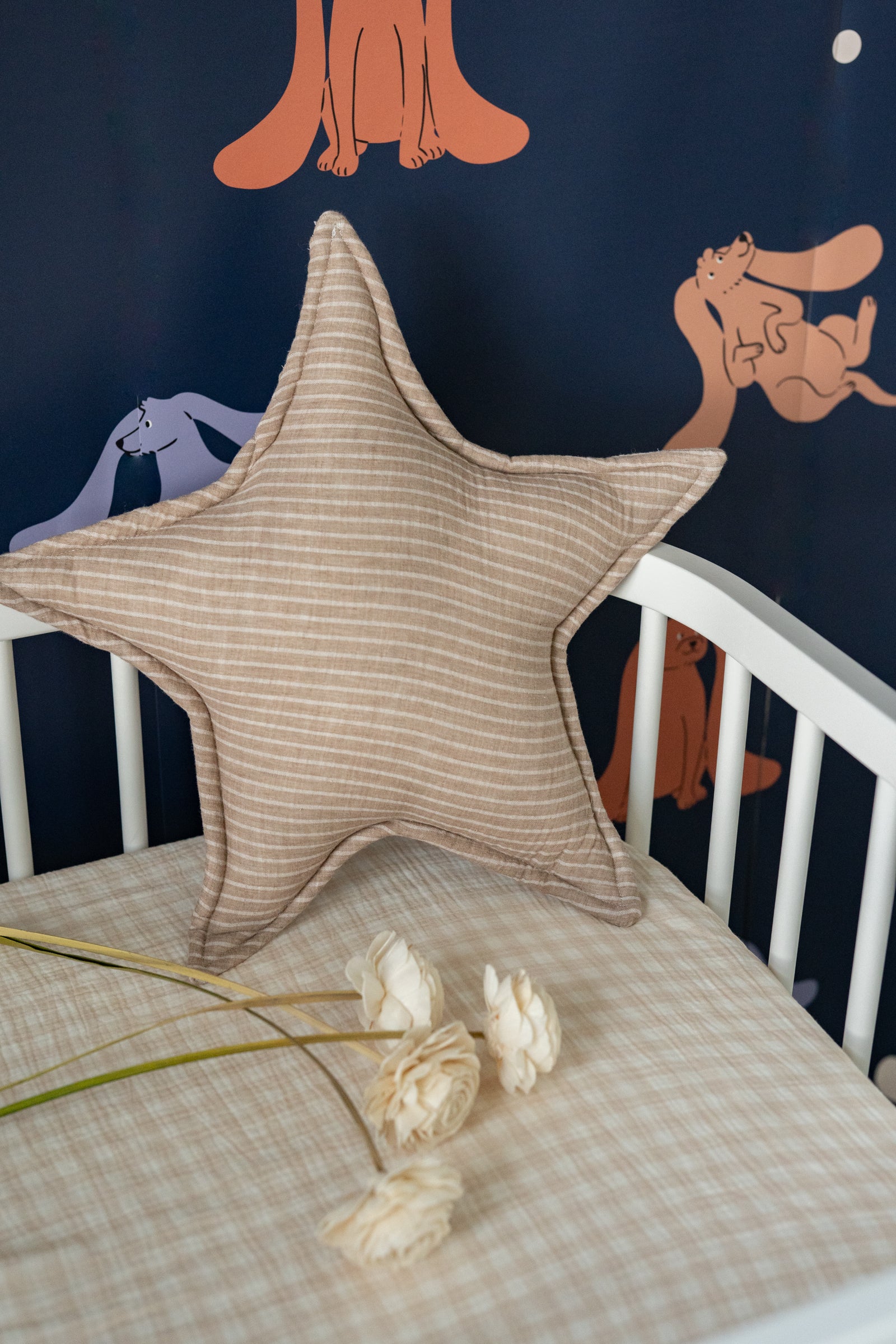 Add a soft and stylish accent to your child’s room with the Beige Fine Stripes star pillow. Handcrafted from breathable muslin cotton, this star-shaped cushion features a timeless beige background with fine brownish stripes, blending beautifully with neutral, boho, Scandinavian, or Japandi-inspired interiors. Perfect as a decorative element in a crib, toddler bed, or reading nook – or as a cozy cuddly pillow for your little one. The OEKO-TEX® certified muslin fabric is soft, safe, and gentle on sensitive skin, making it both practical and beautiful. This versatile pillow also makes a thoughtful baby shower or birthday gift, designed to bring warmth and charm to any nursery or kids’ room. Product Details • Shape: Star • Size: approx. 40 × 40 cm • Fabric: 100% muslin cotton – OEKO-TEX® certified • Color: Beige with fine brownish stripes • Care: Machine washable at 30°C, gentle cycle • Preparation time: 2–3 business days • Origin: Handmade with care in the Netherlands Perfect As • Nursery or kids’ room decor • Soft pillow for crib, toddler bed, or reading nook • Gender-neutral baby gift • Cozy cuddle pillow for little ones • Matching with Beige Fine Stripes bedding and canopy