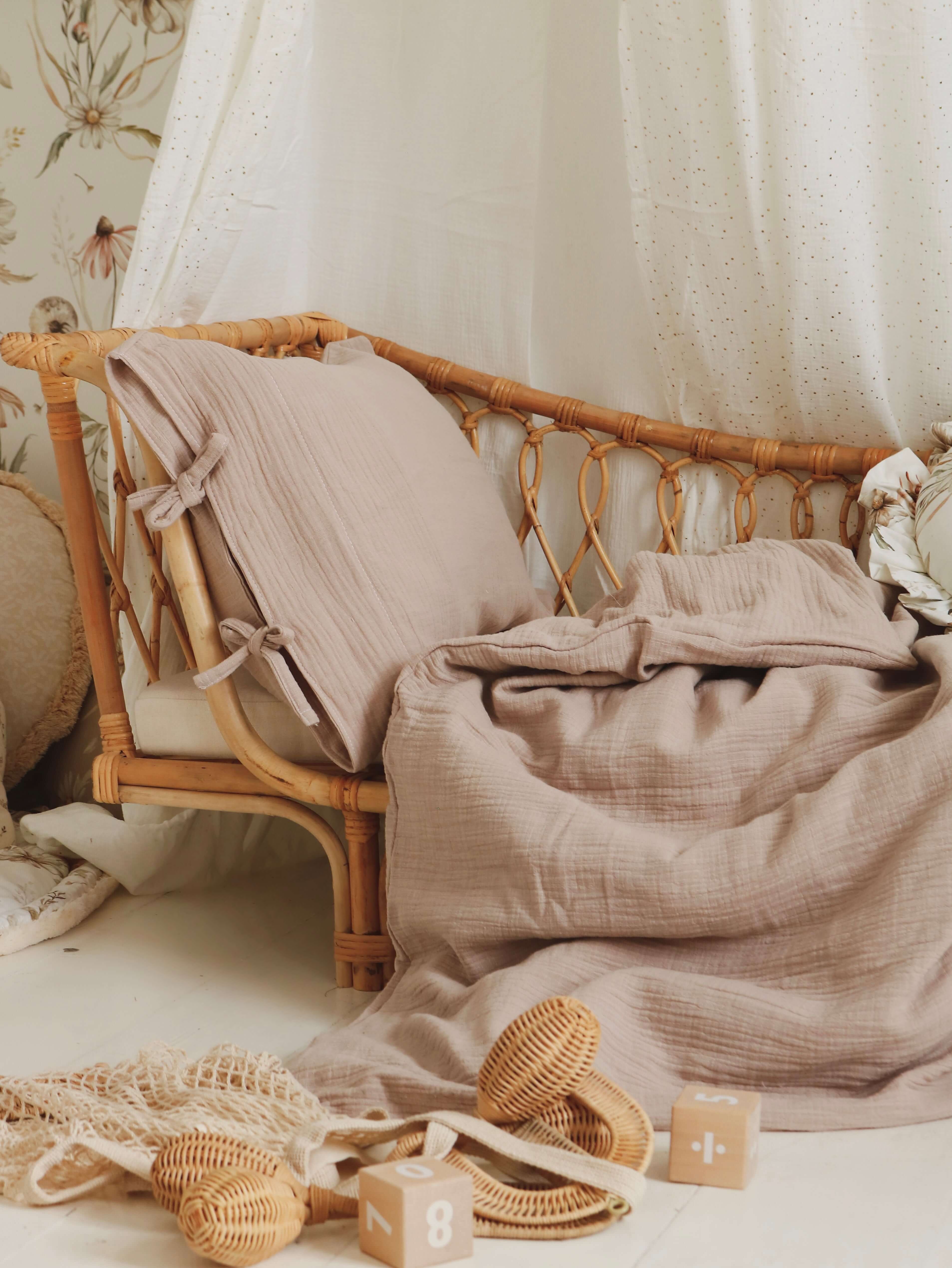 Create a cozy, timeless atmosphere in your child’s room with the Beige Muslin Linen Look bedding set. Made from soft, breathable muslin cotton, this set mimics the natural, textured look of linen while remaining lightweight and gentle on the skin. The neutral beige shade adds warmth and blends seamlessly with boho, vintage, and Scandinavian-inspired interiors. Each bedding set includes a duvet cover and pillowcase, finished with cotton tie closures instead of zippers or buttons – a subtle detail that enhances the handcrafted feel. The fabric is OEKO-TEX® certified, ensuring safety even for the most sensitive skin. Carefully handmade in the Netherlands, it combines artisanal quality with everyday practicality. Product Details Material: 100% muslin cotton – linen look – OEKO-TEX® certified Color: Neutral beige with soft linen texture Closure: Cotton ties (no zippers or buttons) Set includes: 1 duvet cover + 1 pillowcase (all sizes) Sizes: Crib, toddler, junior, and single bed (also suitable for adults in single size) Care: Machine wash at 40°C, gentle cycle; do not tumble dry; iron on low if needed Preparation time: 2–3 business days Handmade in the Netherlands by Matuu  Perfect For Parents looking for neutral, calming nursery essentials Boho, Scandinavian, or vintage-inspired interiors Cozy toddler and kids’ bedrooms Matching with beige, natural wood, or earthy-toned accessories Baby shower or birthday gifts
