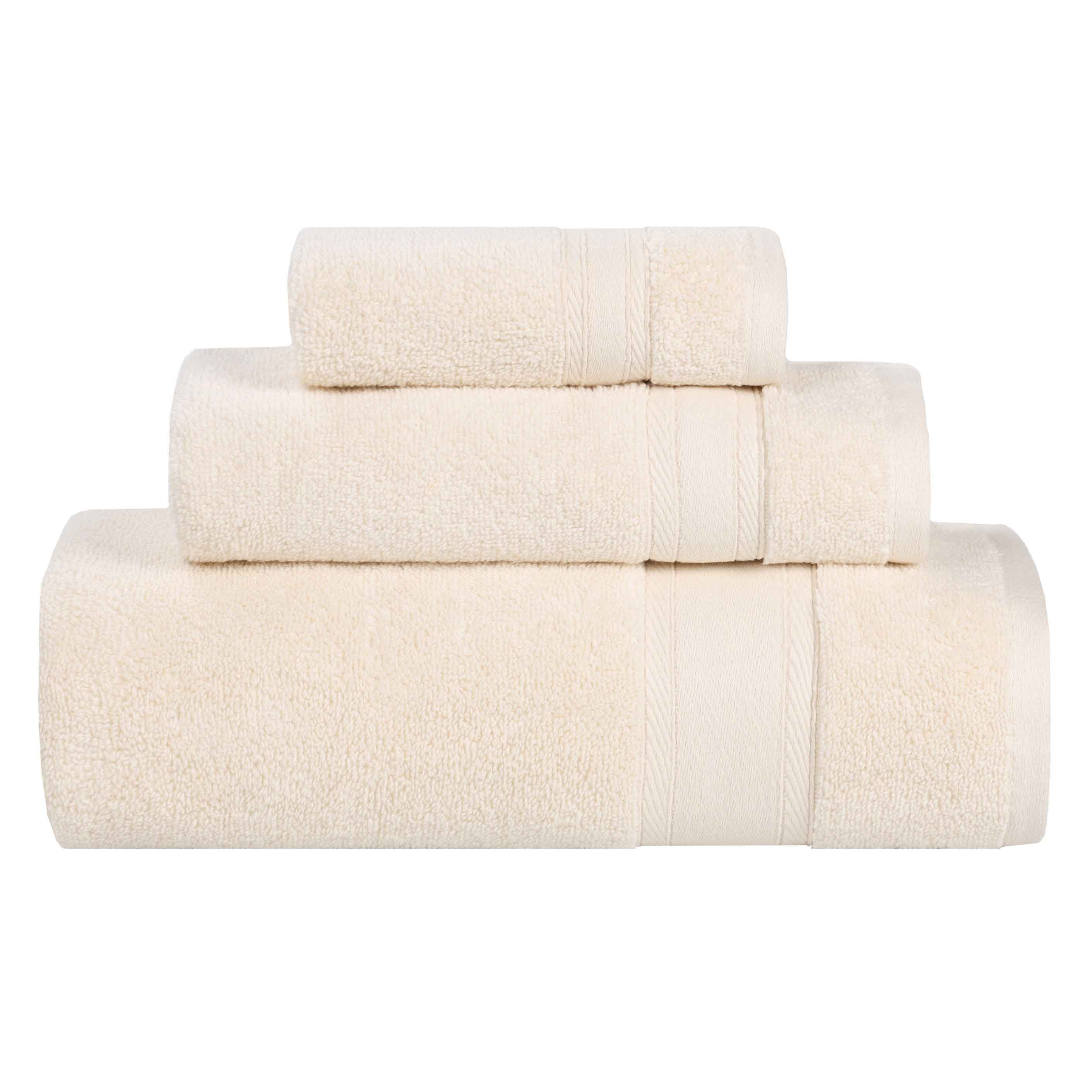 This is a set of 3 towels crafted from 100% cotton. The towels feature a simple design with decorative stitched borders, adding a touch of elegance. They come in a variety of solid colors and have a thick, plush terry – cloth texture, making them both absorbent and durable.