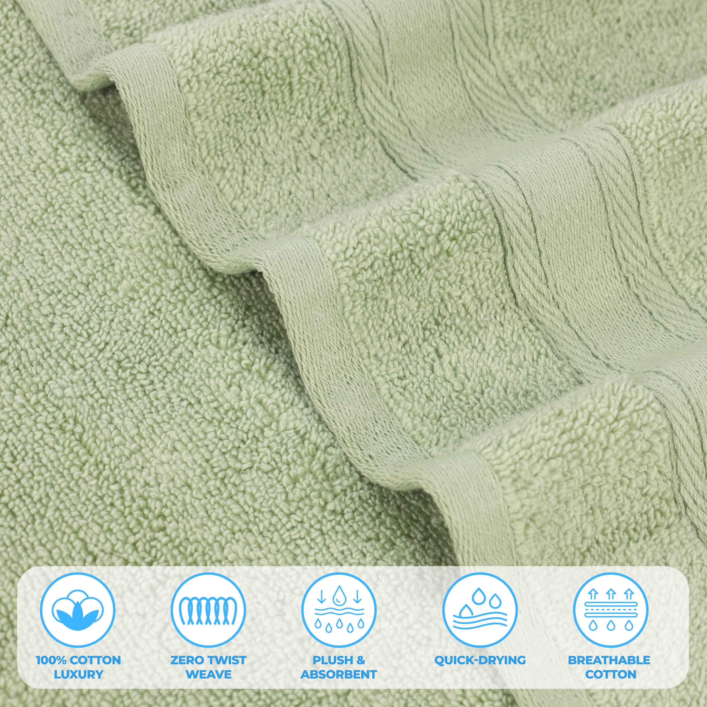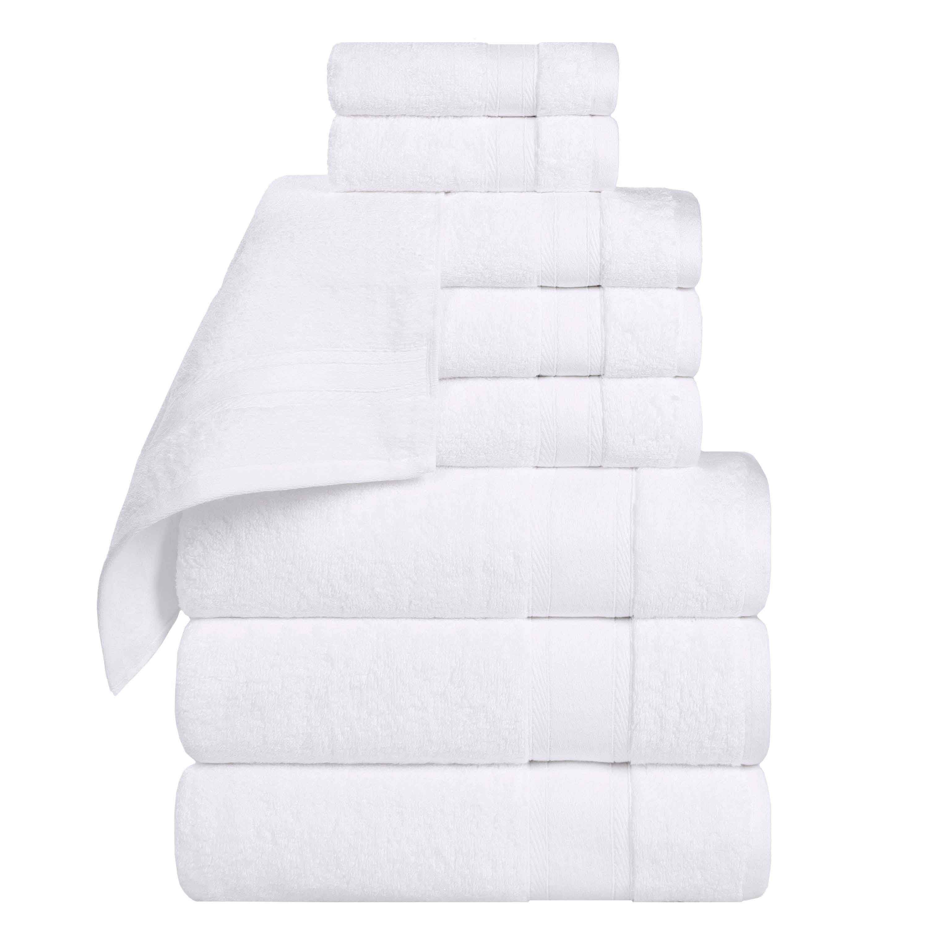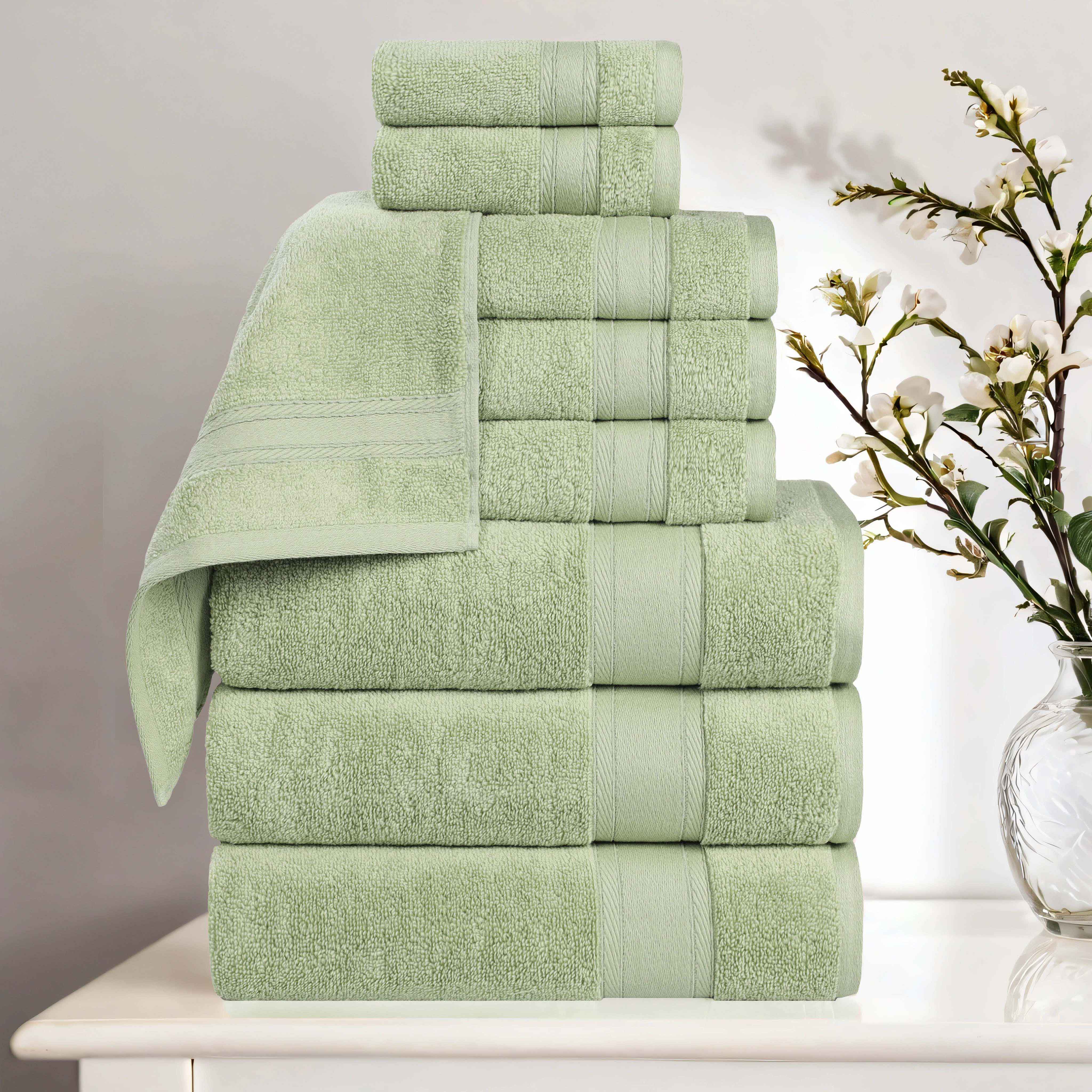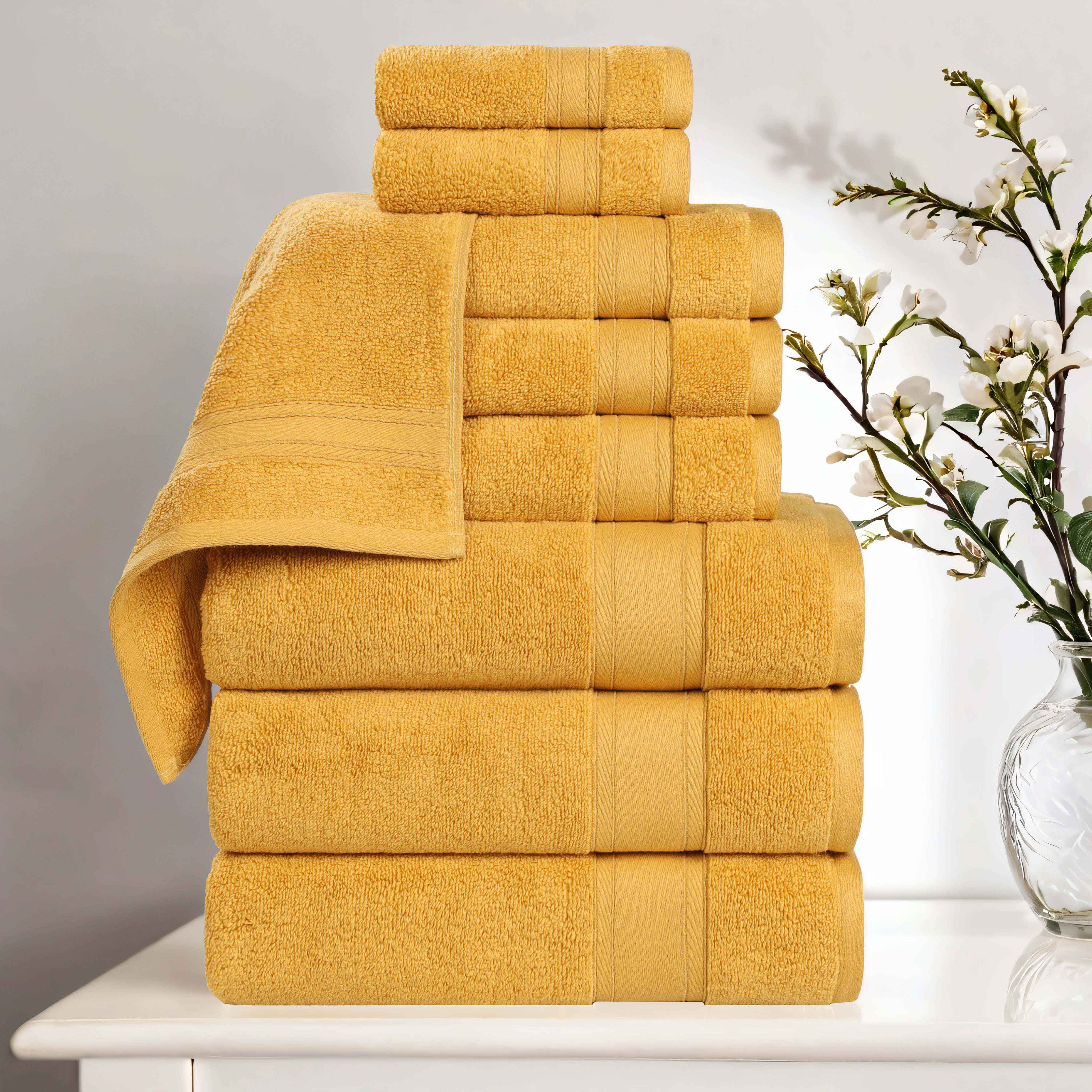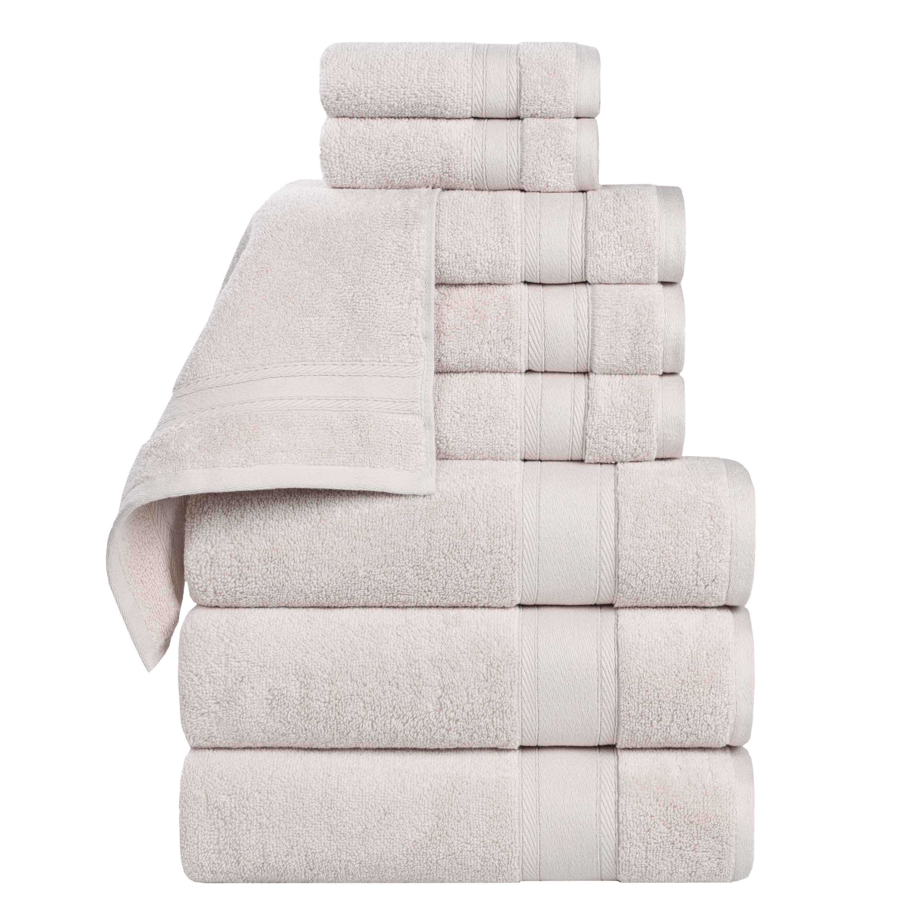 This is a 9-piece towel set designed for personal hygiene in bathrooms. Made of 100% cotton with a zero-twist weave, it offers a soft and plush texture. The towels come in various colors like gold, green, ivory, silver, and white, and feature thick, contrasting borders for both style and durability.