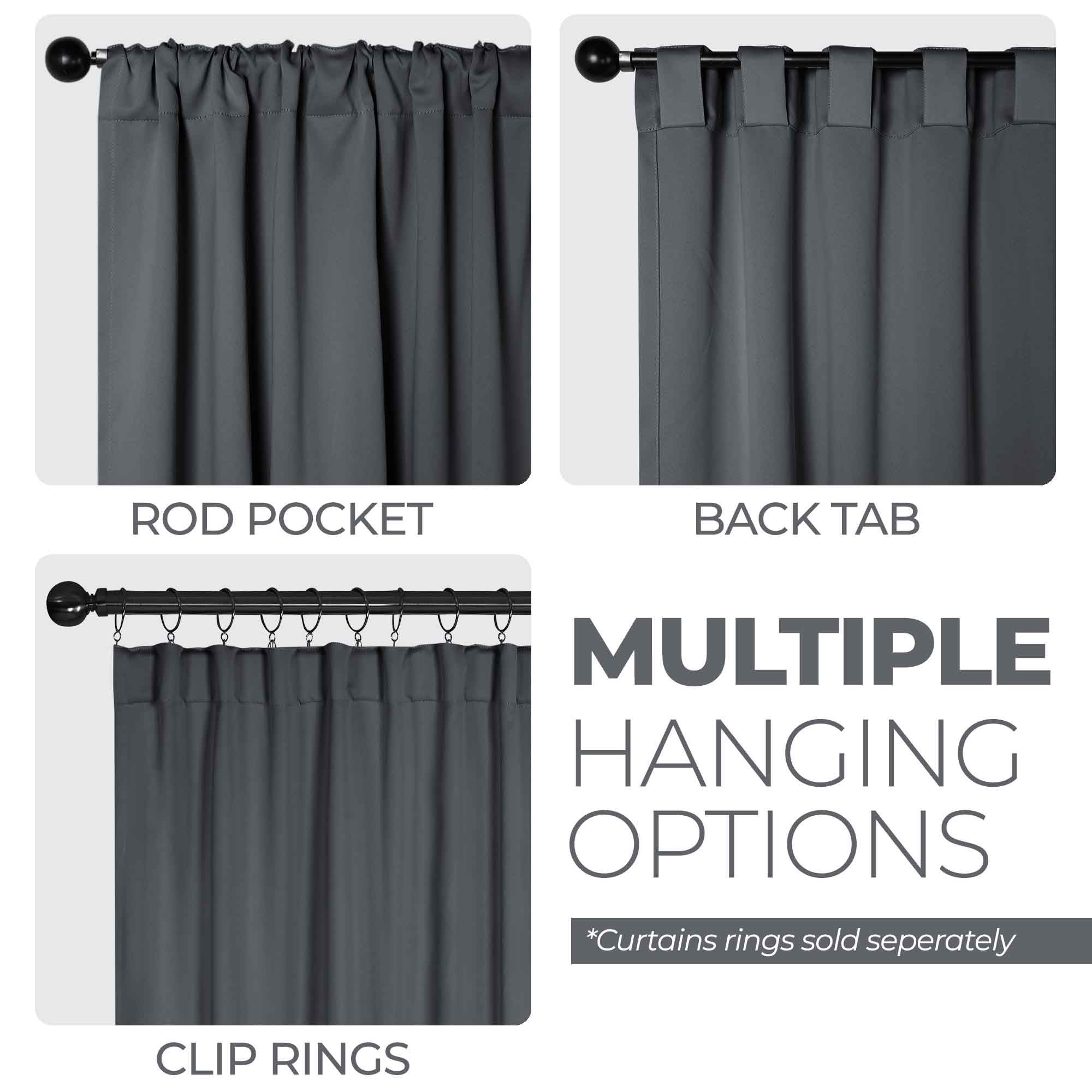 - Multiple hanging options including rod pocket, back tab, and clip rings (rings sold separately)