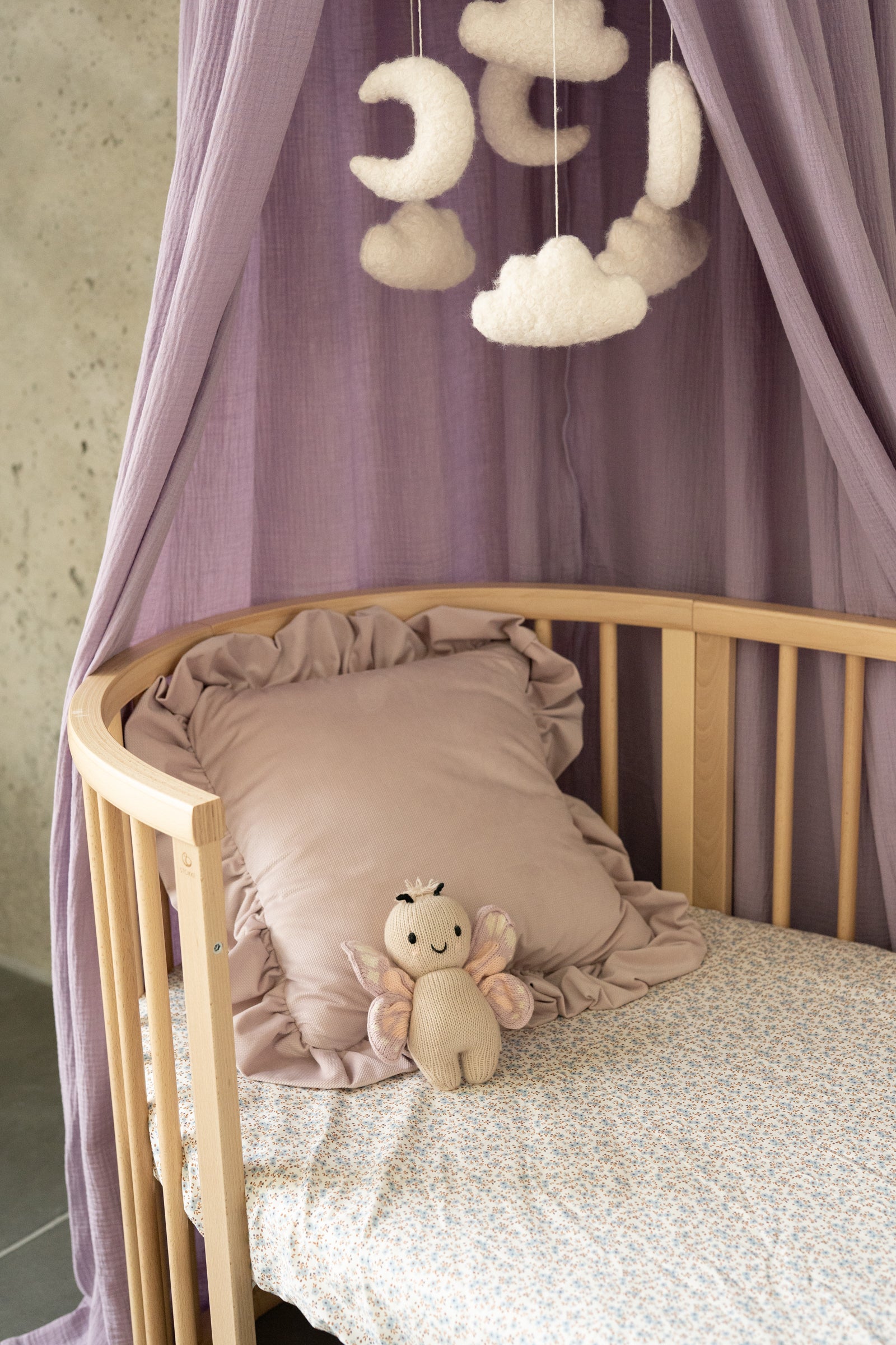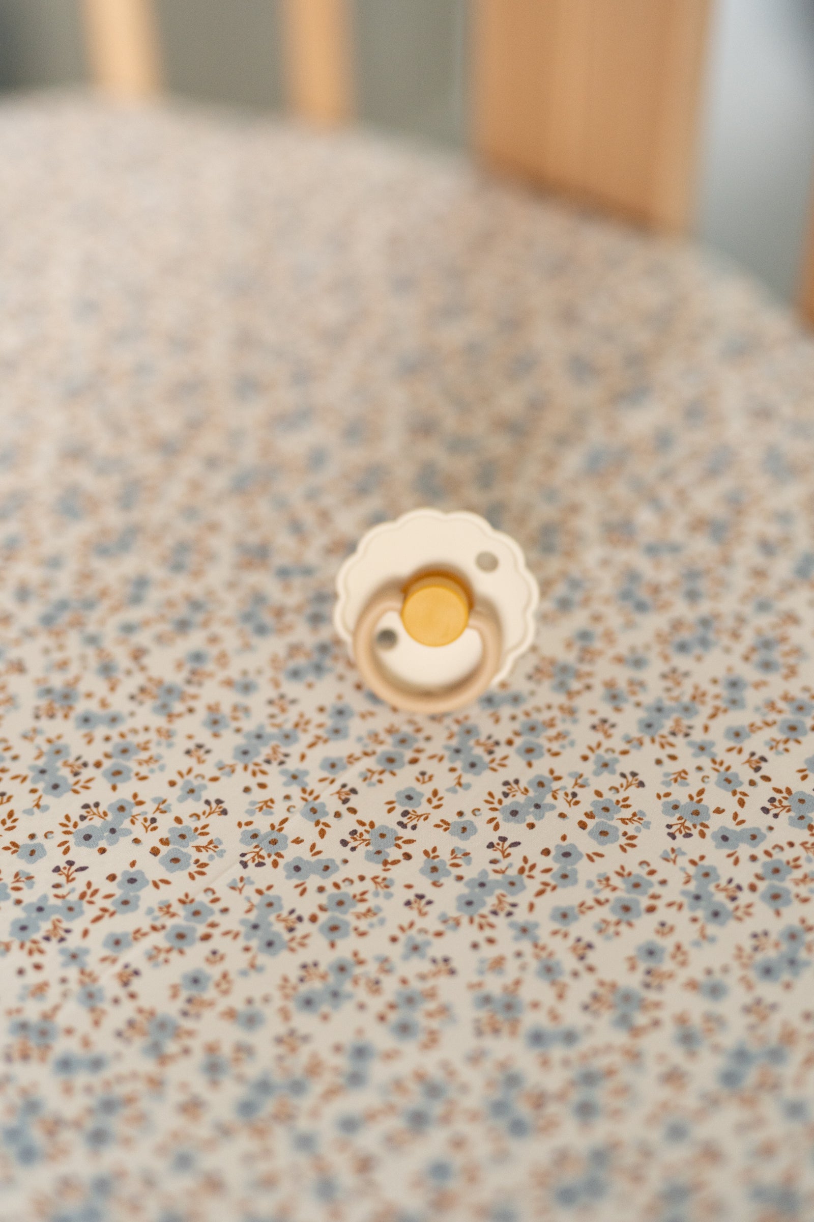 Bring a soft, dreamy atmosphere to your nursery with our Blossom Dream fitted sheet. Made from high-quality cotton muslin, it features a delicate mini pattern of blue flowers and brown leaves on a white background β gentle, timeless, and perfect for both classic and modern interiors. The elasticated edges ensure a snug fit and keep the sheet perfectly in place, offering your little one comfort and safety during sleep and play. Available in multiple sizes to fit cribs, toddler beds, or changing baskets. Β Β Product details: Β β’ Fabric: 100% cotton muslin (double gauze) β soft and breathable β’ Pattern: Mini blue flowers and brown leaves on white background β’ Sizes: Available from crib to single bed β’ Fit: Elasticated edges for a secure fit β’ Care: Machine wash at 40Β°C β’ Preparation time: 2β3 business days β’ Handmade with care in the Netherlands by Matuu Β Β Perfect for: Β β’ Crib or toddler bed β ideal for babies and young children β’ Soft and nature-inspired nursery styling β’ Matching with Matuu bedding, canopies, pillows, and dΓ©cor β’ A sweet handmade gift for new parents or baby showers