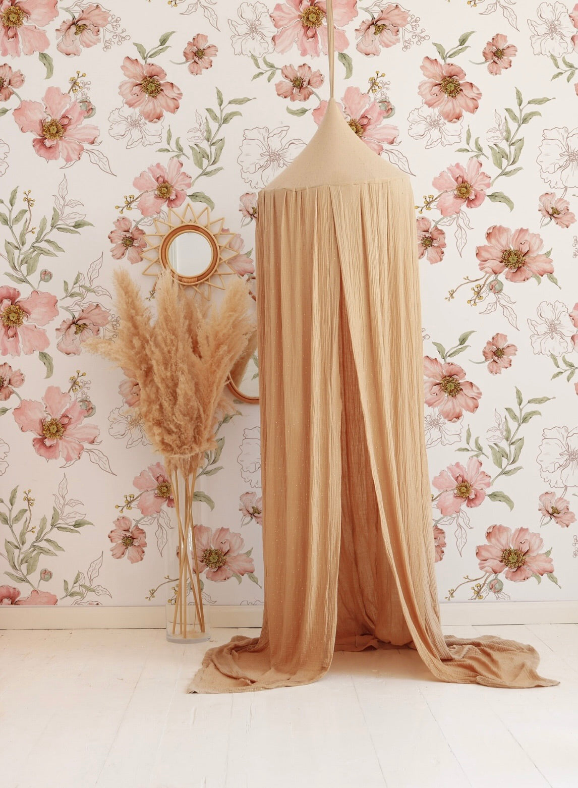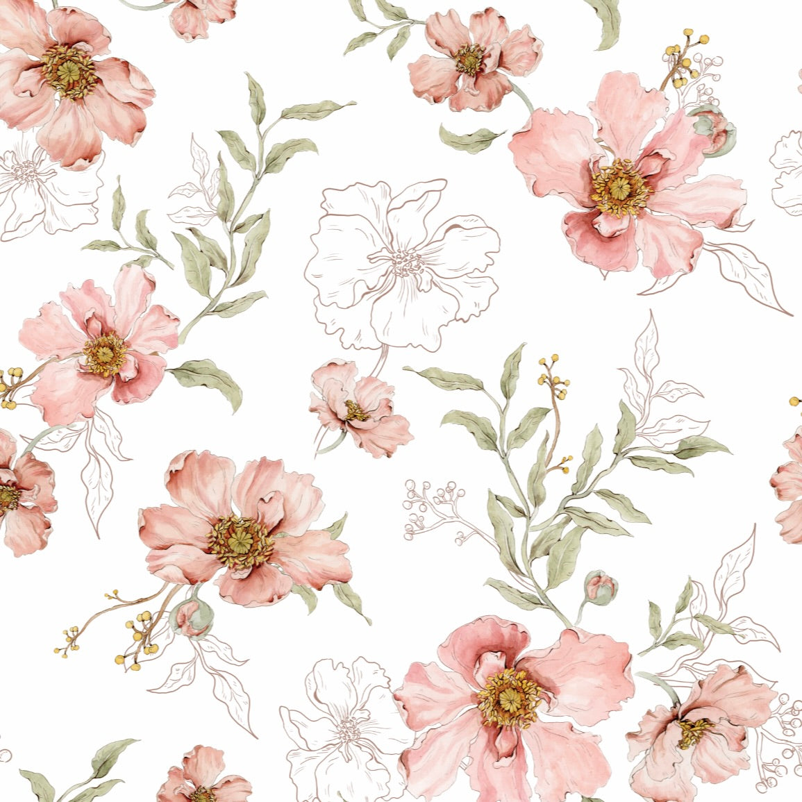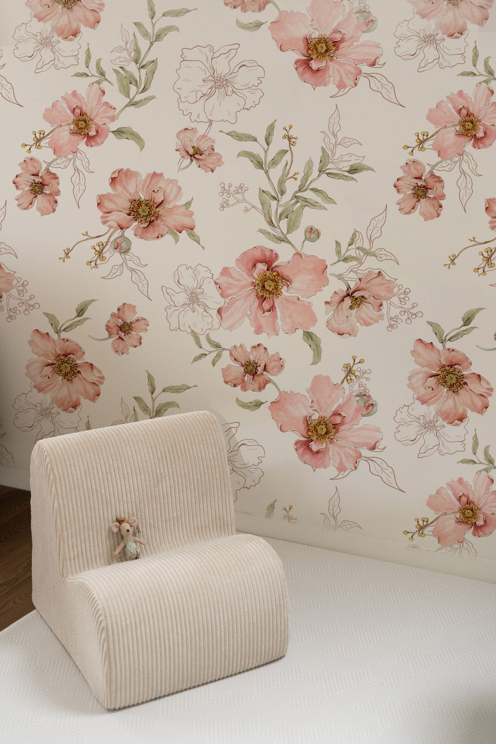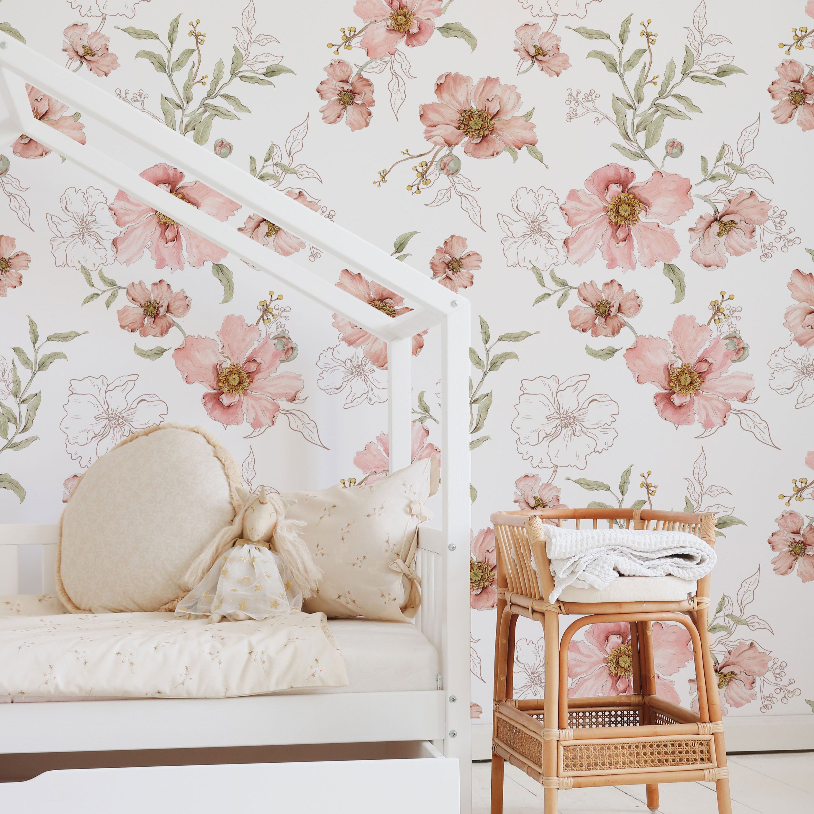 Blush Botanical β blush floral wallpaper brings soft romantic charm to bedrooms, nurseries, or any interior that embraces a gentle, botanical touch. This delicate design features hand-painted flowers in warm blush tones, muted reds and soft greens, blooming across a light pink background. Inspired by vintage botanical prints, this wallpaper adds elegance and coziness without overwhelming the space. Perfect for cottage-style bedrooms, calm childrenβs rooms or feminine interiors in need of warmth and natural detail. Printed on high-quality non-woven material, itβs easy to apply β just paste the glue directly onto the wall. A timeless floral wallpaper that pairs beautifully with natural materials and soft colour palettes. Ideal for: bedrooms, nurseries, vintage interiors, romantic or Scandinavian spaces Product features Design: watercolor flowers with botanical sketches Color palette: blush pink, soft green, cream, white Material: premium non-woven (vlies) wallpaper Finish: elegant matte texture Pattern repeat: every 50 cm in the medium version and every 100 cm in the large version. Production: printed to order β made just for you Dimensions & Installation Available sizes: β’ 2 strips measuring 50 Γ 270 cm β’ 2 strips measuring 50 Γ 310 cm Coverage: 1 set covers 1 meter wall width Installation: β’ Paste the wall (not the wallpaper) β’ Use non-woven wallpaper paste β’ Surface must be clean, smooth, and dry β’ Instructions: Download the step-by-step non-woven wallpaper guide How many rolls do I need? Each set includes 2 vertical strips (50 cm wide), coveringΒ 1 meter in width. Examples: Wall width 2.3 m β order 3 sets Wall width 4 m β order 4 sets Tip: Always add 5β10 cm margin, as walls are rarely perfectly straight. Production & Delivery Production time: 1-3 business days Shipping time: 2β7 business days (Europe) Check β Double Check Please carefully inspect your wallpaper before installation. Verify colours, pattern alignment, and length immediately upon delivery. We allow a cutting tolerance of up to 1 mm per strip. If the deviation is larger, we will gladly reprint your order. *Once the wallpaper has been cut and installed, it is no longer possible to objectively determine whether any irregularity originates from production or from handling during installation. For this reason, claims raised after installation are very difficult to assess. Important Notes This wallpaper is not kept in stock β itβs printed to order. Not sure about the colour or pattern scale?We recommend ordering a sample first.