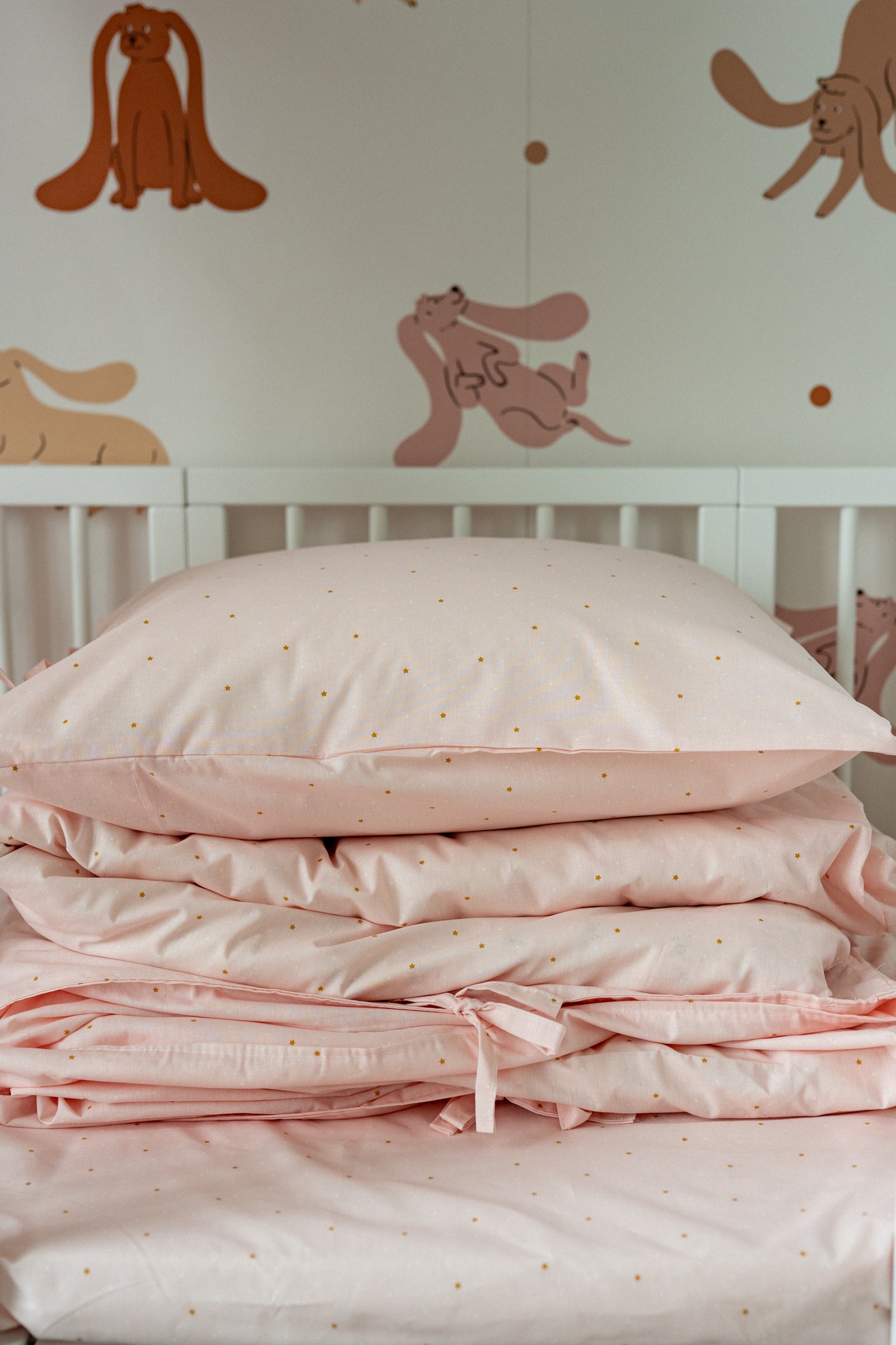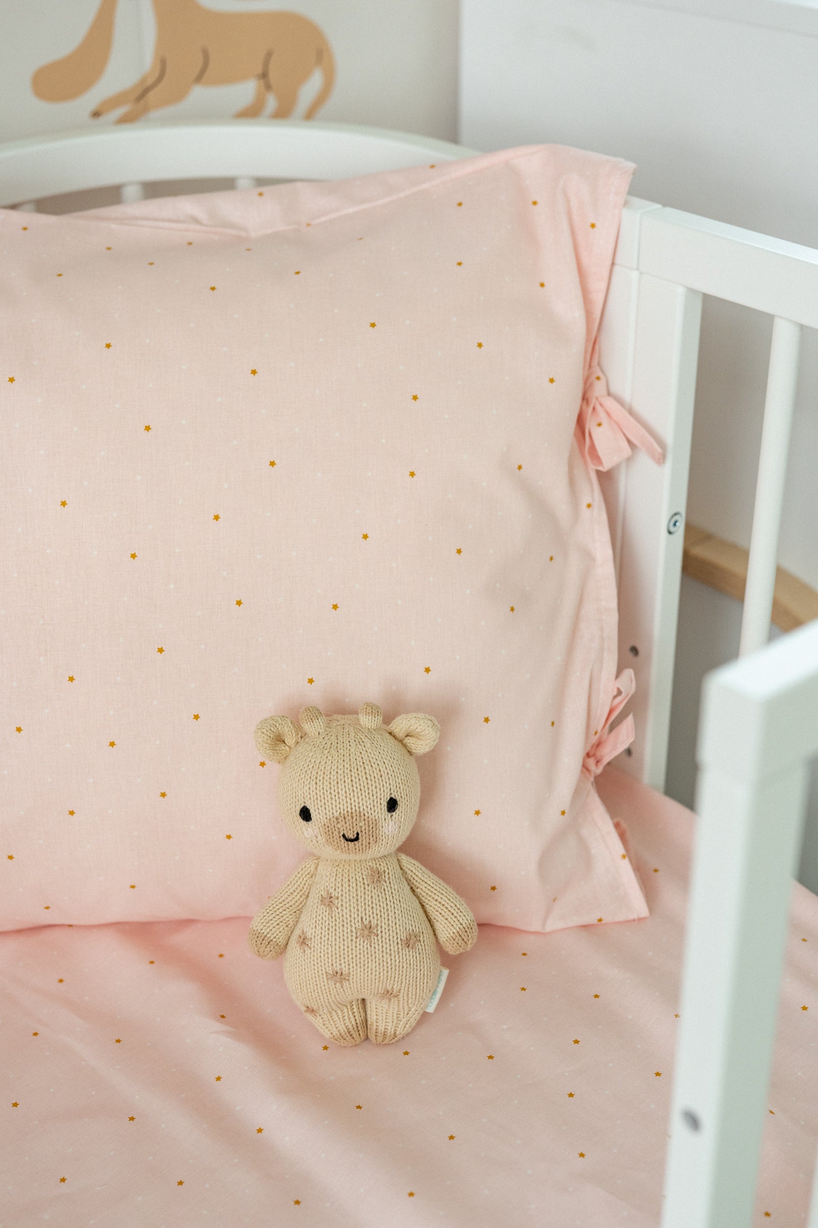 Wrap your little one in softness with our Blush Stars bedding set β made from GOTS-certified organic cotton and designed to bring charm and calm to any nursery. The fabric features a sweet blush pink tone adorned with delicate cream stars β timeless, soothing, and perfect for both baby girls and soft gender-neutral spaces. This set includes a pillowcase and duvet cover with cotton tie closures β safe, natural and button-free. The breathable cotton ensures all-night comfort, while the simple design makes it easy to mix and match with other Matuu nursery pieces. Available in multiple sizes β from crib to single bed β to grow with your child. Product details: Fabric: 100% organic cotton (GOTS certified) β soft, breathable and sustainable Print: Blush pink with cream stars Closure: Cotton ties (no buttons or zippers) Available sizes: Crib bed, toddler bed, single bed Care: Machine washable at 40Β°C, do not tumble dry Handmade in the Netherlands by Matuu Processing time: 2β3 business days Perfect for: Baby or toddler bedding Soft, playful nursery styling Gender-neutral baby rooms Eco-conscious baby gift