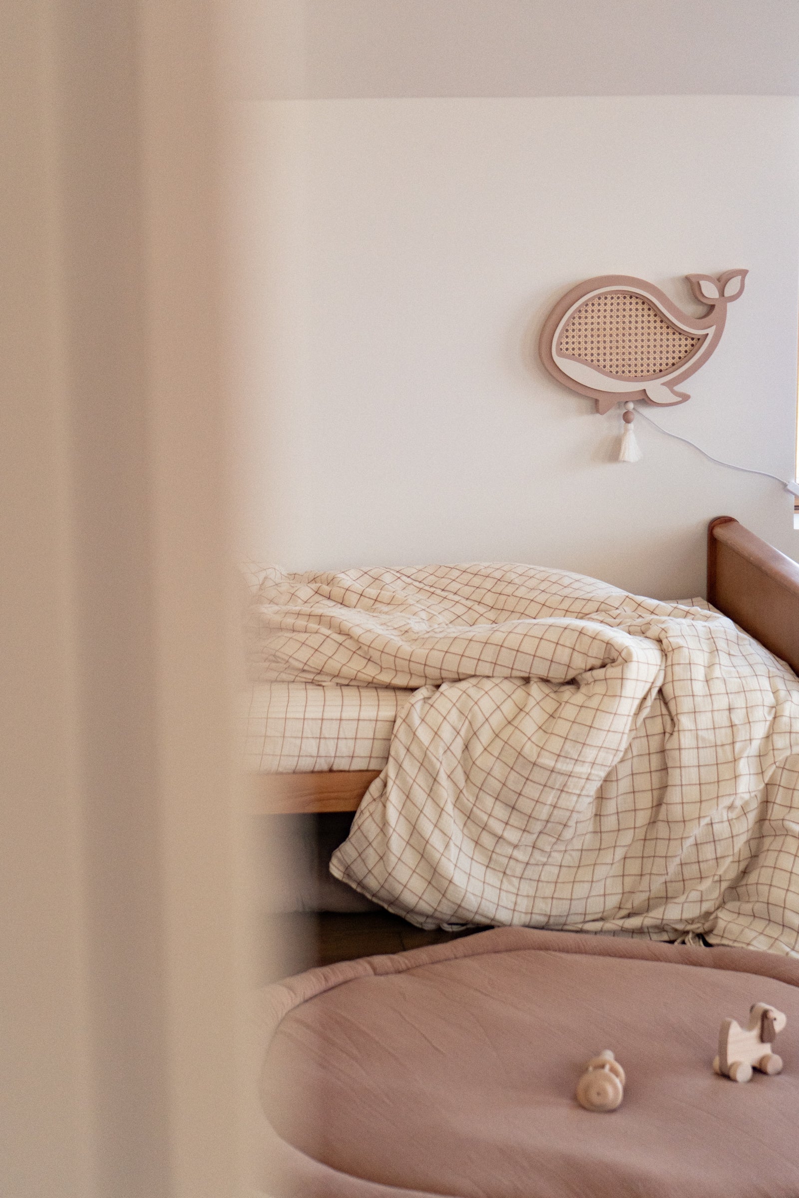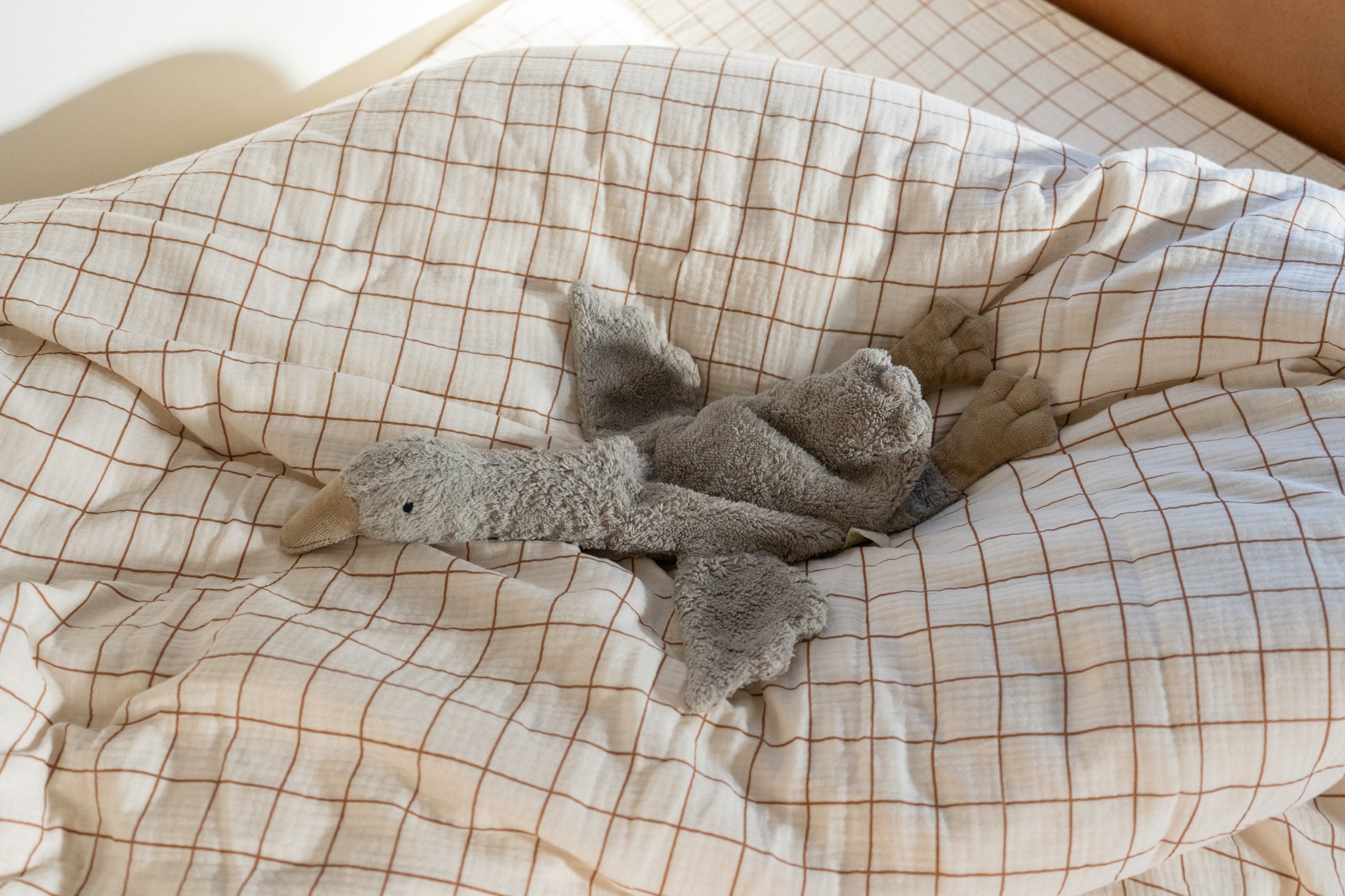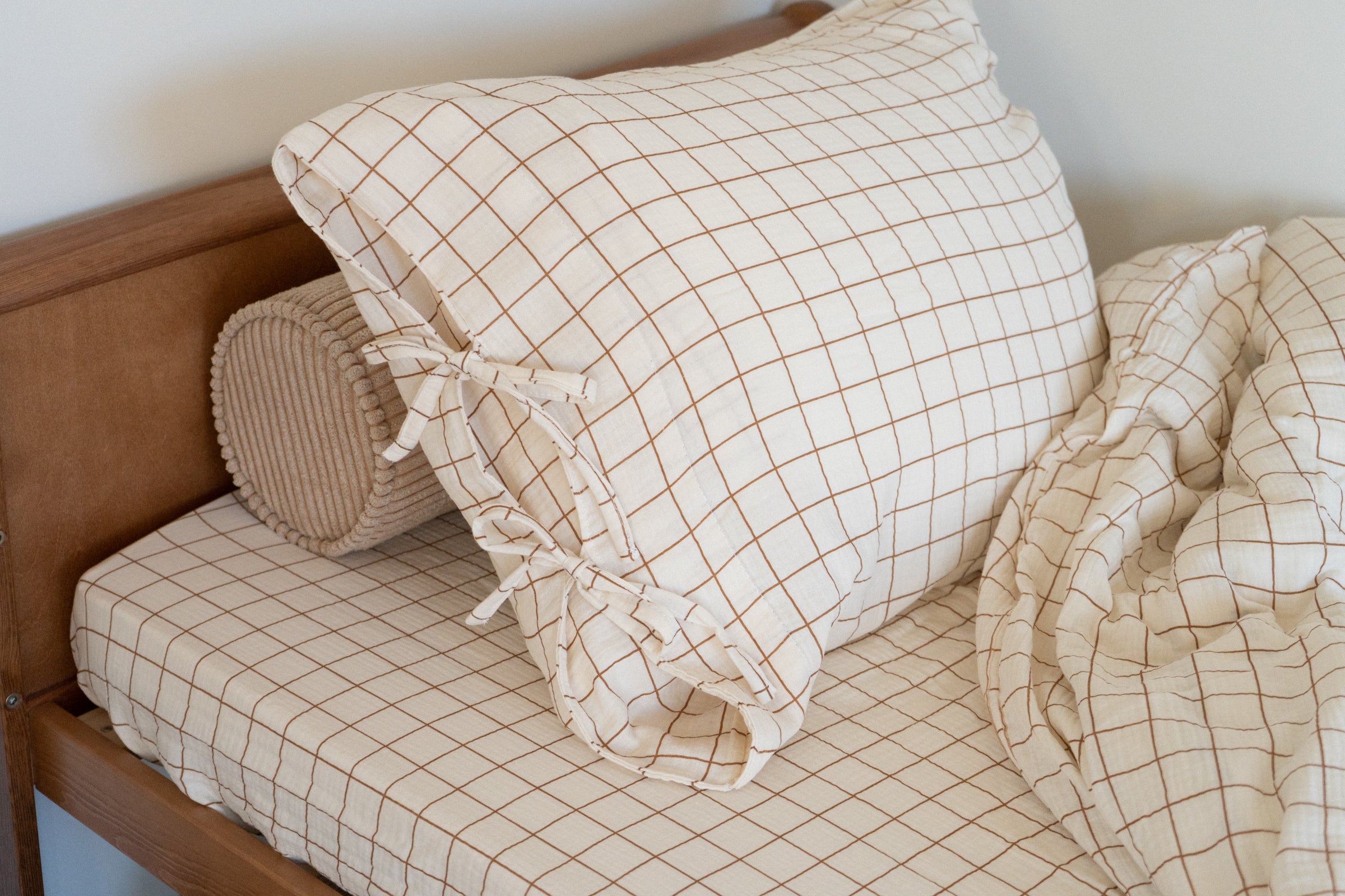 Give your nursery or child’s room a cozy, rustic touch with the Brown Checked on Cream bedding set. Made from airy, breathable muslin cotton, this set combines a soft cream base with a delicate brown check pattern, creating a warm yet playful design. Its neutral color palette makes it easy to style in both modern and vintage-inspired interiors. The bedding feels gentle against the skin, making it perfect for everyday comfort. OEKO-TEX® certification ensures it’s safe even for the most sensitive little ones. Each set includes a duvet cover and pillowcase, finished with cotton tiesfor a subtle handcrafted detail. Designed with care and handmade in the Netherlands, it brings quality, style, and timeless appeal to your child’s room. Product Details Material: 100% muslin cotton – OEKO-TEX® certified Design: Cream background with fine brown check pattern Closure: Cotton ties (no zippers or buttons) Set includes: 1 duvet cover + 1 pillowcase (all sizes) Sizes: Crib, toddler, junior, and single bed Care: Machine wash at 40 °C, gentle cycle; no tumble dry; iron on low if needed Production time: 2–3 business days Handmade in the Netherlands by Matuu Perfect For Rustic, boho, or vintage nurseries Parents who love neutral, timeless patterns Cozy toddler and single beds Everyday use thanks to breathable muslin cotton A thoughtful baby shower or birthday gift