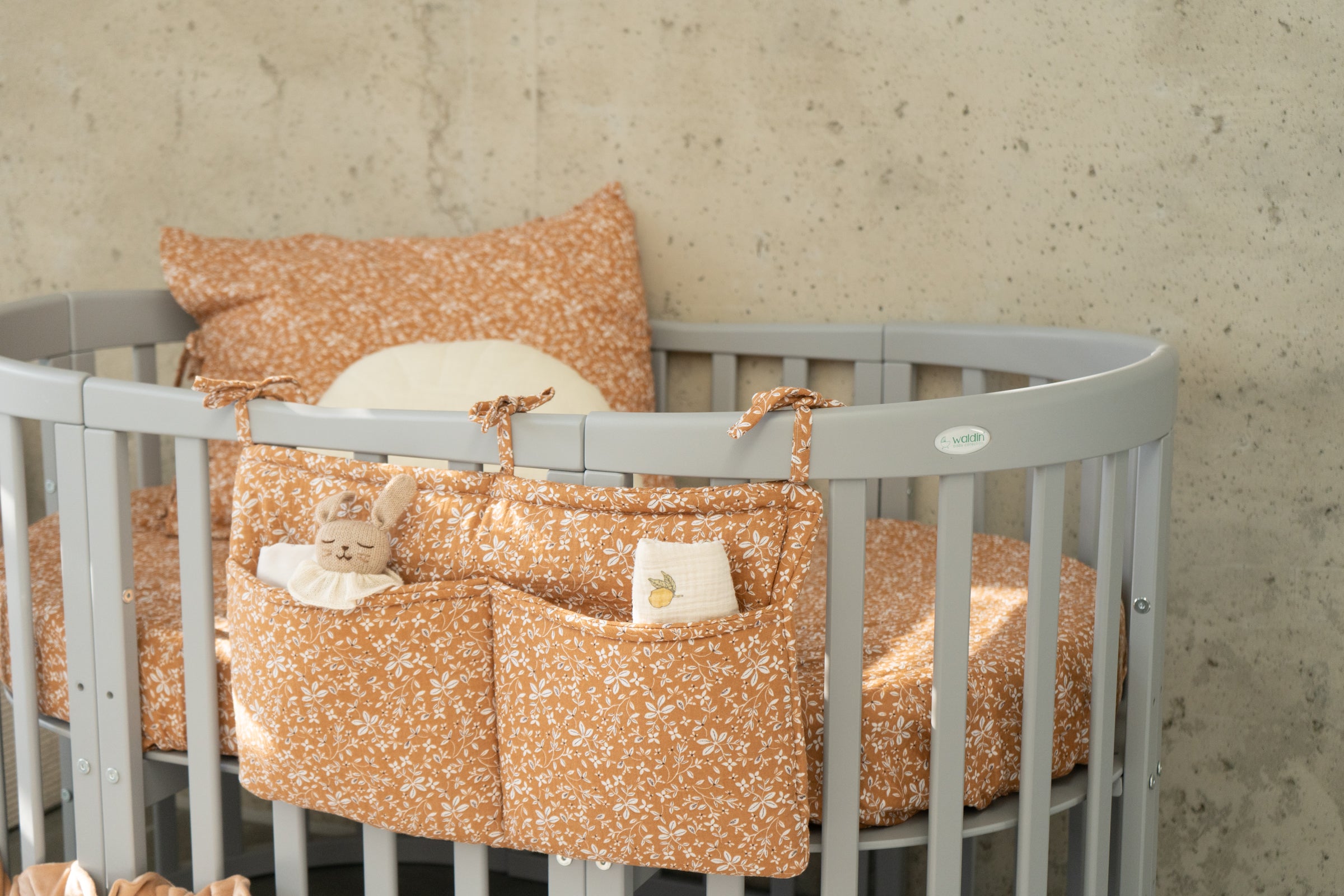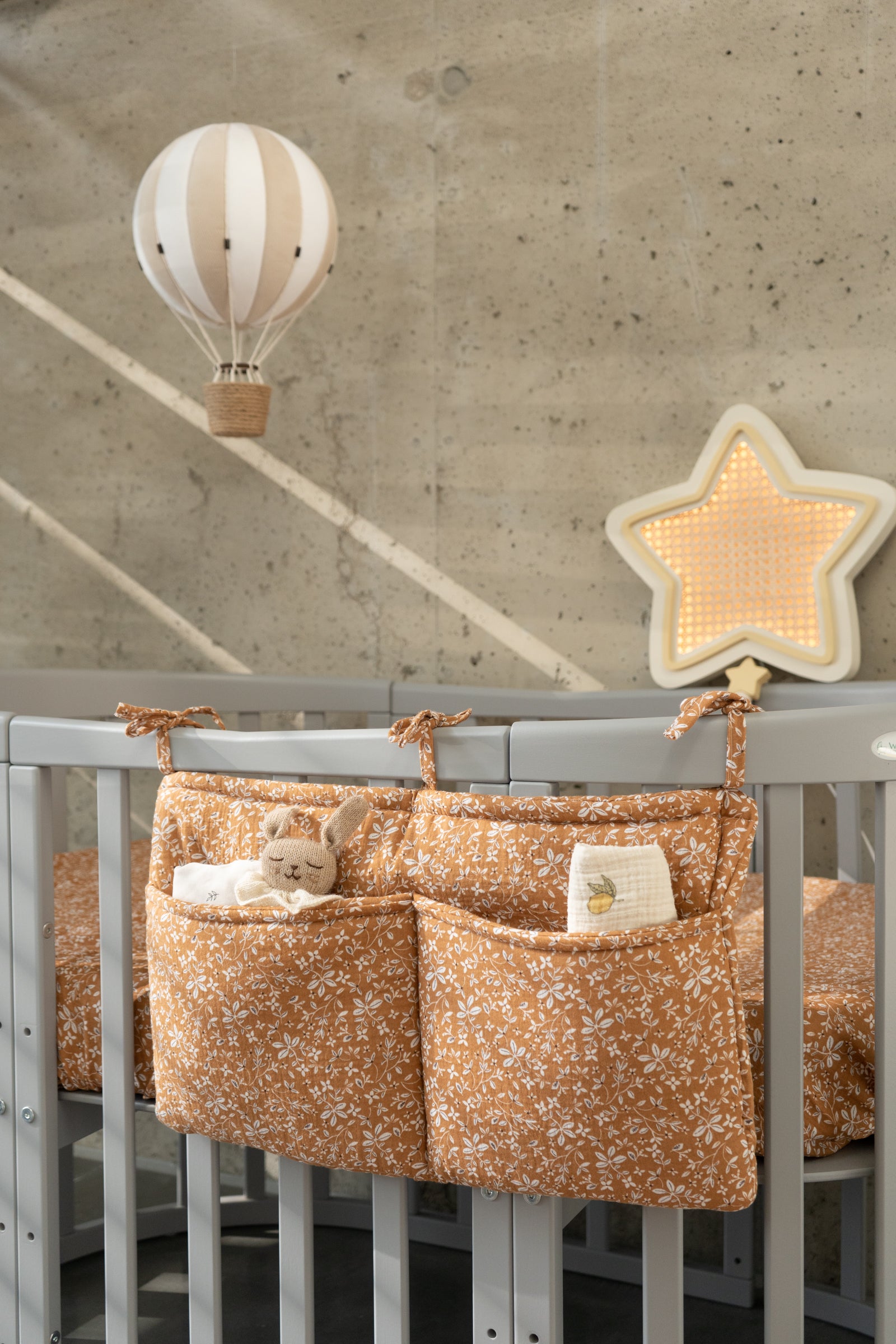 Keep your baby essentials neat and within reach with this beautiful Brown Little Twigs crib organizer, handcrafted from soft, breathable cotton muslin. Featuring a warm cinnamon brown color with delicate white twigs, it’s both practical and stylish – the perfect storage solution for pacifiers, loveys, wipes or teethers. Tie it easily onto a crib or playpen and bring instant charm to your baby’s space. Product features Dimensions: 50 x 32 cm Fabric: 100% muslin cotton – gentle, lightweight and textured Color: Cinnamon brown with white botanical print Washing: Machine washable at 40°C Preparation time: 2–3 business days Handmade with care in NL by Roksana (Matuu) Looking for a custom size? Just send a message!