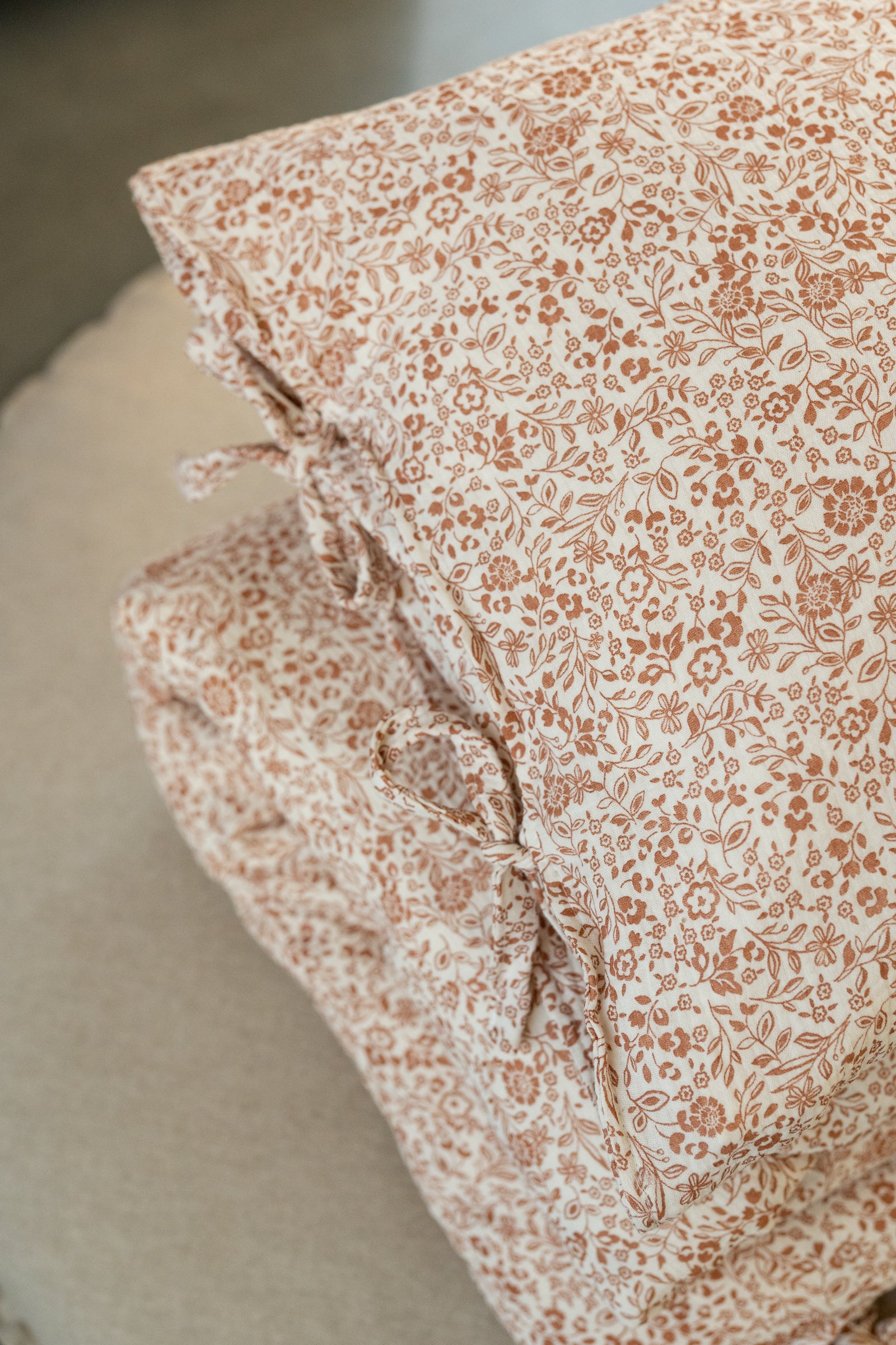 Add cozy charm and timeless floral beauty to your child’s room with our Brown Meadow bedding set – crafted from soft, breathable cotton and printed with delicate, rust-brown flowers on a warm ecru base. The subtle, all-over floral pattern brings a sense of calm and warmth, making it perfect for vintage, nature-inspired or boho-style nurseries and kids’ rooms. The bedding is reversible (if applicable), lightweight, and OEKO-TEX® certified – safe and gentle for sensitive skin. Tied closures (instead of zippers or buttons) add a soft, minimal finish while keeping the duvet securely in place. Each set is lovingly handmade in the Netherlands and available in multiple sizes, from crib to single bed. Product Details • Material: 100% cotton – OEKO-TEX® certified • Print: Brown Meadow – fine floral pattern in rusty-brown tones • Closure: Cotton ties (no zippers or buttons) • Sizes: Crib, cot, junior, toddler, and single bed • Set includes: 1 duvet cover + 1 pillowcase (toddler/single) or just duvet cover (crib size) • Care: Machine wash at 30°C, gentle cycle • Preparation time: 2–3 business days • Handmade in the Netherlands by Matuu Perfect for: • Floral and nature-inspired baby or kids’ rooms • Vintage, boho, or neutral nursery themes • Cozy toddler or single beds • Matching with Brown Meadow accessories (fitted sheet, organizer) • Baby shower or birthday gift