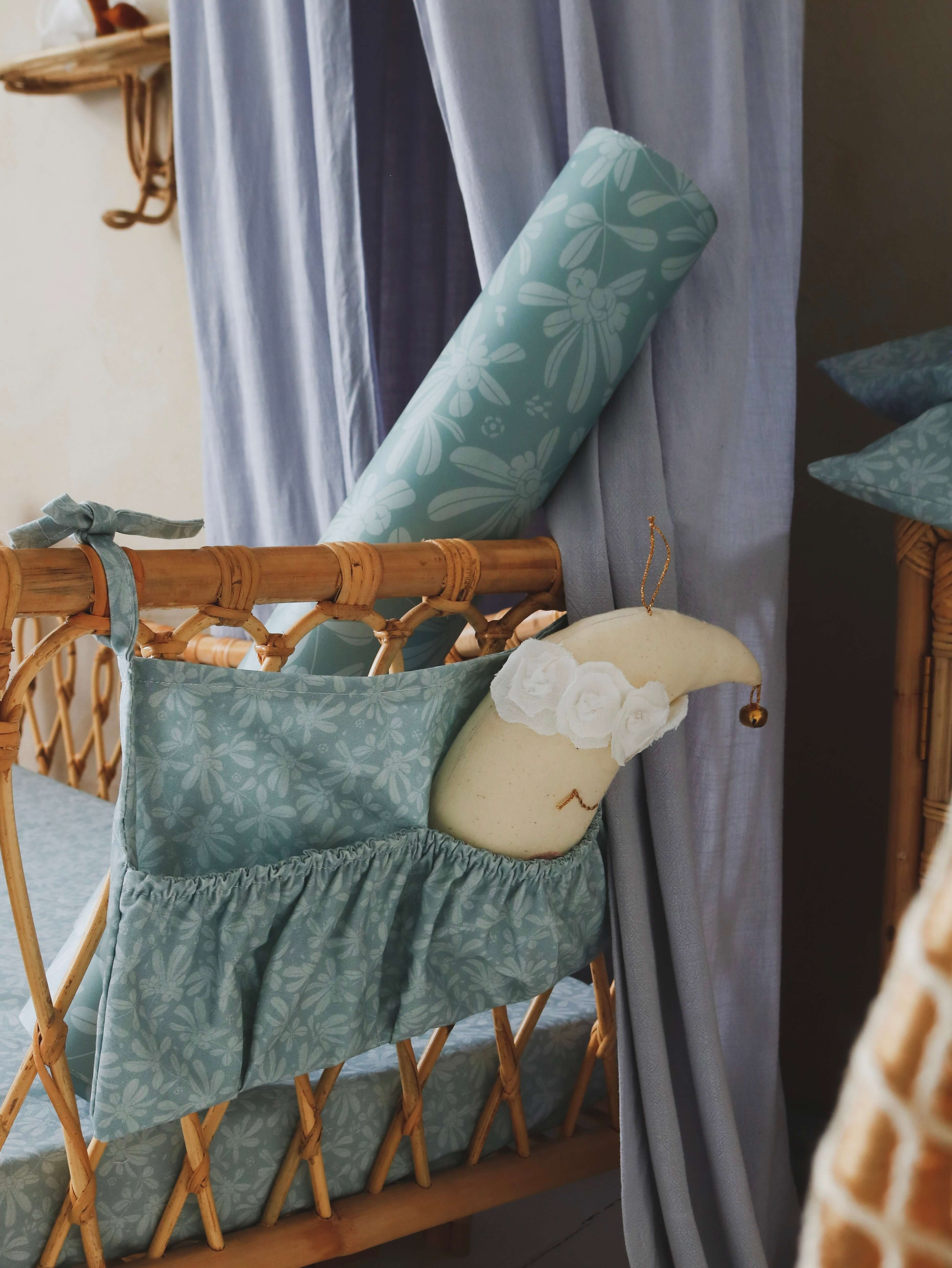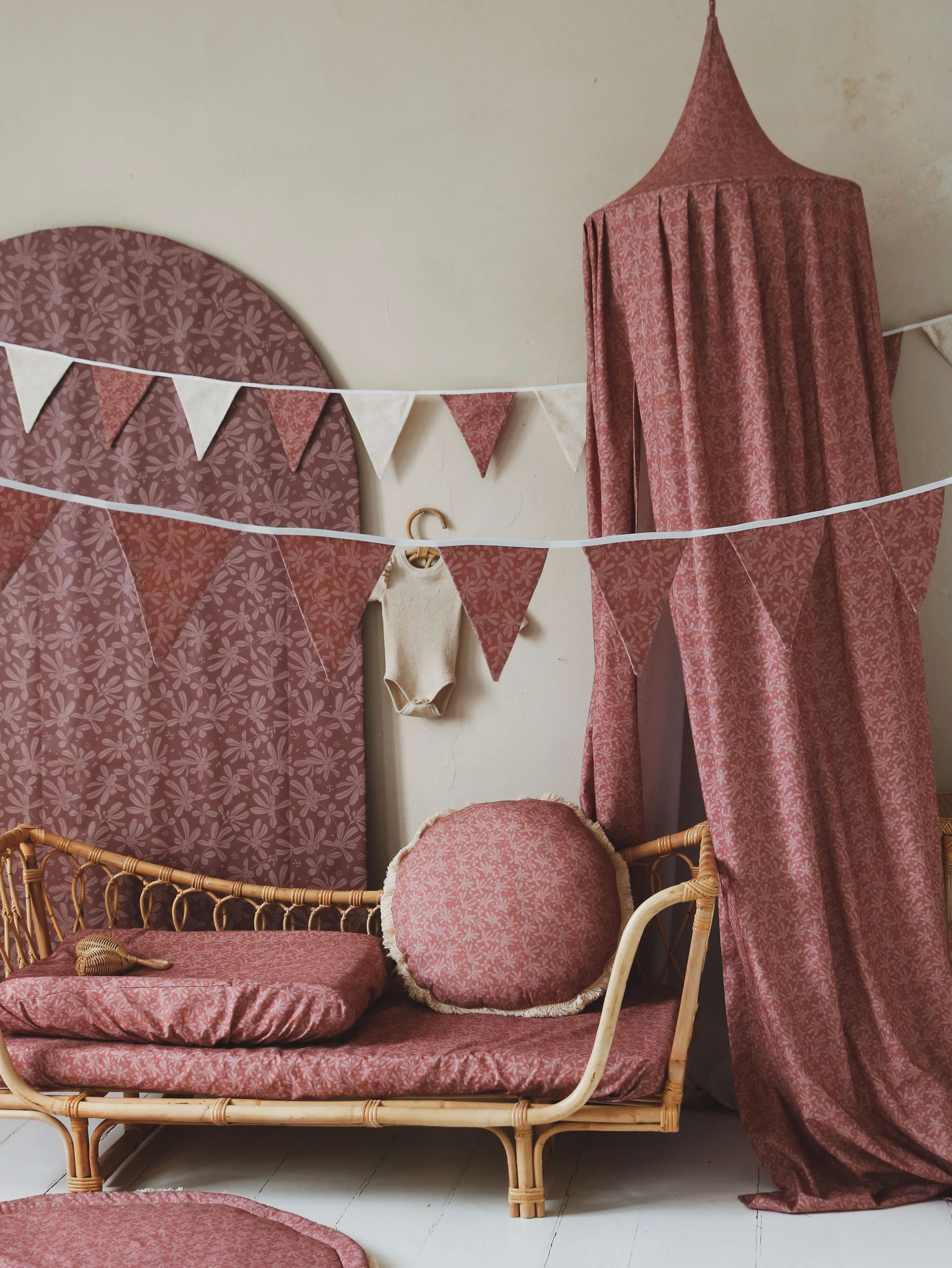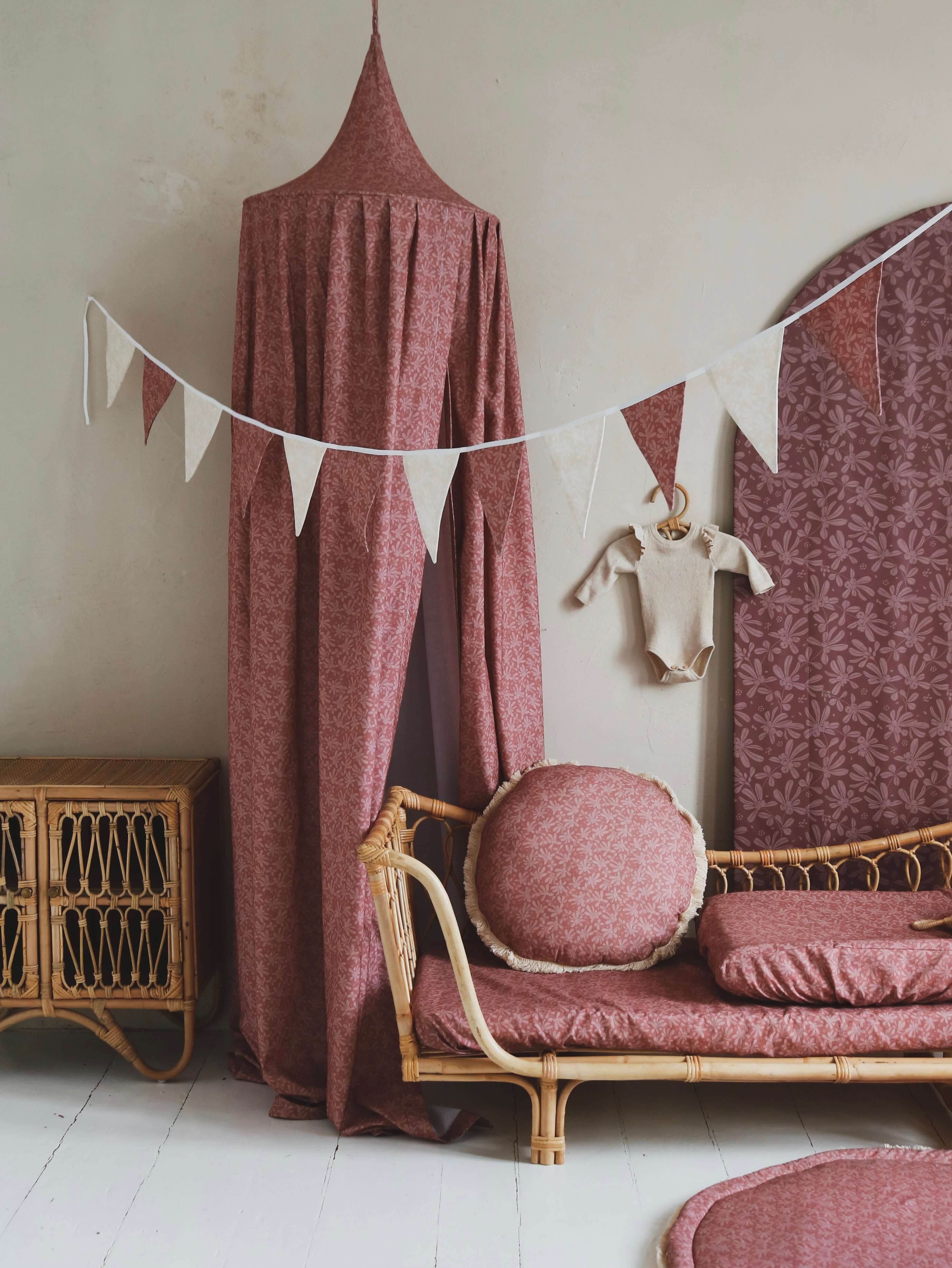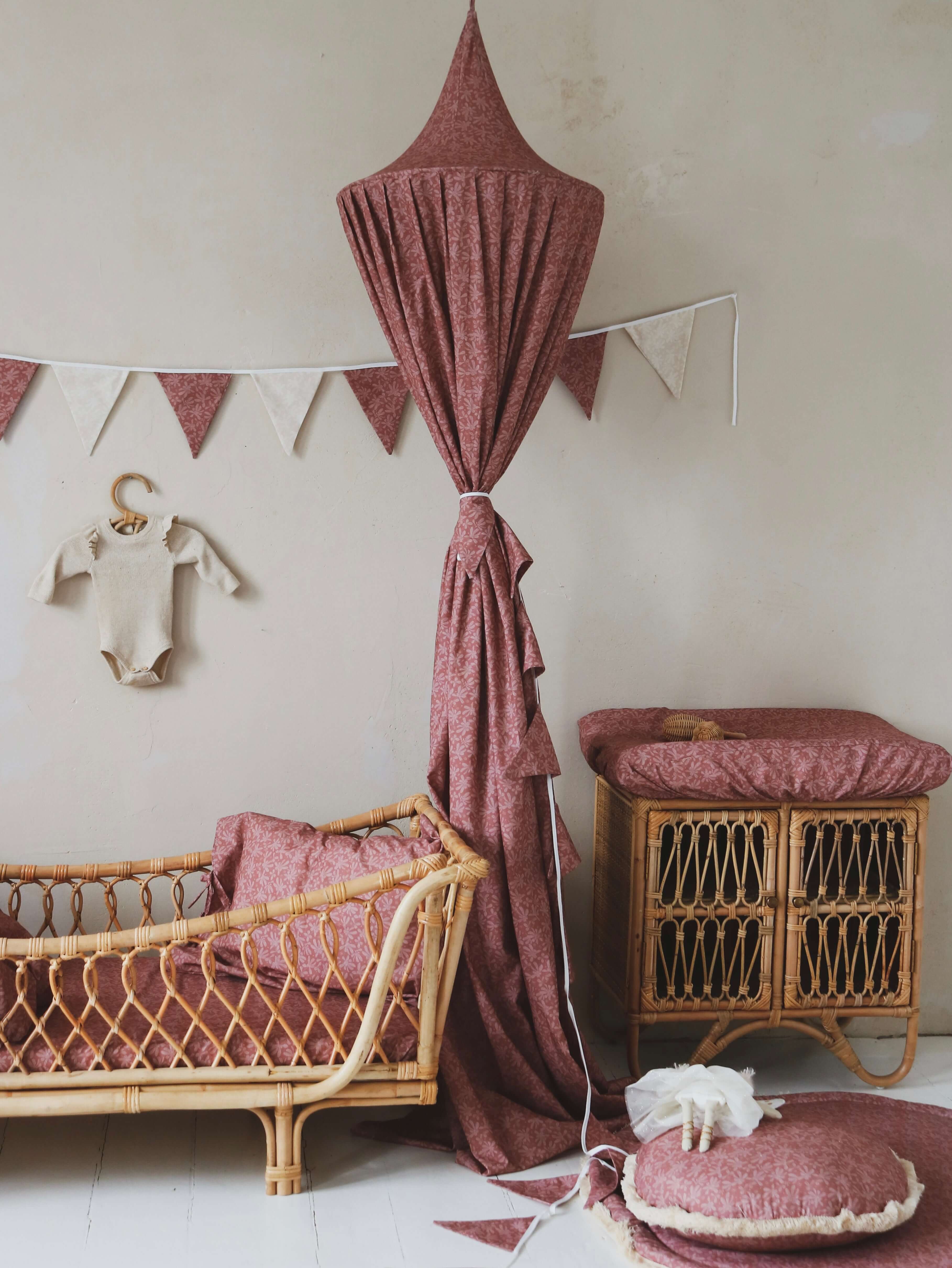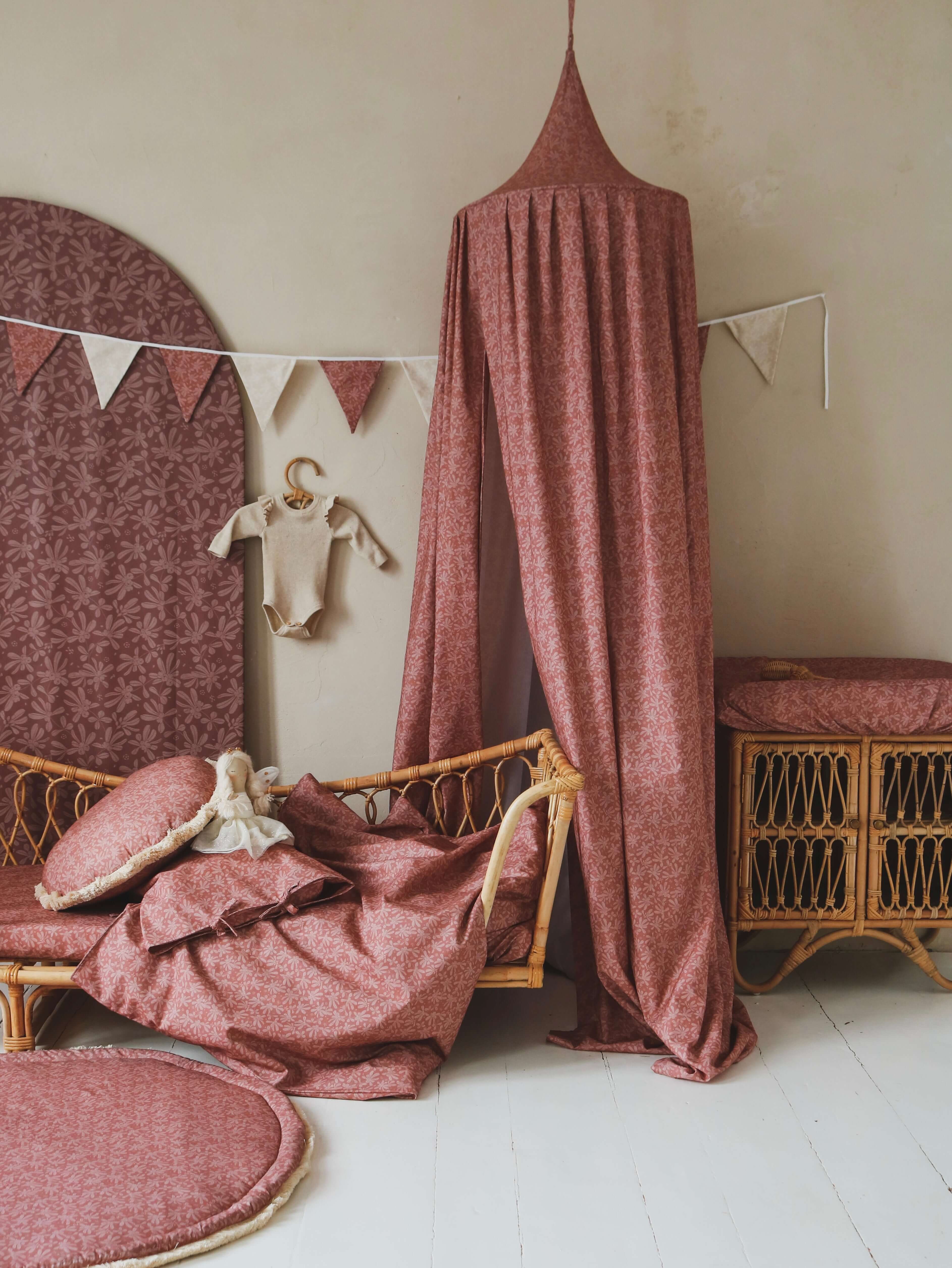 Create a warm and whimsical atmosphere in your child’s room with our Burgundy Barberries canopy, handcrafted from soft cotton fabric featuring a delicate white botanical print on a deep burgundy background. This lightweight canopy gently filters light, offering a cozy and calming space above a crib, bed or reading corner. Its rich color and timeless floral pattern make it perfect for vintage, boho, or nature-inspired nurseries. Includes a hidden metal hoop and interior loop for hanging a mobile, light, or garland. Easily ties to any ceiling hook with long fabric straps. Fully removable and washable. Product Details Fabric: 100% cotton (OEKO-TEX® certified) Color: Burgundy red with small white barberry leaves Height: approx. 235 cm (fabric) + 60 cm cotton ties Hoop diameter: 50 cm (metal ring included, hidden inside) Mounting: Two cotton straps – fits any ceiling hook Interior loop: For pendant, fairy lights or mobile Care: Remove hoop before washing. Machine wash at 30°C (gentle cycle), air dry Preparation time: 2–3 business days Handmade in the Netherlands by Matuu Perfect for: Bed or crib canopy Burgundy or botanical nursery theme Cozy vintage interiors Handmade baby shower gift