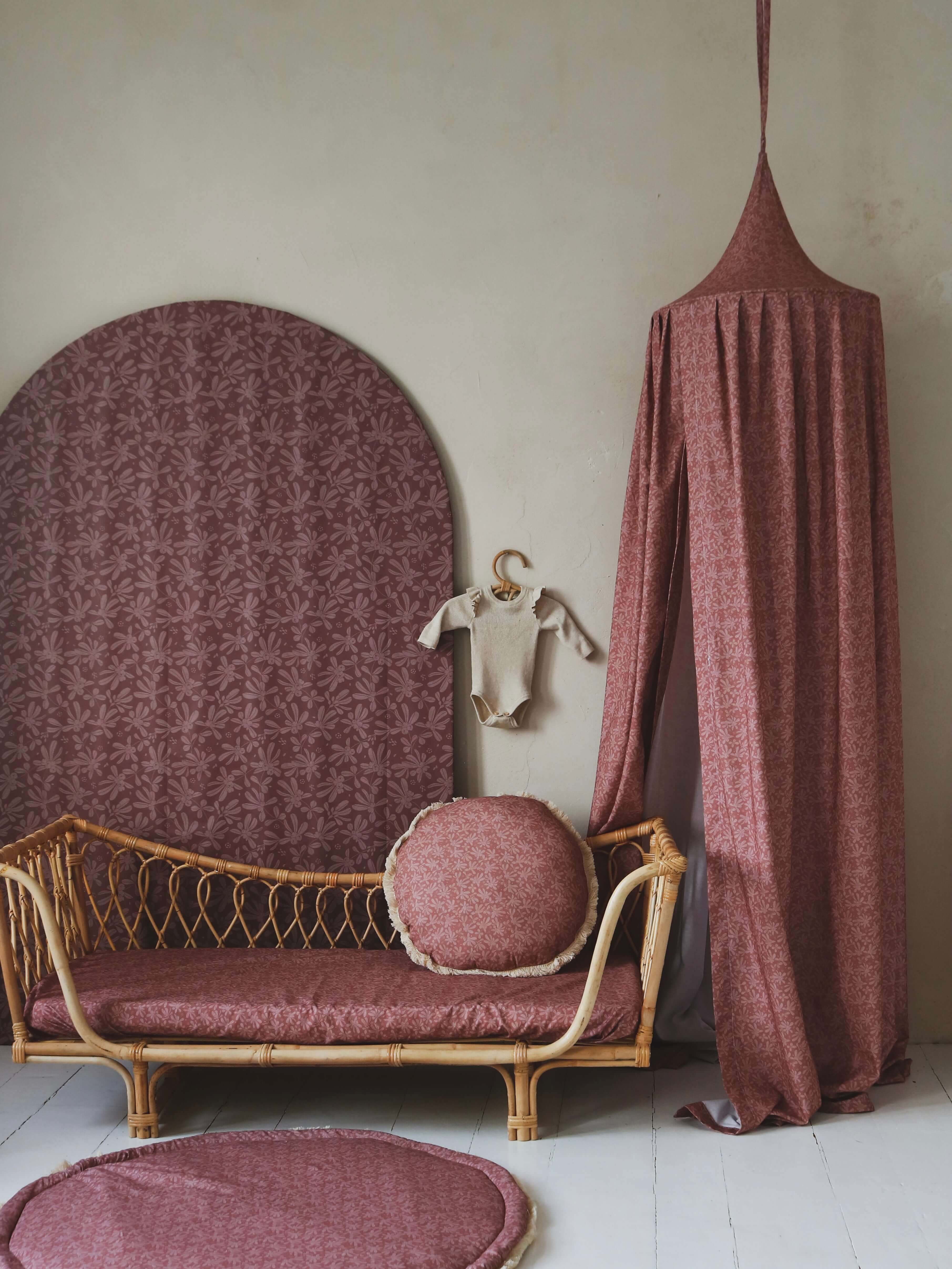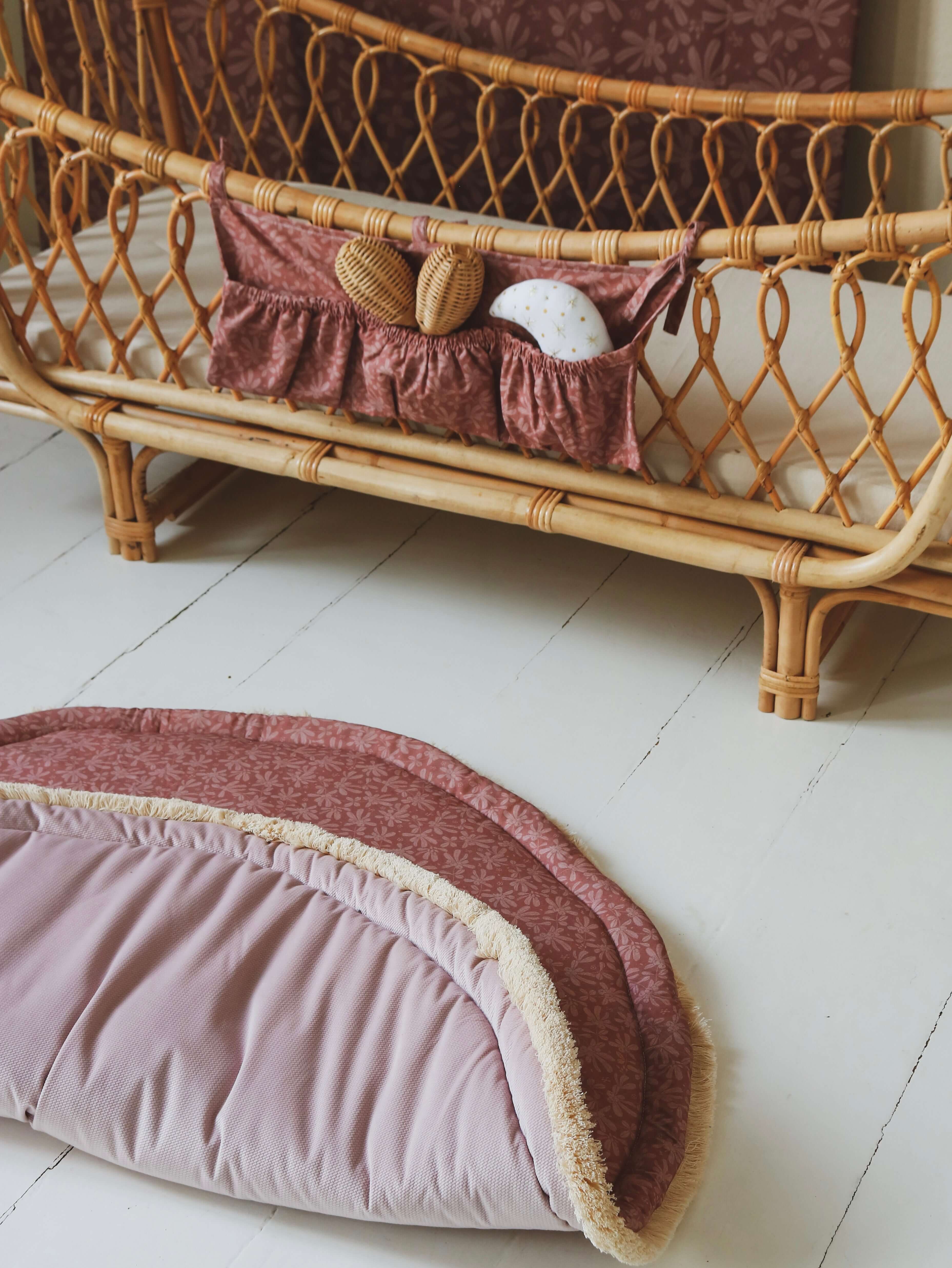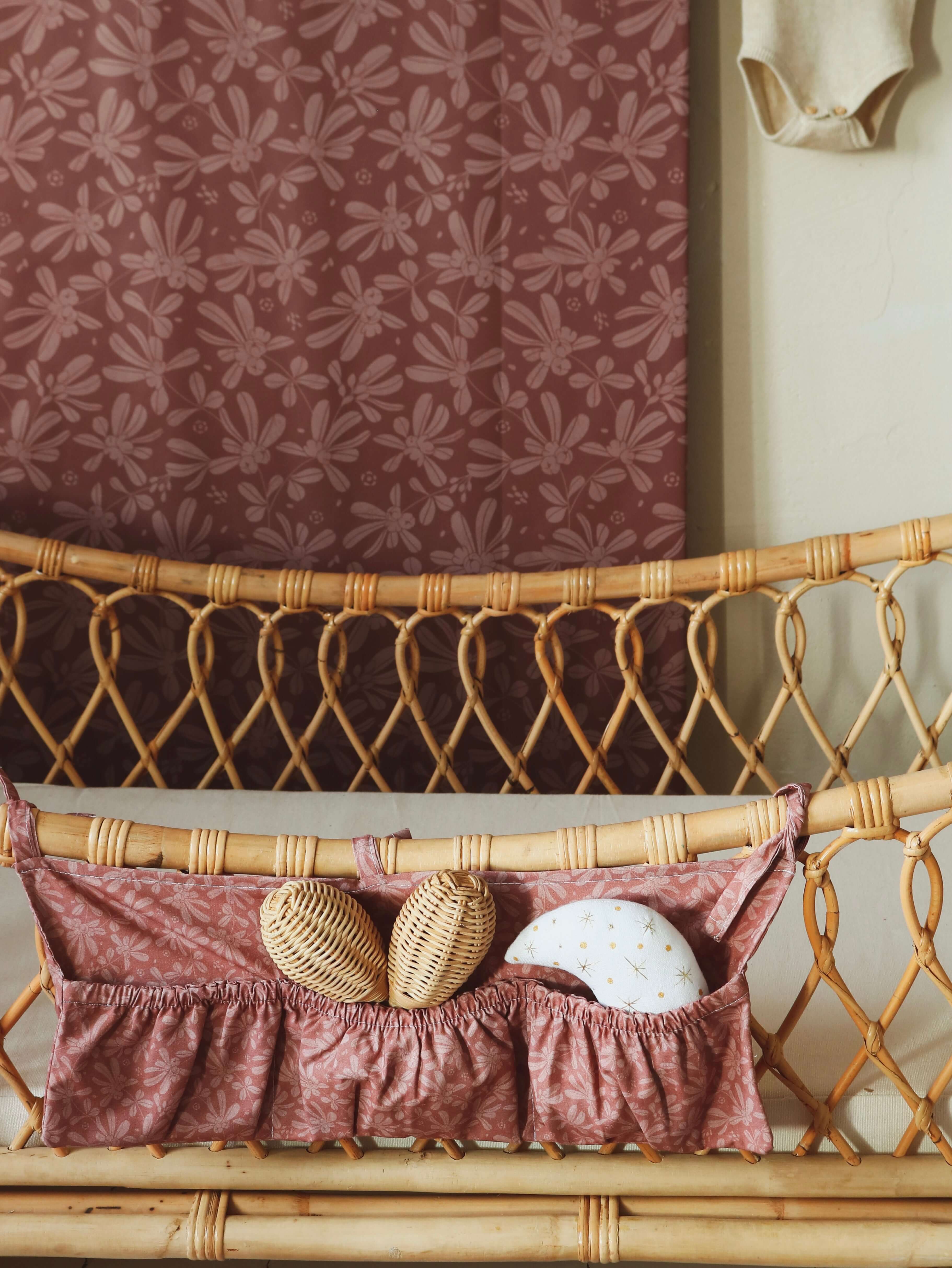 Add warmth and function to your baby’s nursery with the Burgundy Berberys crib organizer. Made from soft cotton in a deep berry tone with a subtle botanical print, this bed pocket keeps pacifiers, teethers, and small toys close at hand. The gathered pockets bring charm and practicality in one elegant piece. Tie it securely to a crib or playpen and enjoy a tidy space with a cozy touch. Product features Dimensions: 50 x 25 cm Fabric: 100% cotton – soft, breathable, OEKO-TEX certified Color: Deep burgundy with subtle berberys-style leaves Washing: Machine washable at 40°C Preparation time: 2–3 business days Handmade in the Netherlands by Roksana (Matuu)