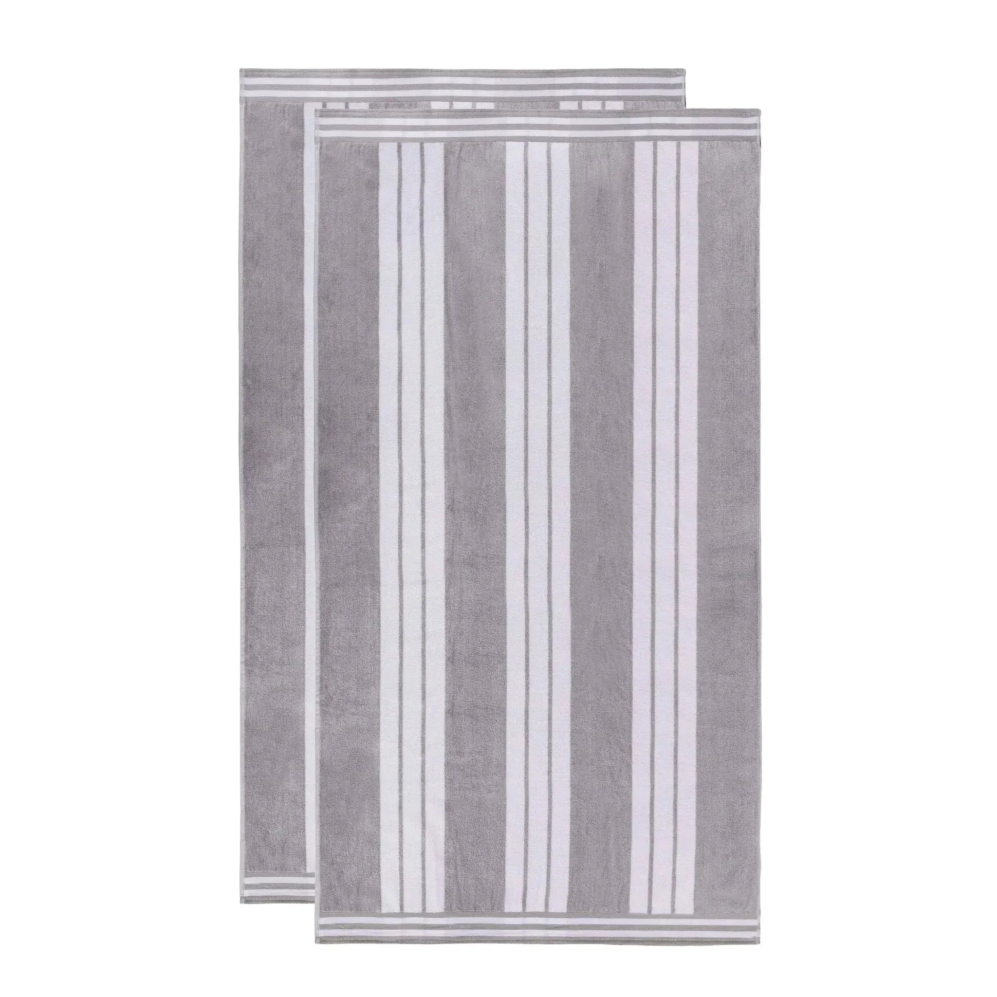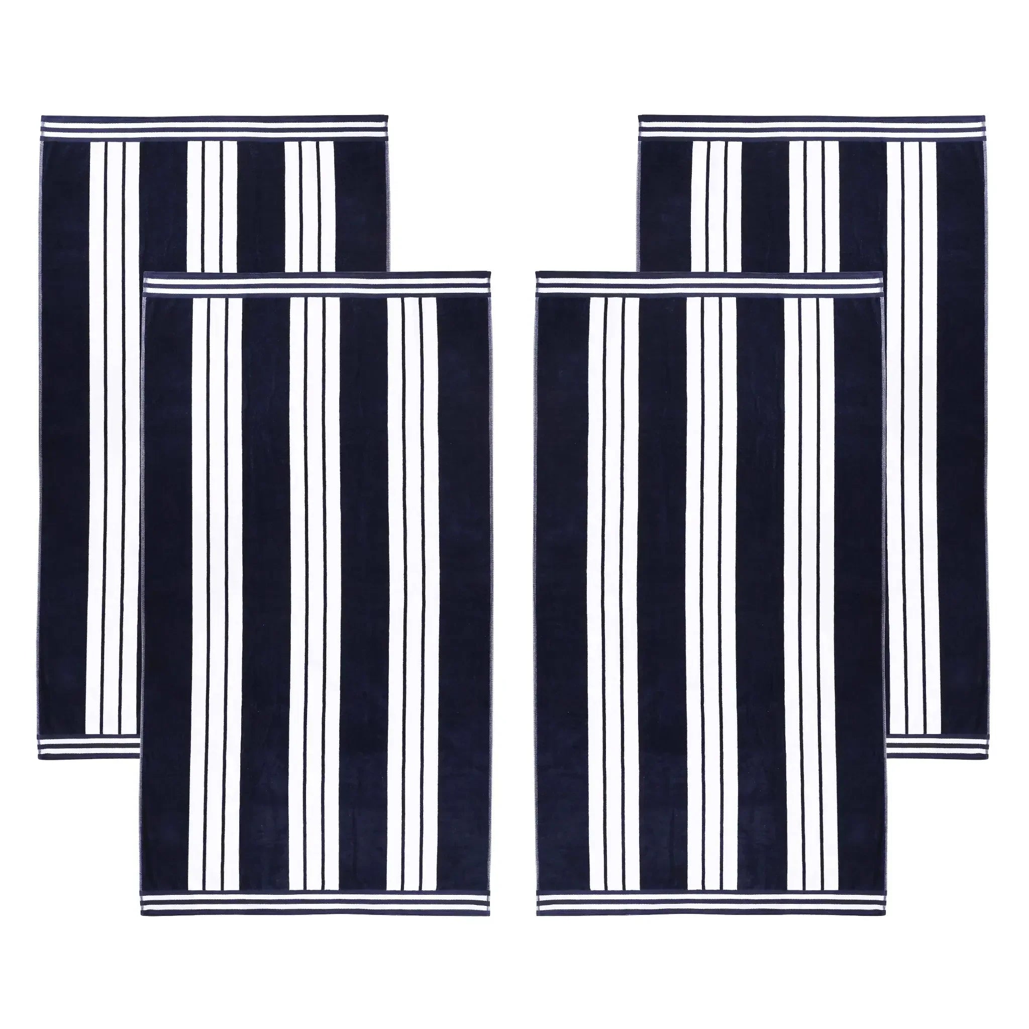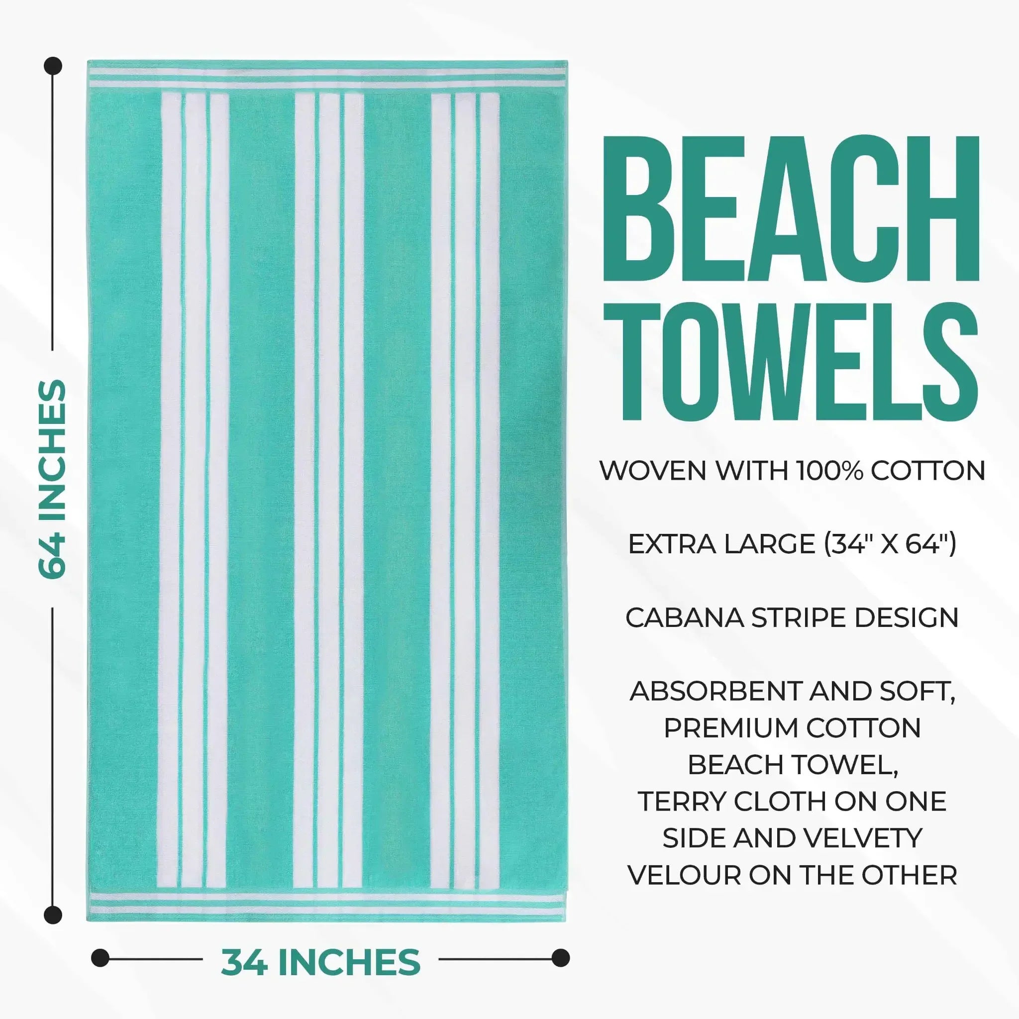 This is an extra-large beach towel set crafted from 100% cotton. With a dual – textured design of terry cloth on one side and velvety velour on the other, it offers both absorbency and softness. The vertical cabana stripe pattern with white stripes and multiple color options adds a stylish touch.