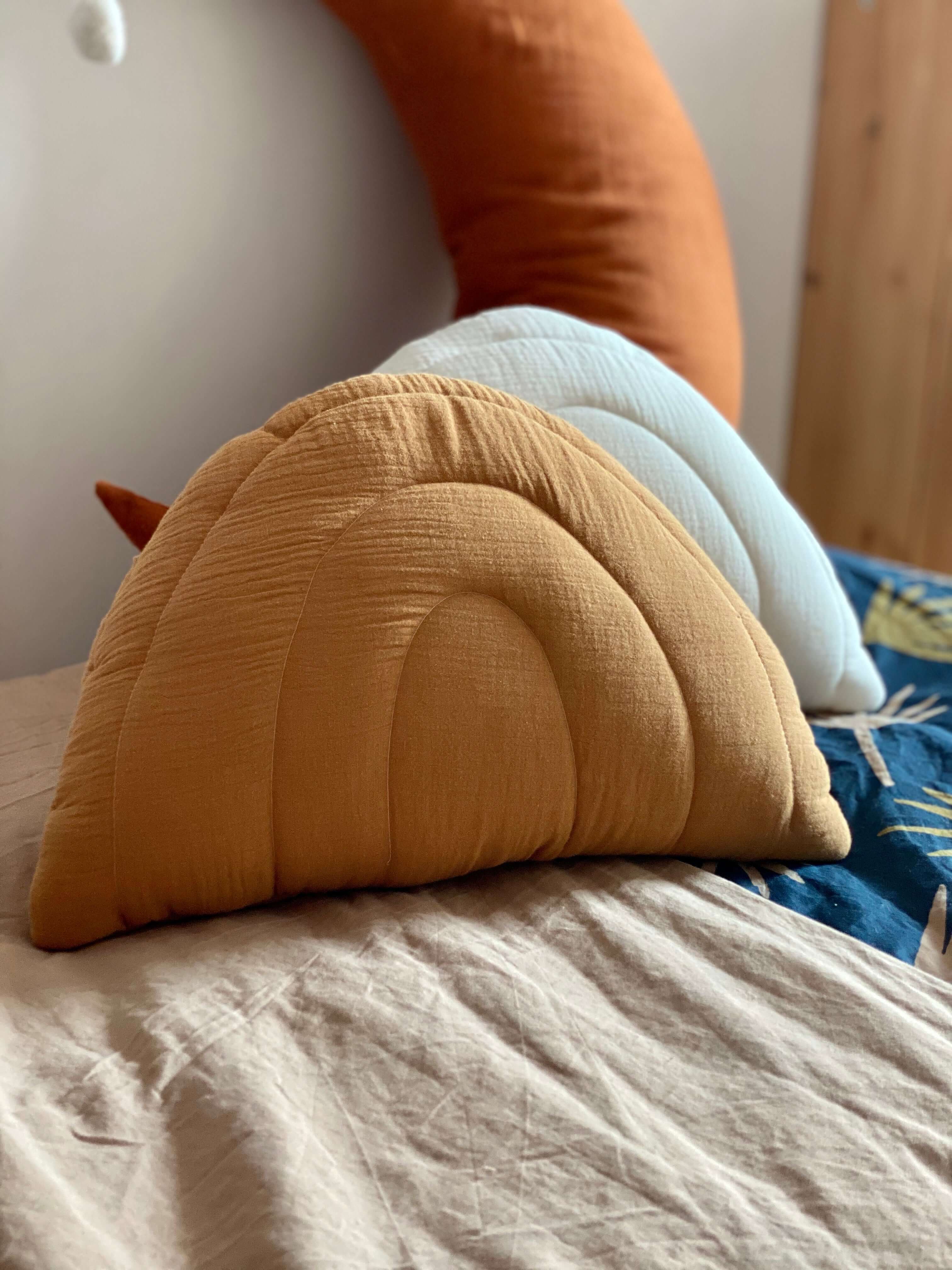Lovely soft pillow in the shape of a rainbow. Perfect decoration and toy for child’s room or play corner. Dimensions: height: 35 cm, width: 45 cm Fabric : cotton muslin fabric Filled with light and soft silicone balls Processing time: 1-3 work days Designed and made and quilted by hand, in Amsterdam, the Netherlands