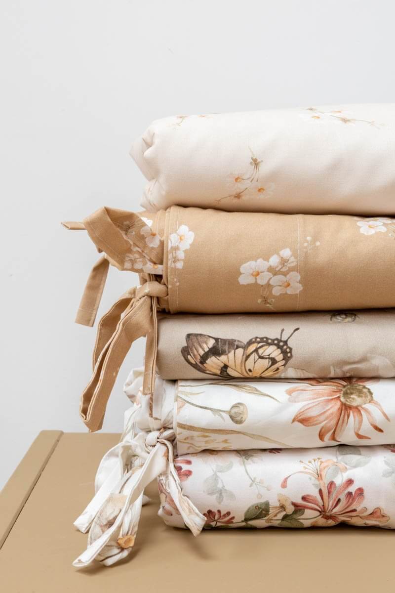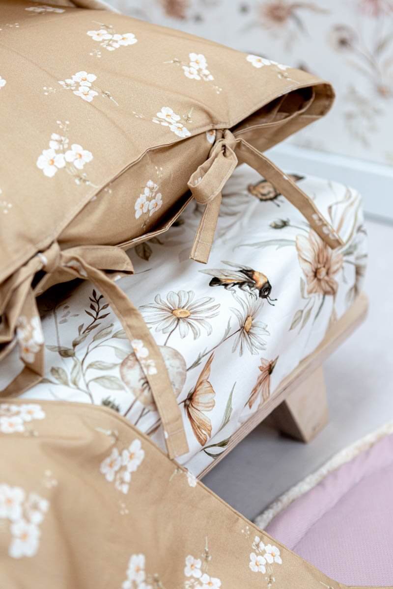 Add gentle charm and natural warmth to your child’s room with the Caramel Small Flowers bedding set. Made from soft, breathable enzyme-washed cotton, this bedding is naturally softened for extra comfort and durability, making it perfect for everyday use. The design features a warm caramel background decorated with delicate white blossoms and subtle green accents, creating a cozy and timeless look. Ideal for boho, vintage, or nature-inspired nurseries, kids’ rooms, and even adult spaces, it blends beautifully with neutral interiors. Each set includes a duvet cover and pillowcase, finished with cotton tie closures instead of zippers or buttons – a minimal and elegant detail. Safe for sensitive skin and OEKO-TEX® certified, this bedding is lovingly handmade in the Netherlands, offering artisanal quality with modern style. Product Details Material: 100% enzyme-washed cotton – OEKO-TEX® certified Design: Caramel base with small white floral motif and soft green details Closure: Cotton ties (no zippers or buttons) Set includes: 1 duvet cover + 1 pillowcase (all sizes) Sizes: Crib, toddler, junior, and single bed Care: Machine wash at 40 °C, gentle cycle; do not tumble dry; iron on low if needed Preparation time: 2–3 business days Handmade in the Netherlands by Matuu Perfect For Floral and boho-style nurseries Cozy toddler or kids’ rooms Neutral and vintage interiors Parents looking for warm earthy tones A thoughtful baby shower, birthday, or holiday gift