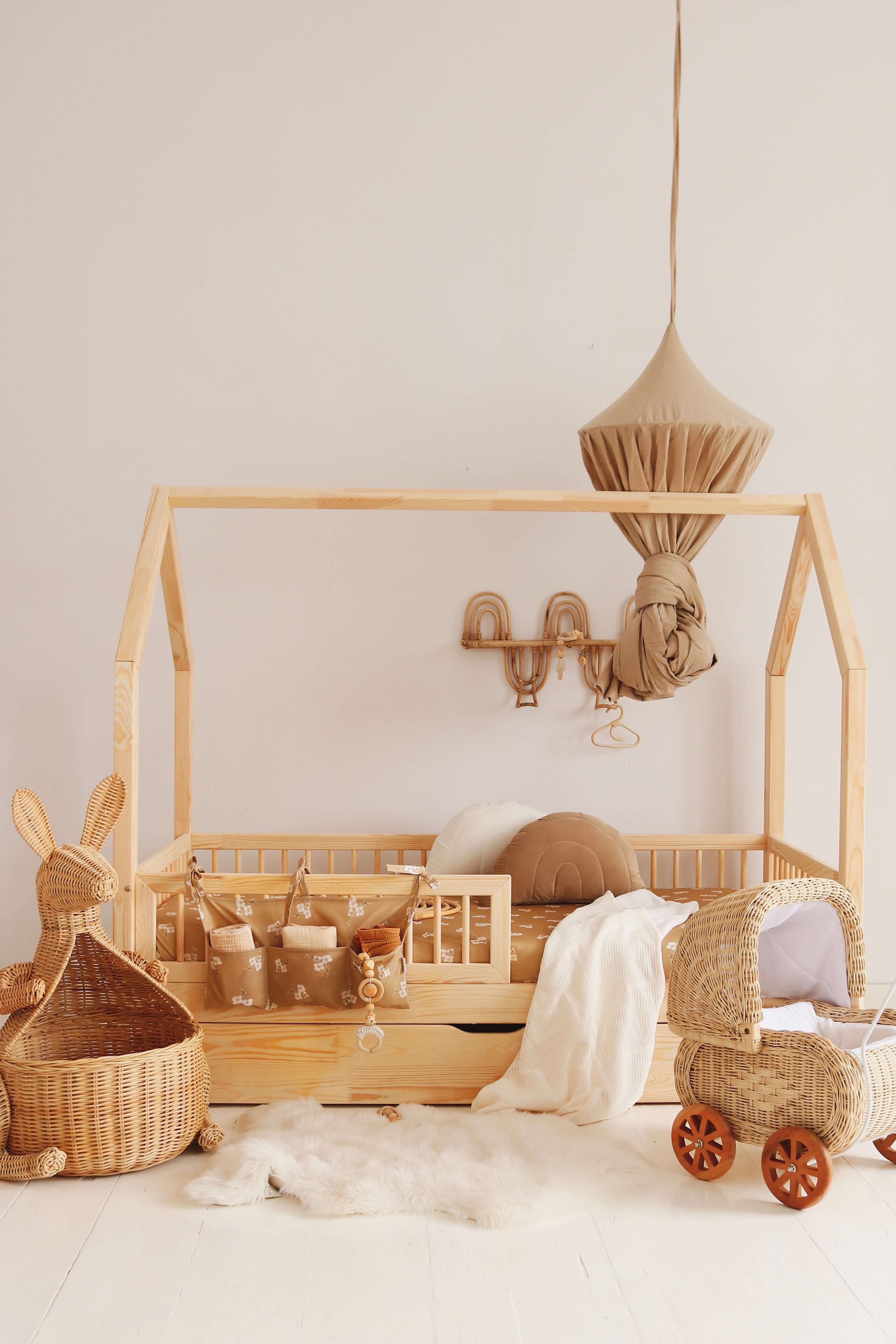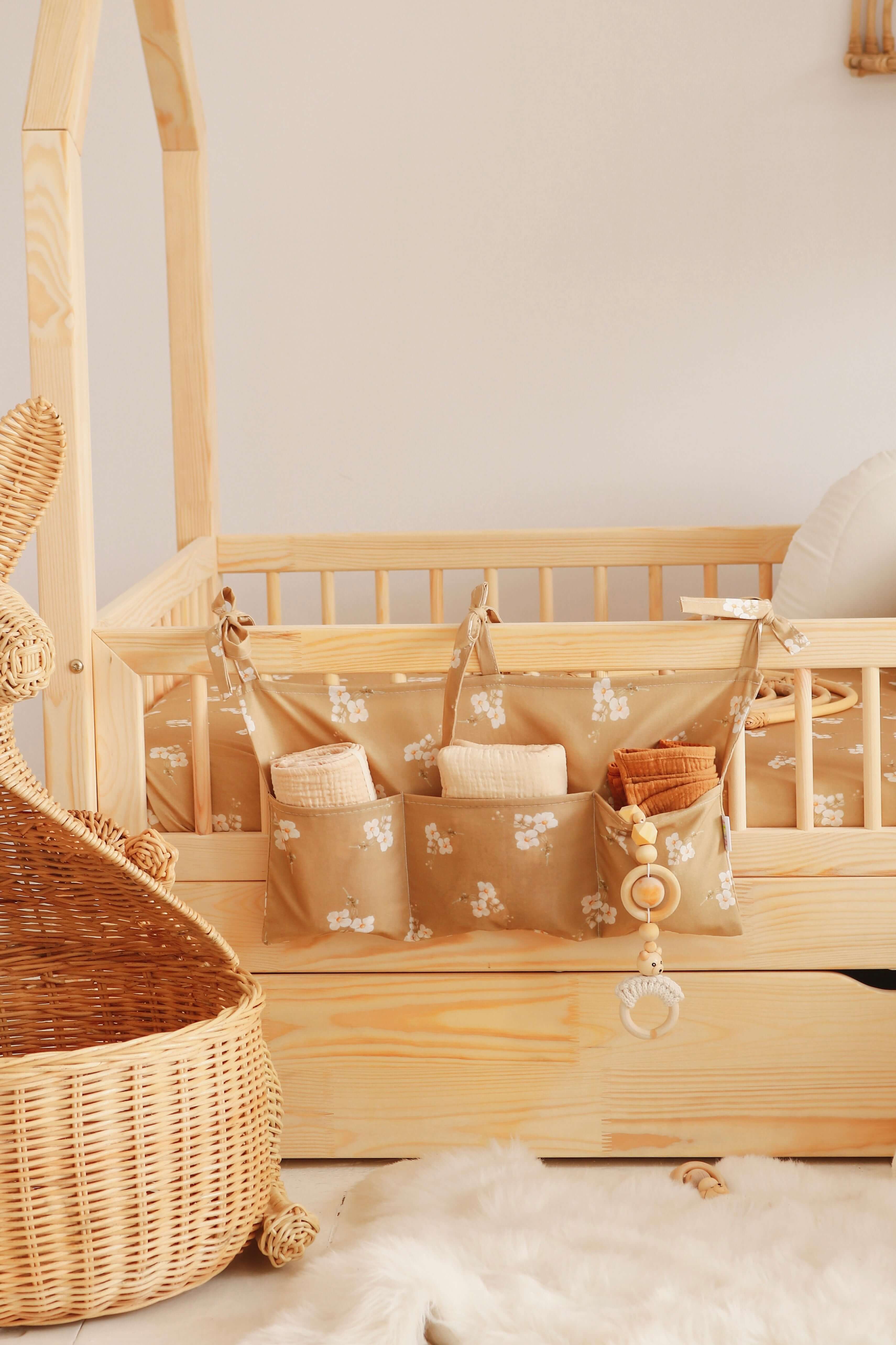 Keep all your nursery must-haves neat and handy with this charming crib organizer in warm caramel tones. Made from soft cotton muslin and adorned with a delicate floral print, this storage pocket combines everyday function with vintage-inspired style – perfect for storing pacifiers, brushes, teethers, or wipes. Easily ties to any crib, playpen or bed frame and brings a cozy touch to your baby’s corner. Product features Dimensions: 50 x 32 cm Fabric: 100% muslin cotton – soft, breathable, textured Color: Caramel background with dusty pink floral print Washing: Machine washable at 40°C Handmade in NL by Roksana (Matuu) Preparation time: 2–3 business days Looking for a custom size? Just send a message!