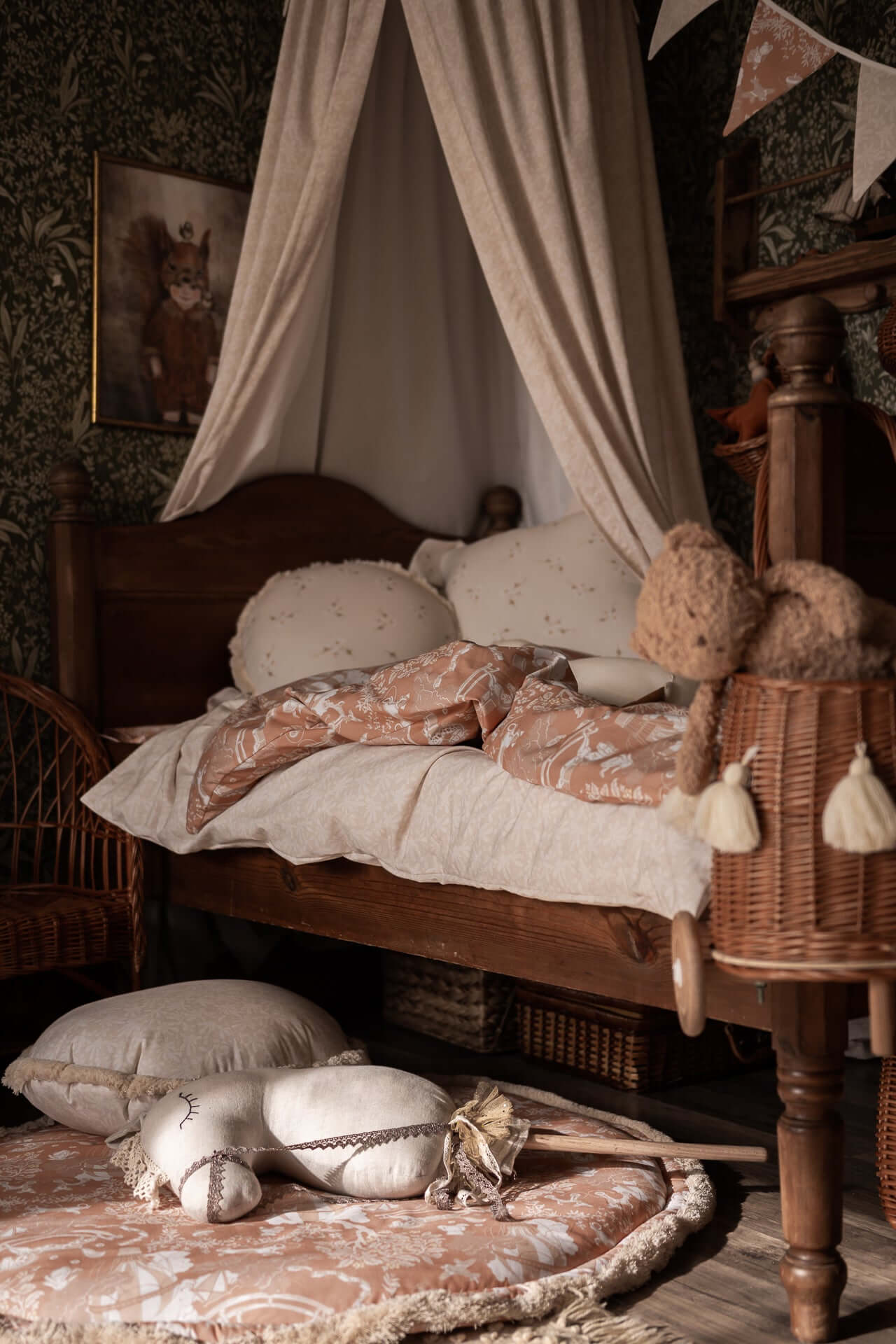 Turn bedtime into a magical moment with the Childhood Dreams bedding set. Made from soft, breathable enzyme-washed cotton, this set features a whimsical design inspired by childhood nostalgia and dreamy nights. The pattern combines a warm rusty-orange background with delicate white illustrations, creating a bold yet calming look. Perfect for boho, vintage, or fairy-tale inspired nurseries and kids’ rooms. Lightweight, durable, and OEKO-TEX® certified, the fabric is gentle on sensitive skin and perfect for everyday use. Each set includes a duvet cover and matching pillowcase, tied with cotton bows instead of zippers or buttons for a soft, handcrafted touch. Lovingly handmade in the Netherlands, this bedding is designed to last and grow with your child. Product Details Material: 100% enzyme-washed cotton – OEKO-TEX® certified Design: Rusty-orange base with white retro-inspired illustrations Closure: Cotton ties (no zippers or buttons) Set includes: 1 duvet cover + 1 pillowcase (all sizes) Sizes: Crib, toddler, junior, and single bed Care: Machine wash at 40 °C, gentle cycle; do not tumble dry; iron on low if needed Production time: 2–3 business days Handmade in the Netherlands by Matuu Perfect For Whimsical, fairy-tale inspired nurseries Parents who love nostalgic and dreamy designs Cozy toddler and kids’ bedrooms Boho or vintage interiors with a magical touch A thoughtful baby shower, birthday, or Christmas gift