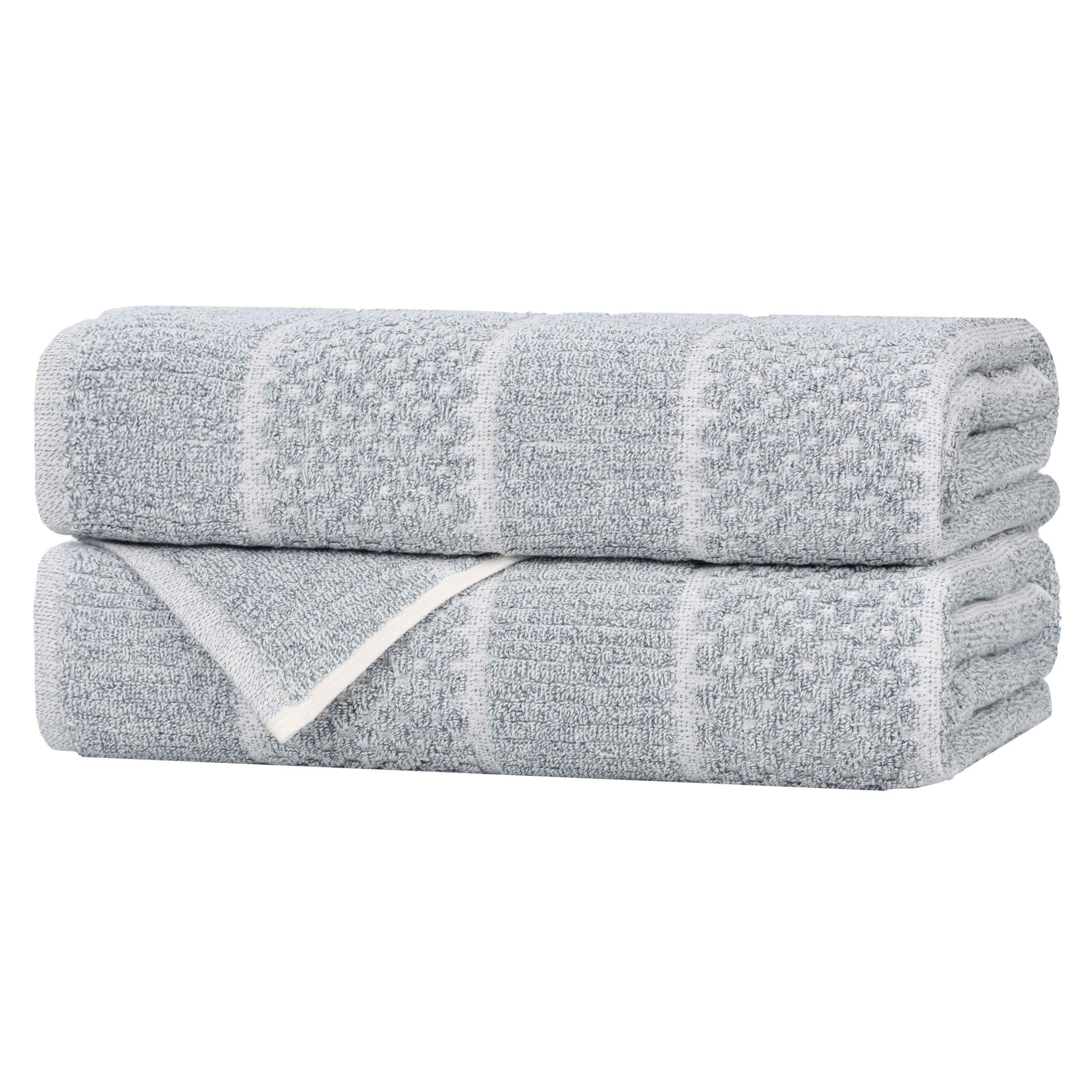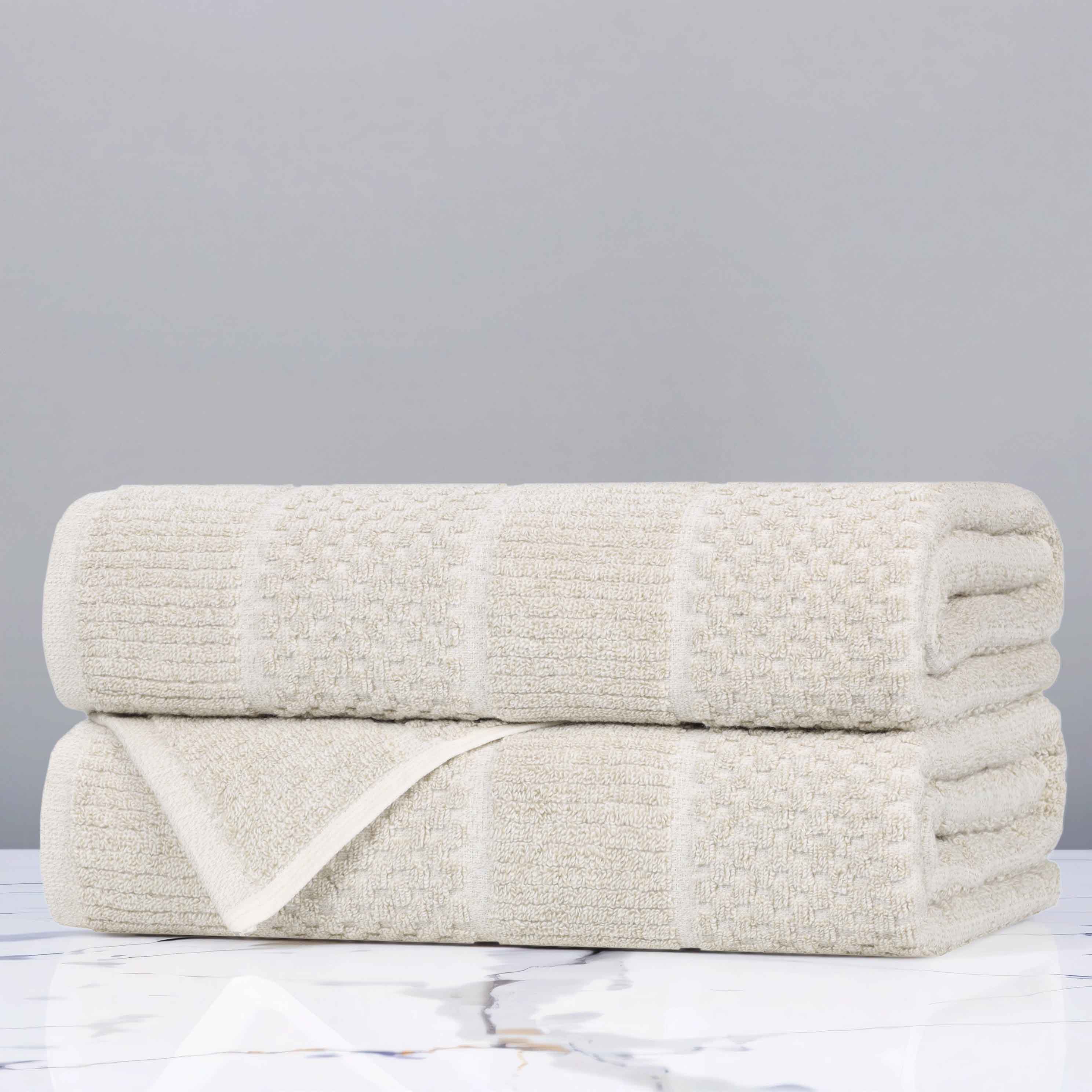 This bath towel set consists of two full – sized towels perfect for personal hygiene. Made from an 80% cotton and 20% viscose blend, they have a plush, terry – cloth – like texture. The towels feature an alternating checkered and ribbed pattern along with a refined white trim, and come in various colors like beige and denim blue.