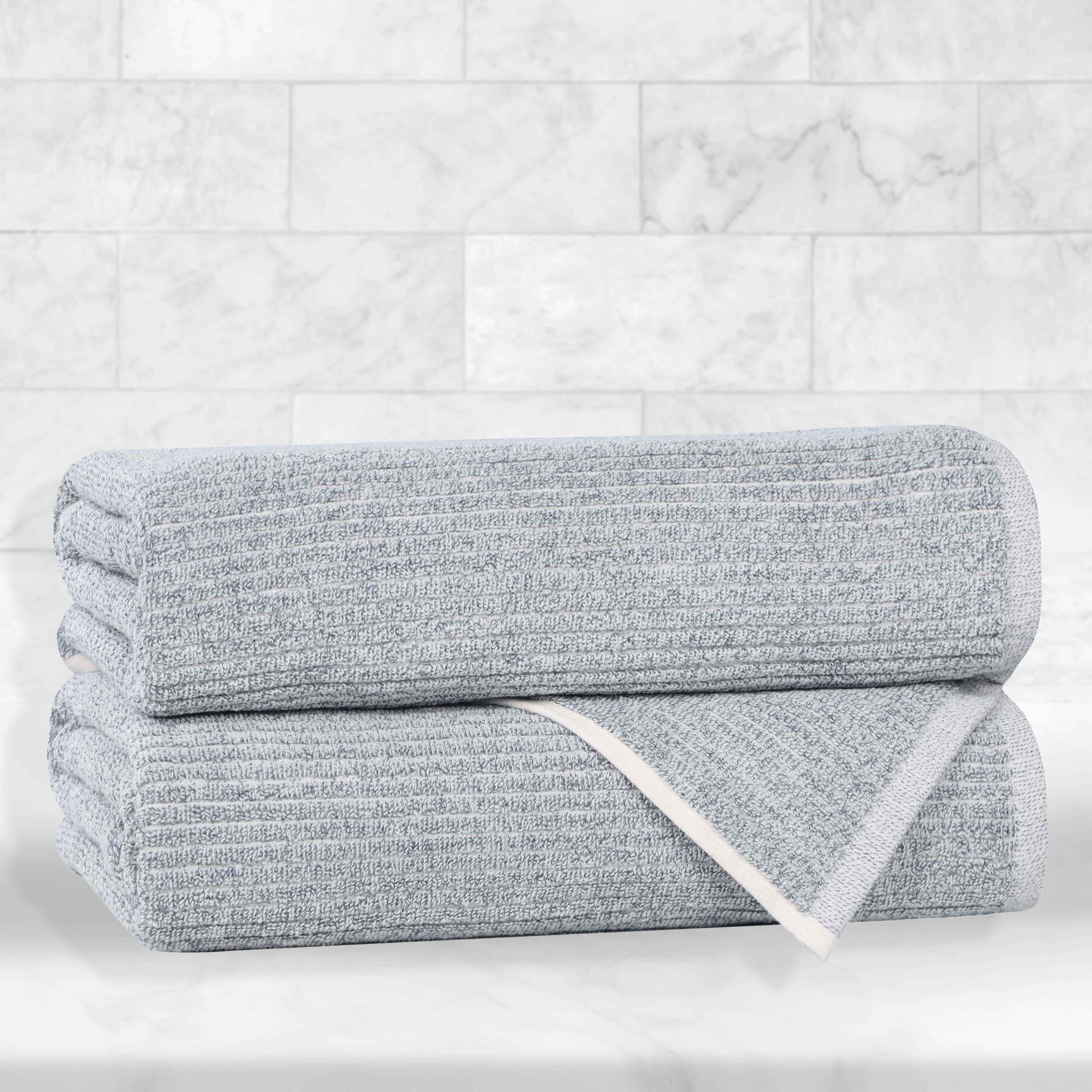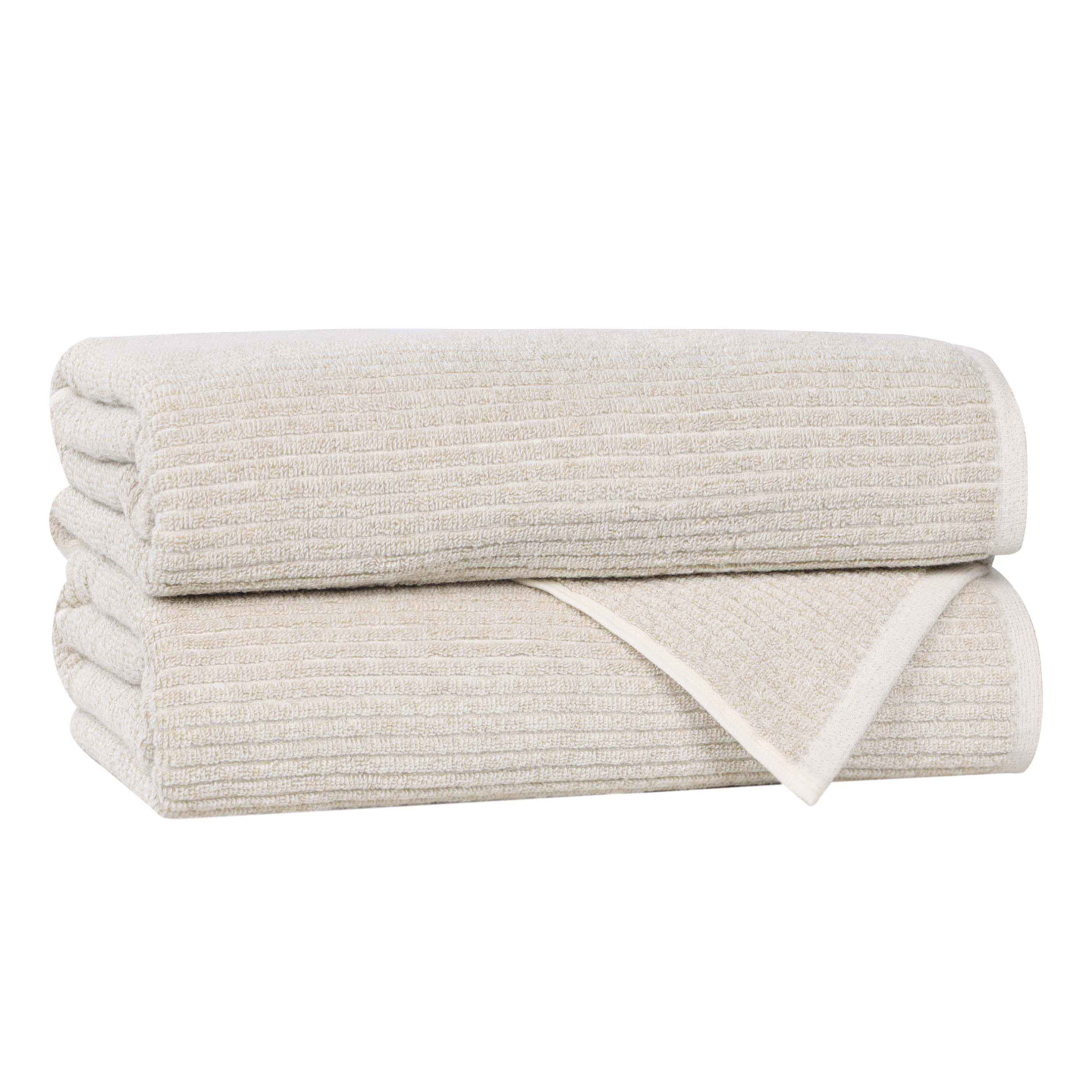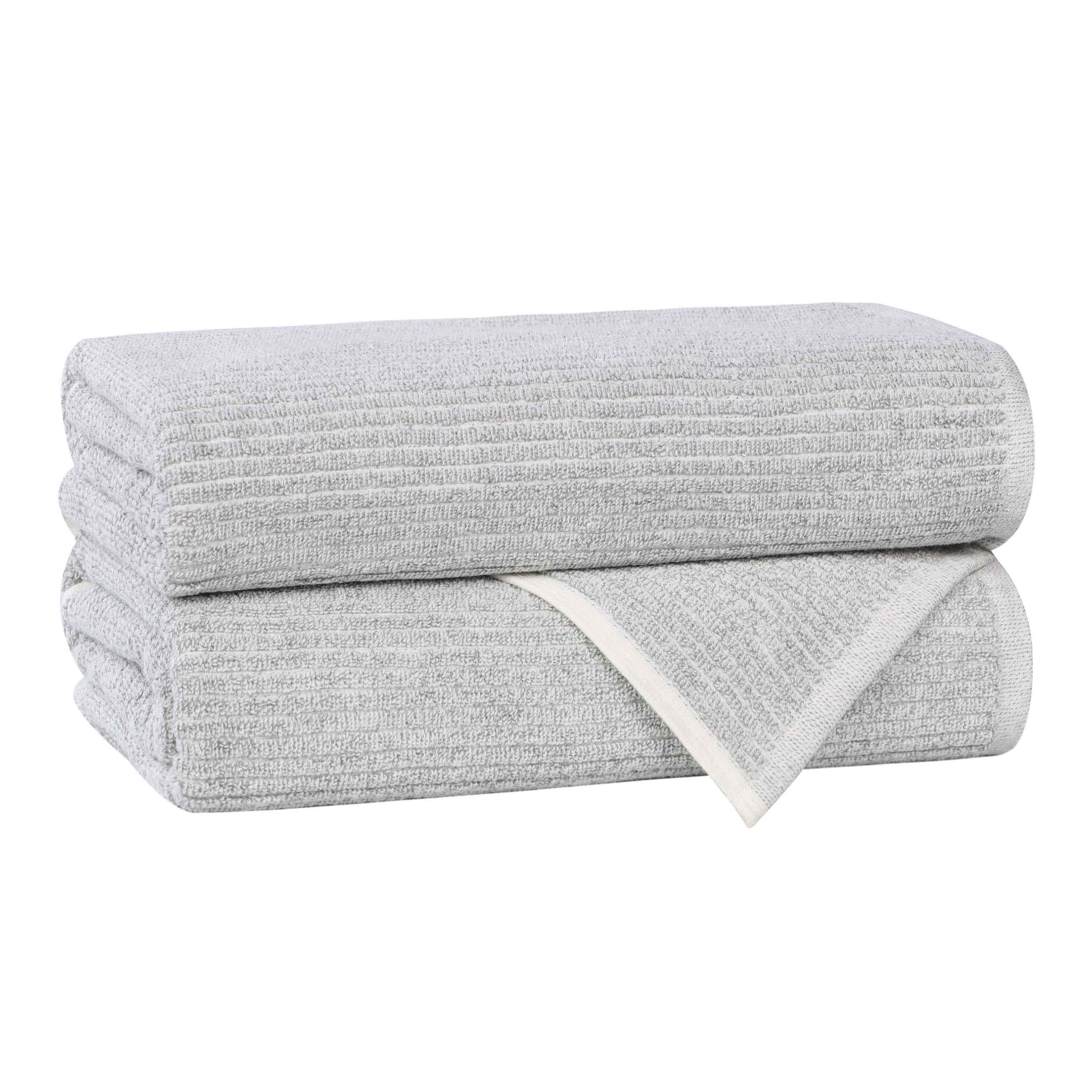 This product is a set of two bath towels crafted from a viscose cotton blend. The towels come in a variety of colors including beige, charcoal, denim blue, and platinum. They feature a ribbed or waffle – like texture with white contrast trim, and their substantial size makes them perfect for body or hand drying.