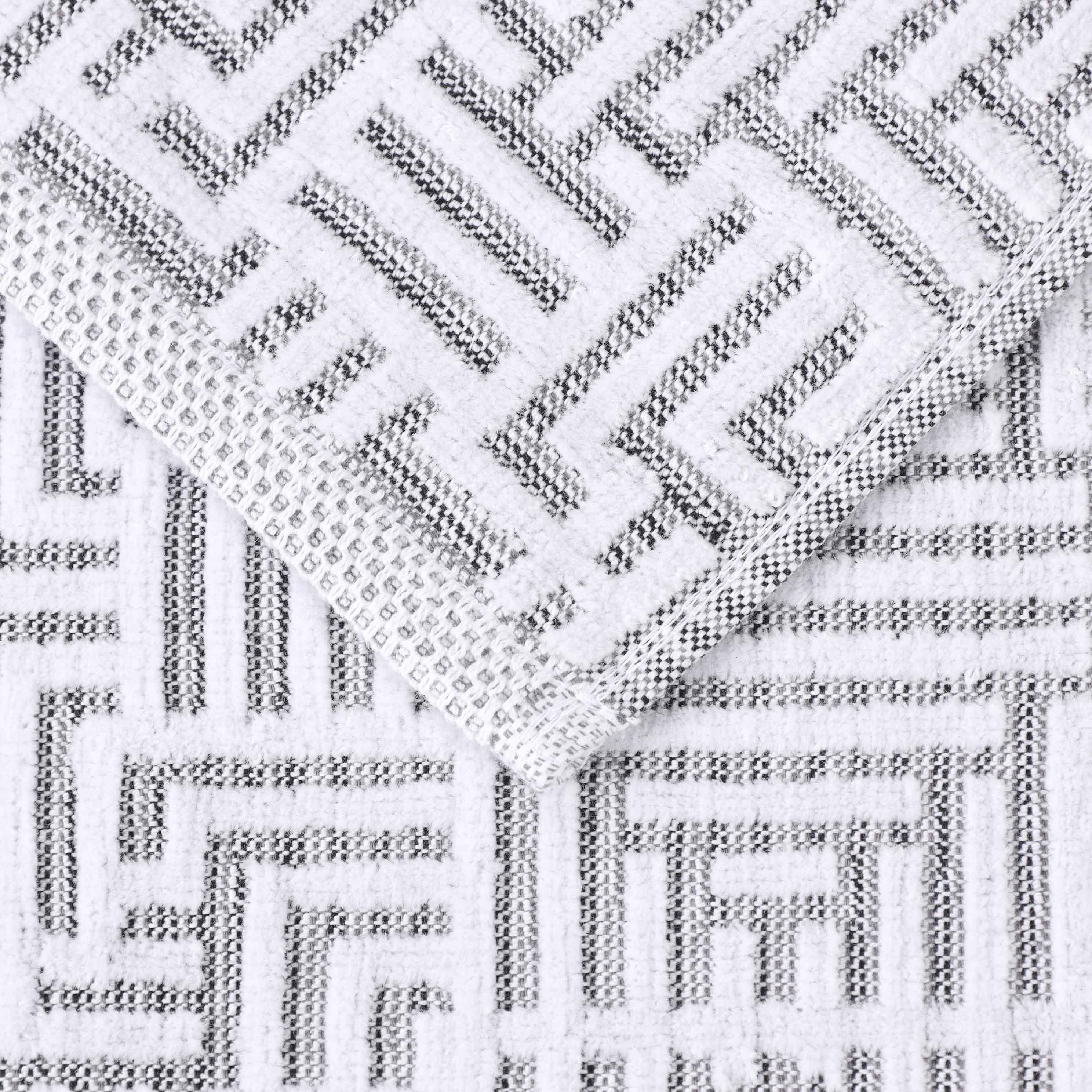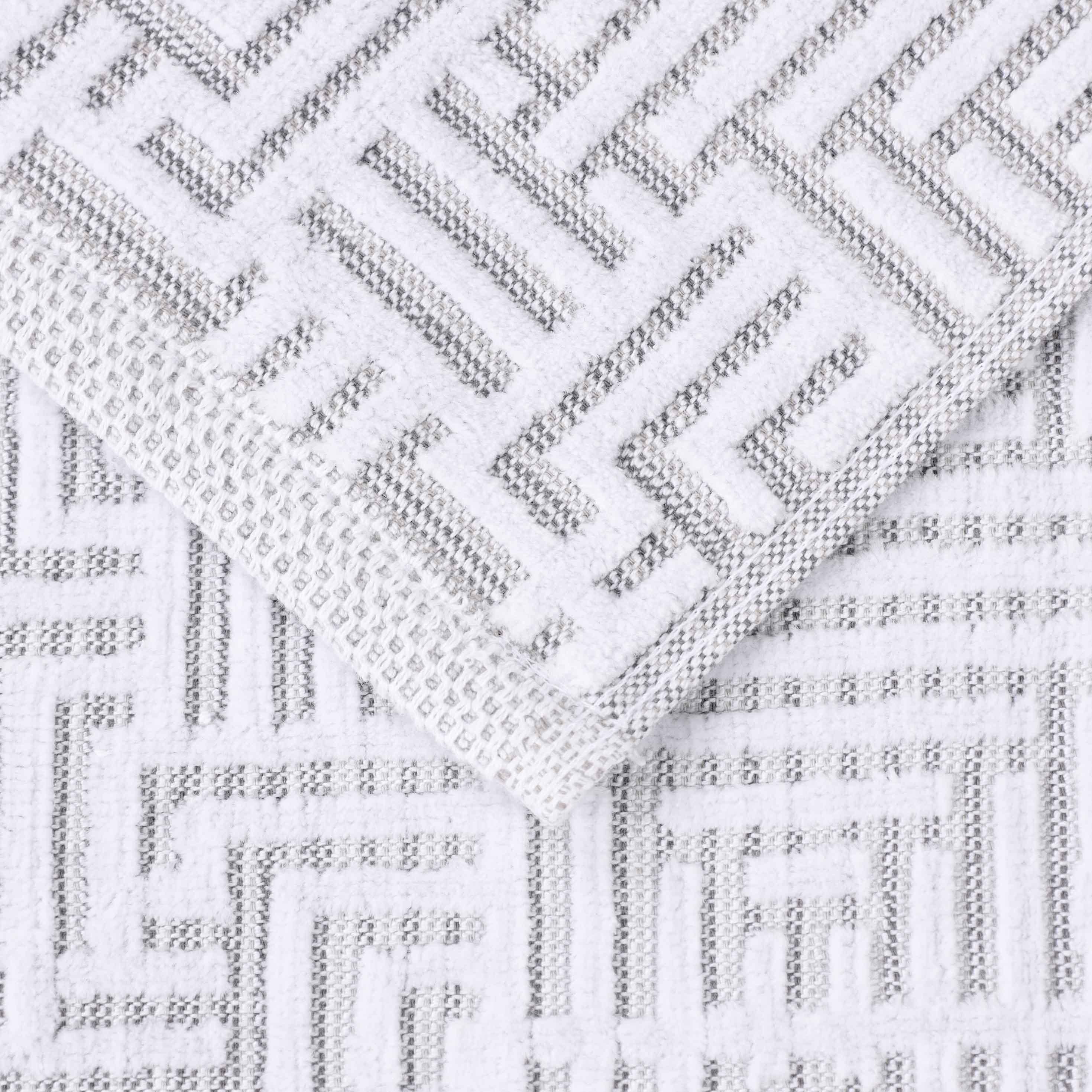 This is a multi – piece bathroom towel set crafted from 100% premium cotton. It features a repeating geometric jacquard – woven pattern with interlocking lines and hexagons, creating a 3D raised texture. The towels have contrasting waffle – like borders, and come in a base color of white with multiple accent color options.