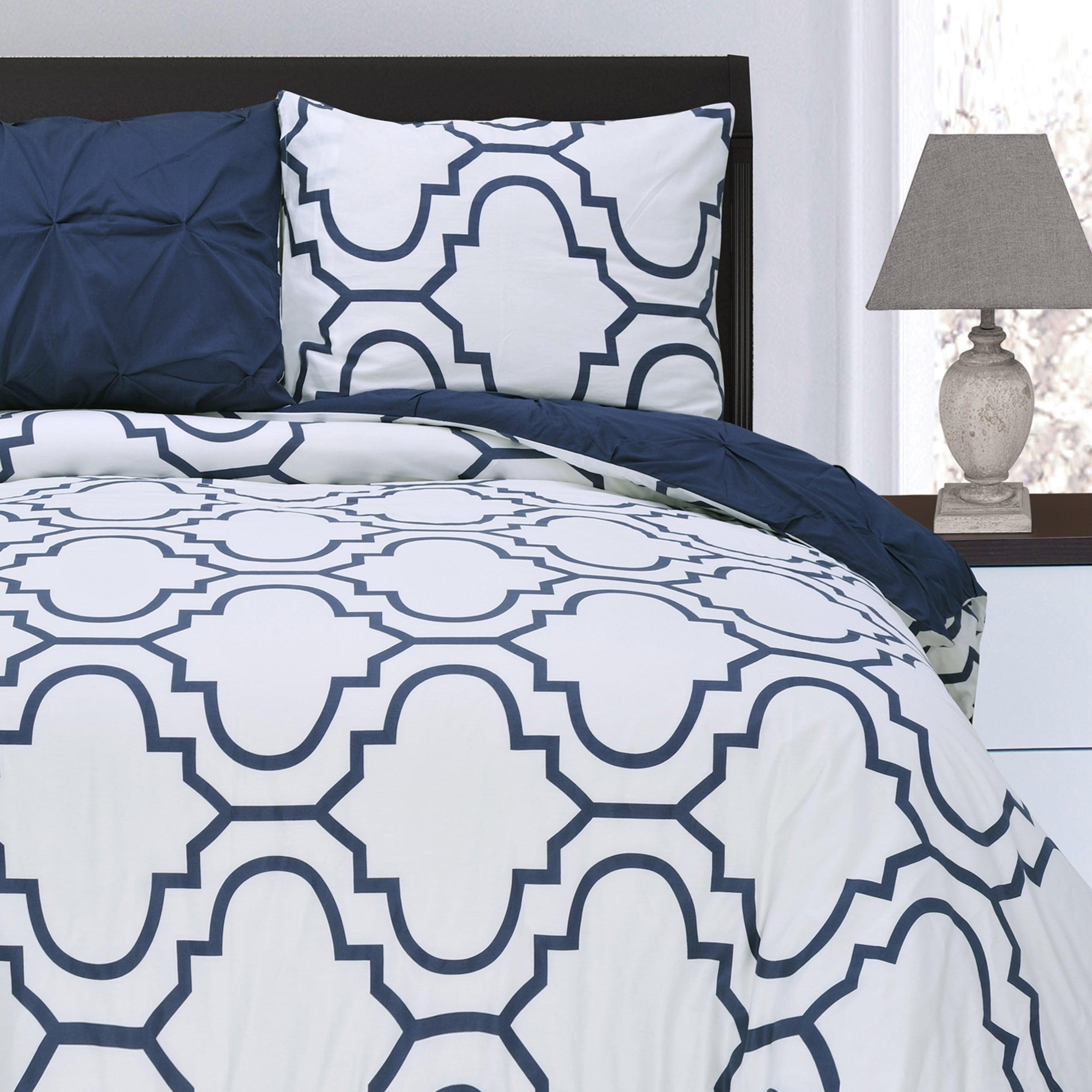 This bedding set offers a stylish and practical solution for your bedroom. It features a reversible design with a solid blue side adorned with decorative pin – tucks and a white side showcasing a geometric pattern. The high – quality smooth woven blend fabric ensures both comfort and durability for daily use.