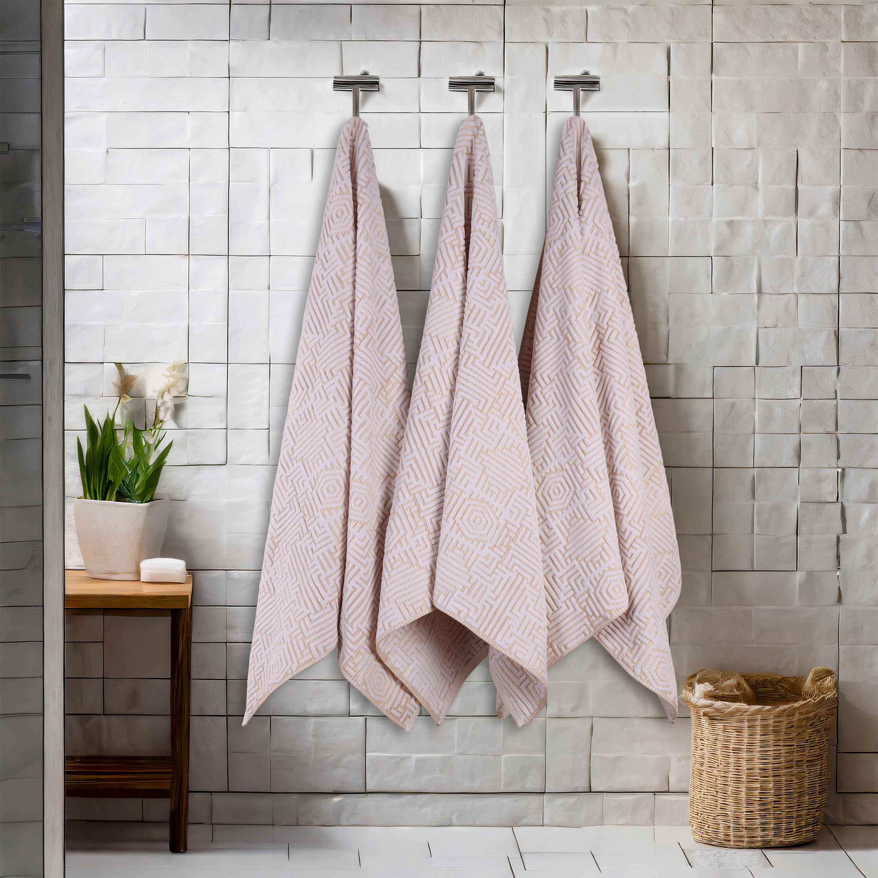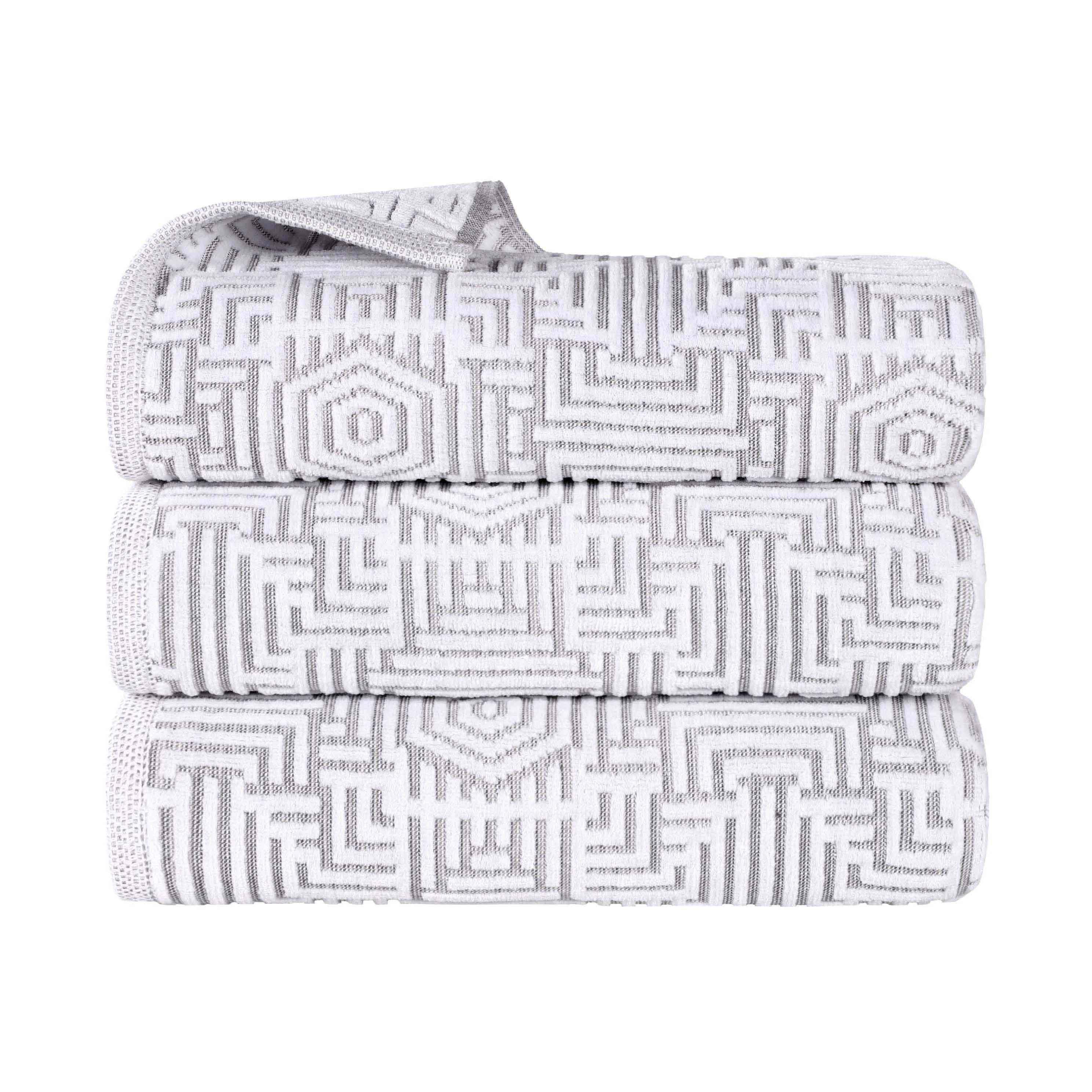 Indulge in the luxury of these cotton bath towels. With a dominant white base and accents of blue, charcoal, gold, and platinum geometric patterns, they feature an intricate jacquard design that adds both visual interest and texture. The thick, plush 100% cotton material ensures high absorbency, making them perfect for post-bath or hand drying.