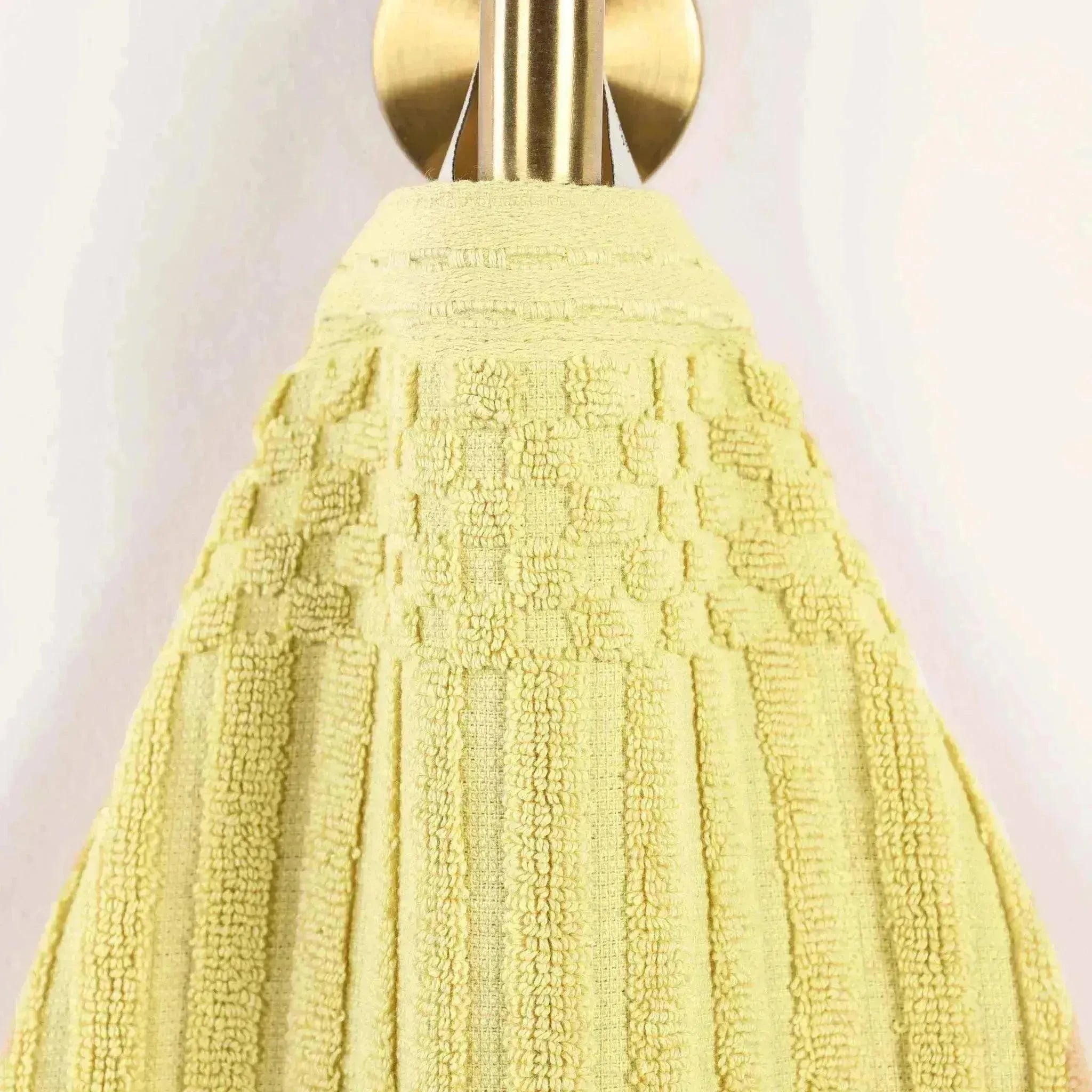 - Decorative embossed/checkered borders on larger towels to prevent fraying and enhance durability.