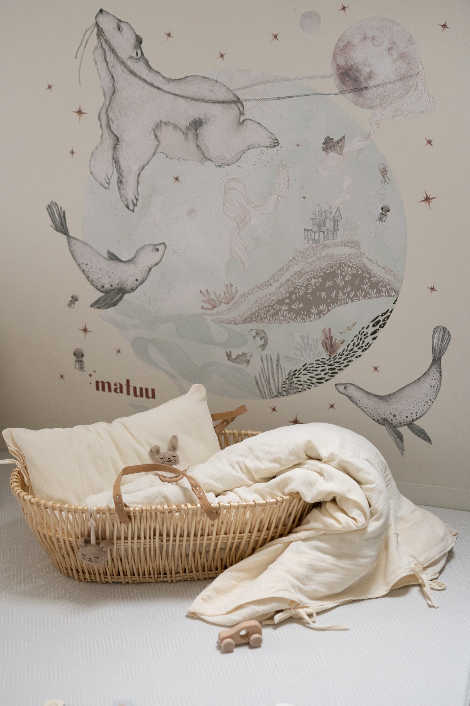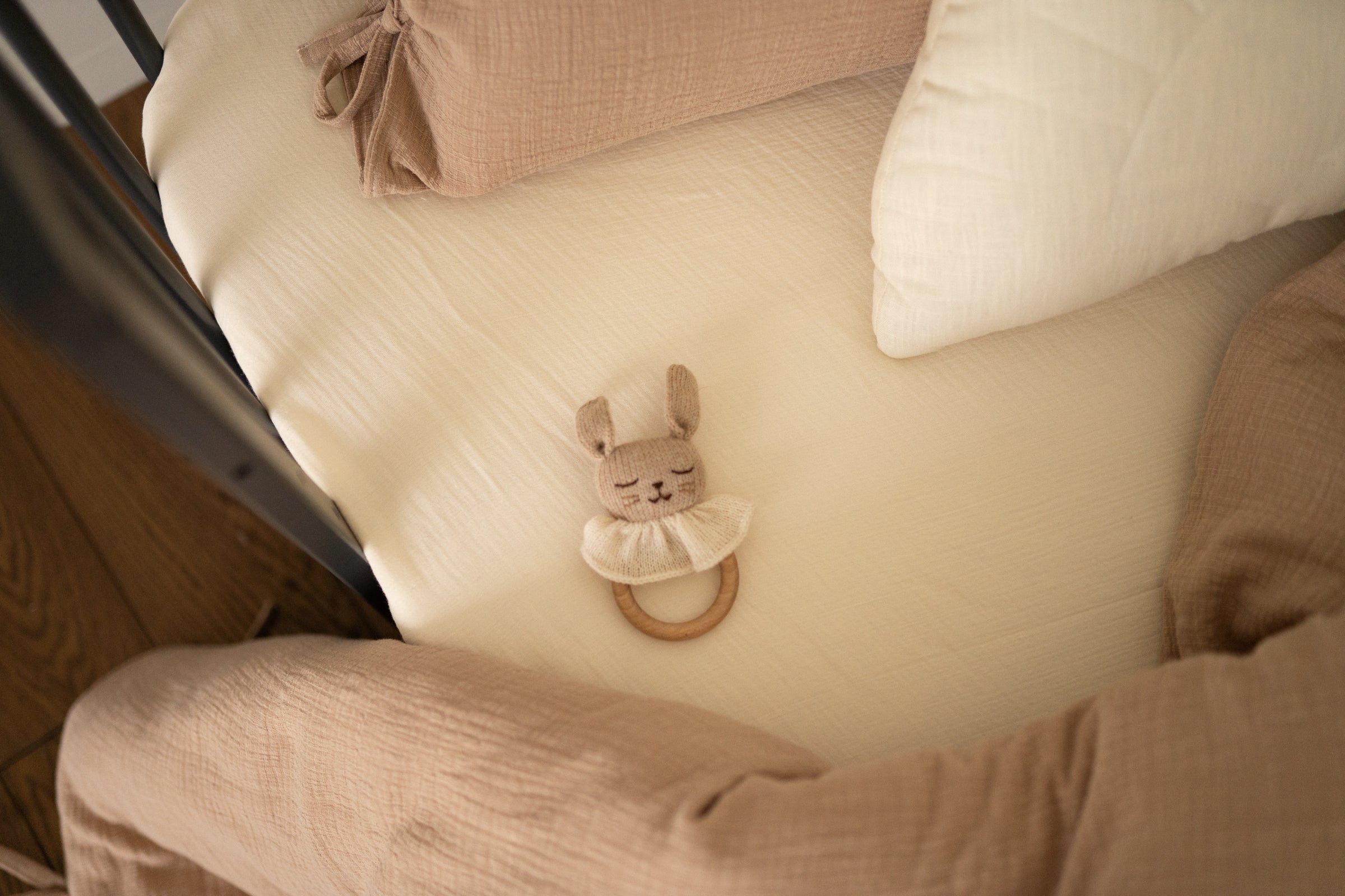 Create a calm and timeless atmosphere in your nursery with our Cream Muslin fitted sheet. Made from soft and breathable cotton muslin, it features a beautiful natural cream shade — gentle, neutral, and easy to match with any interior style, from modern minimalism to cozy boho. The elasticated edges ensure a perfect fit and keep the sheet securely in place, offering your baby a soft and comfortable surface for sleeping and playing. Available in multiple sizes to fit cribs, toddler beds, or changing baskets. Product details: • Fabric: 100% cotton muslin (double gauze) — soft and breathable • Color: Cream • Sizes: Available from crib to single bed • Fit: Elasticated edges for a secure fit • Care: Machine wash at 40°C • Preparation time: 2–3 business days • Handmade with care in the Netherlands by Matuu Perfect for: • Crib or toddler bed — ideal for babies and young children • Neutral and timeless nursery styling • Matching with Matuu bedding, canopies, pillows, and décor • A thoughtful handmade gift for new parents or baby showers