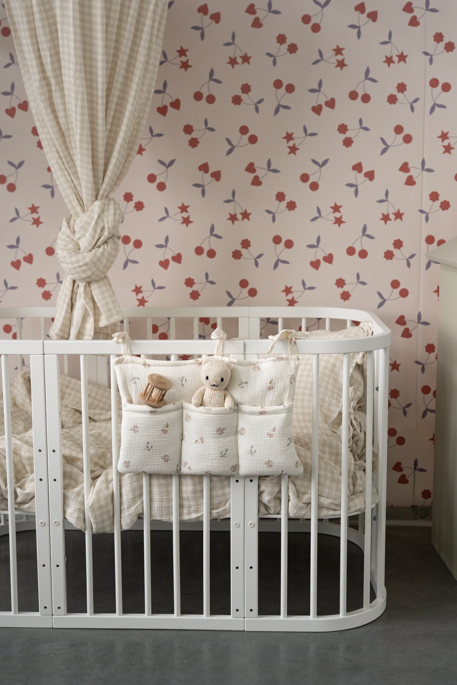 Keep your babyโs essentials tidy and close at hand with our Cream Tiny Flowers bed pocket. Made from soft, OEKO-TEXยฎ certified cotton with a delicate floral print in warm neutral tones, itโs the perfect mix of beauty and practicality. Featuring two roomy front pockets, this organizer is ideal for pacifiers, wipes, small toys or teethers. Tie it easily to the crib, toddler bed or playpen and enjoy a calm, organized space full of vintage charm. A timeless nursery accessory โ ideal for floral, boho or gender-neutral interiors. Handmade with care in the Netherlands. Product details: Size: 50 ร 32 cm Fabric: 100% cotton, OEKO-TEXยฎ certified Print: Cream base with tiny brown/red/blue floral sprigs Attachment: Two cotton ties โ fits any crib or rail Washing: Machine washable at 40ยฐC Preparation time: 2โ3 next business days Handmade by Matuu in the Netherlands Perfect for: Keeping nursery essentials organized Floral, vintage or boho-style nurseries Baby shower gift ideas Gender-neutral baby rooms