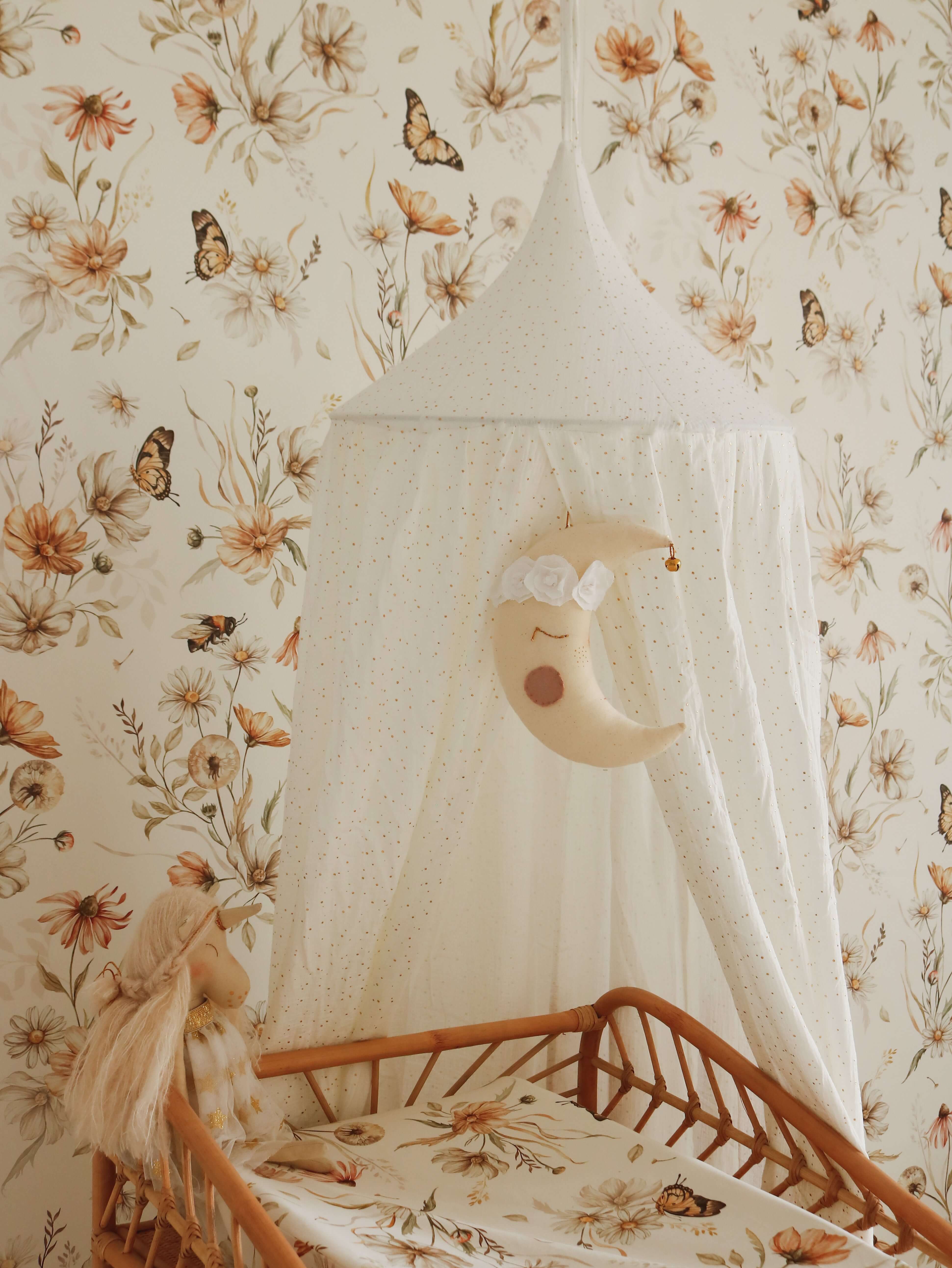 Add softness, light and a touch of magic to your child’s room with our Cream with Gold Dots canopy – handcrafted from breathable cotton muslin in a warm cream tone with subtle golden dots that shimmer gently in the light. This lightweight canopy creates a calming, cozy hideaway above a crib, toddler bed or reading nook. The airy fabric filters light softly, while the gold accents bring a dreamy sparkle to any nursery or kids’ room. It’s easy to hang with long cotton ties and keeps its shape beautifully thanks to the hidden metal hoop. Inside, there’s a loop to hang a mobile, pendant or fairy lights. Product Details • Fabric: 100% cotton muslin with gold dots – OEKO-TEX® certified • Color: Cream with subtle gold accents • Height: approx. 235 cm (fabric) + 60 cm cotton ties • Hoop diameter: 50 cm (metal ring included, hidden inside) • Mounting: Two cotton ties – fits any ceiling hook • Interior loop: For mobile, pendant or fairy lights • Care: Remove hoop before washing. Machine wash at 30°C, gentle cycle, air dry • Preparation time: 2–3 business days • Handmade in the Netherlands by Matuu Perfect for: • Cribs, toddler beds and kids’ beds • Soft, neutral or romantic nursery styling • Boho or golden accent baby rooms • Cozy reading or play corners • Unique handmade baby shower or birthday gift