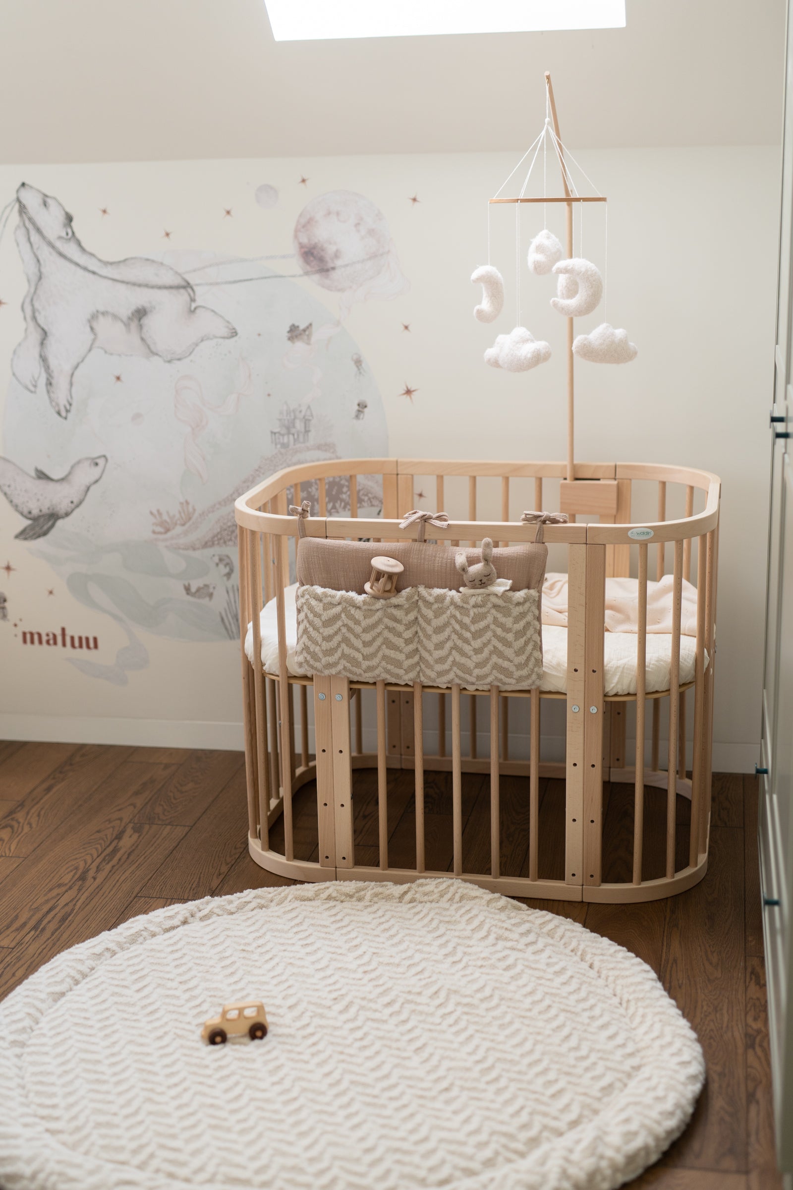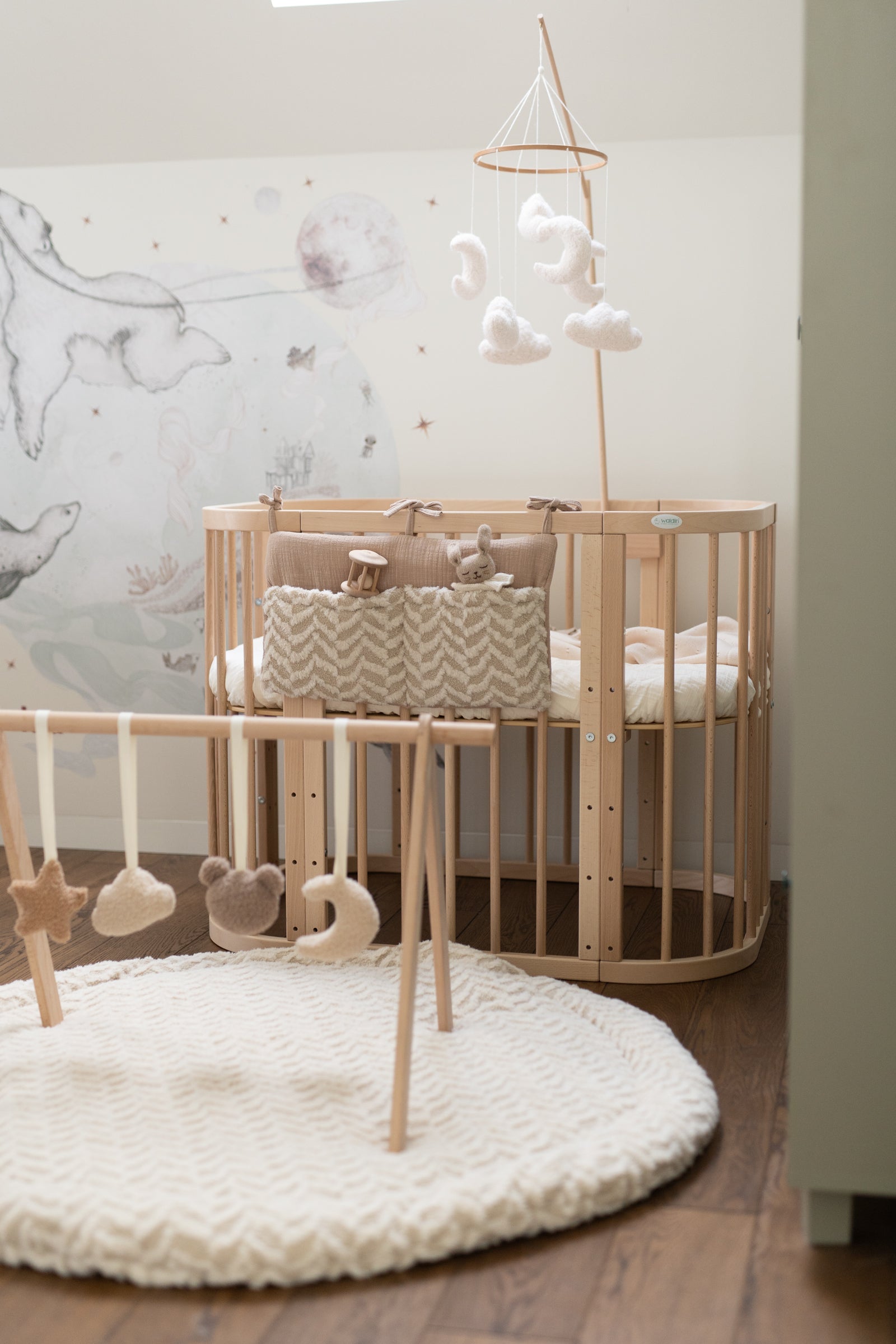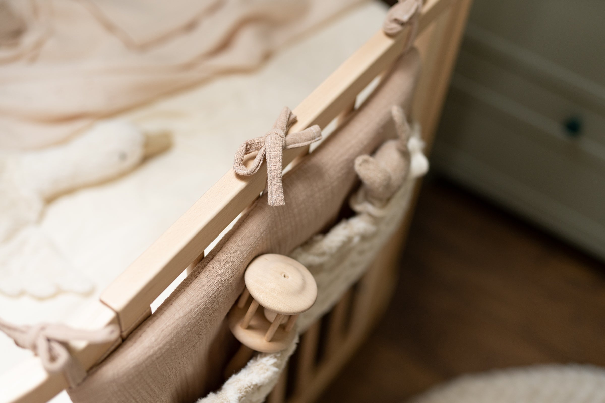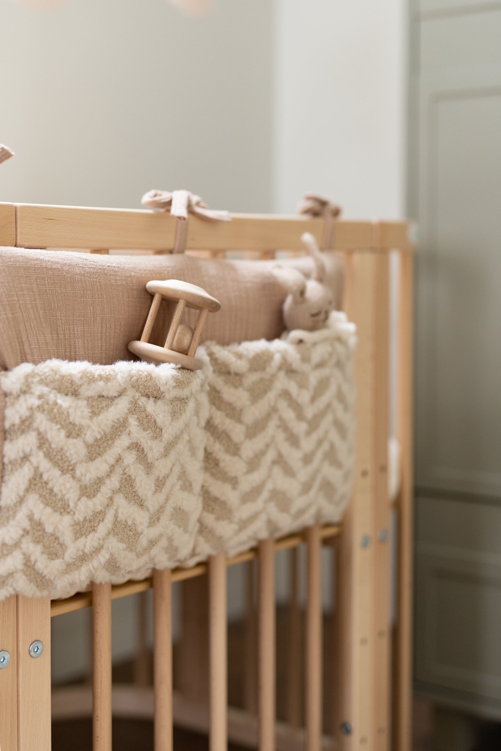 Keep all the baby essentials close at hand with our soft and stylish crib organizer in creamy herringbone. The upper part is made from breathable muslin cotton, while the textured teddy pockets offer a cozy, tactile feel – perfect for storing pacifiers, rattles, cuddly toys and more. Easy to attach to any crib or playpen with three tie straps. Handmade with care in Amsterdam for practical beauty in every detail. A charming mix of texture and calm tones – designed to blend beautifully with modern nurseries and wooden furniture. Product features Size: 50 x 32 cm Top: 100% muslin cotton Pockets: soft teddy fabric (polyester blend) Washing: machine washable at 40°C Handmade in the Netherlands Preparation time: 2–3 business days Custom sizes available – just send us a message!
