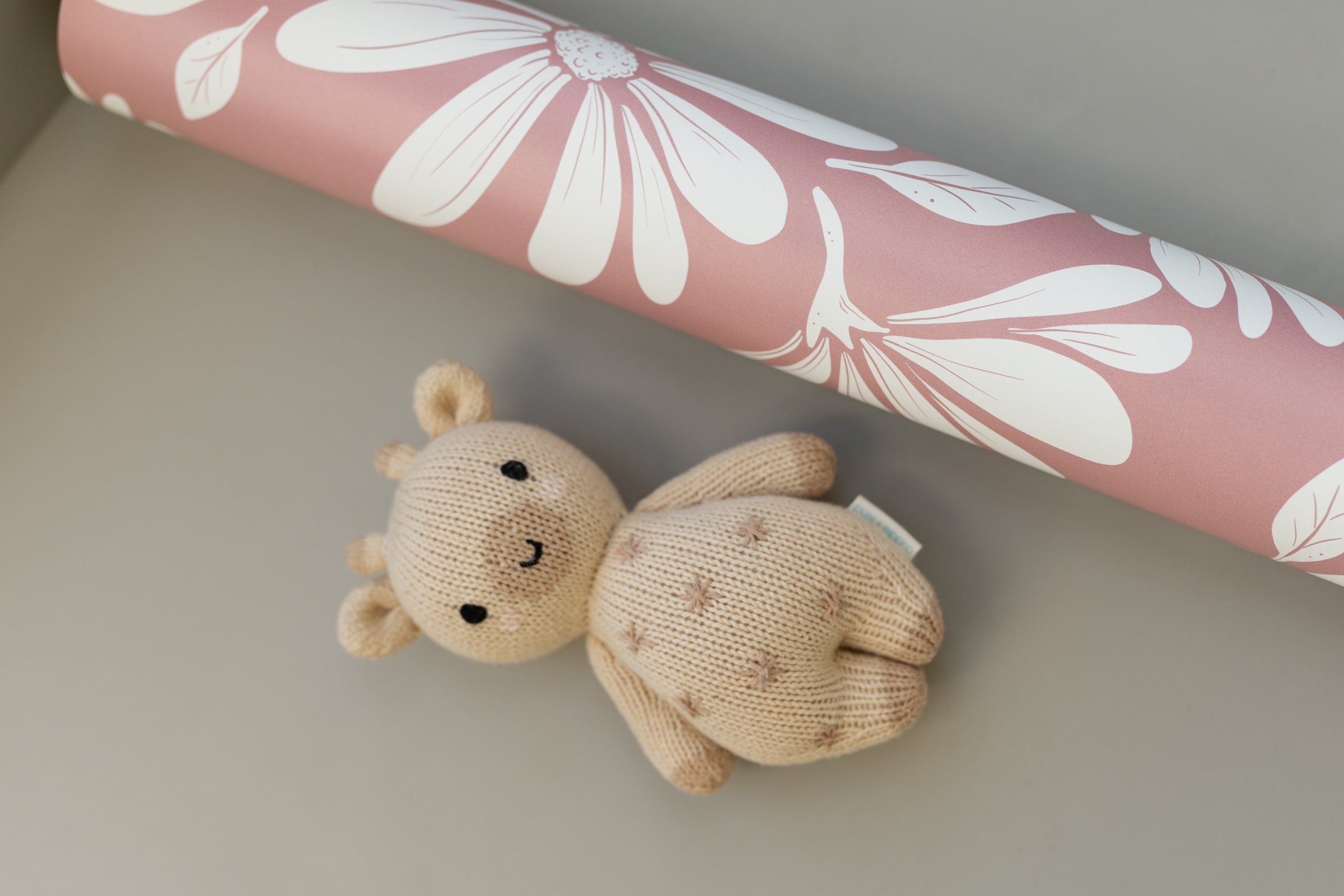 Daisy Bloom β deep rose wallpaper brings warmth and vintage charm to nurseries, kidsβ rooms or any cozy space. This romantic wallpaper features hand-painted white daisy scattered across a rich, deep rose background. The design combines natural elegance with soft nostalgia β perfect for creating a calming, storybook-inspired atmosphere. The deep pink hue adds depth and coziness without overpowering the room, making it ideal for both modern and classic interiors. Printed on high-quality non-woven material, this wallpaper is easy to apply β simply paste the glue on the wall and smooth on the strips. A timeless floral choice for girlsβ rooms, reading nooks or any space that embraces soft, natural beauty. Product features Design: hand-drawn white daisies on a warm yellow backdrop Color palette: deep rose, creamy white Material: high-quality non-woven (vlies) wallpaper Finish: elegant matte surface Pattern repeat: every 50 cm Production: made to order β each wallpaper is custom-printed just for you Dimensions & Installation Available sizes: β’ 2 strips measuring 50 Γ 270 cm β’ 2 strips measuring 50 Γ 310 cm Coverage: 1 set covers 1 meter wall width Installation: β’ Paste the wall (not the wallpaper) β’ Use non-woven wallpaper paste β’ Surface must be clean, smooth, and dry β’ Instructions: Download the step-by-step non-woven wallpaper guide How many rolls do I need? Each set includes 2 vertical strips (50 cm wide), coveringΒ 1 meter in width. Examples: Wall width 2.3 m β order 3 sets Wall width 4 m β order 4 sets Tip: Always add 5β10 cm margin, as walls are rarely perfectly straight. Production & Delivery Production time: 1-3 business days Shipping time: 2β7 business days (Europe) Check β Double Check Please carefully inspect your wallpaper before installation. Verify colours, pattern alignment, and length immediately upon delivery. We allow a cutting tolerance of up to 1 mm per strip. If the deviation is larger, we will gladly reprint your order. *Once the wallpaper has been cut and installed, it is no longer possible to objectively determine whether any irregularity originates from production or from handling during installation. For this reason, claims raised after installation are very difficult to assess. Important Notes This wallpaper is not kept in stock β itβs printed to order. Not sure about the colour or pattern scale?We recommend ordering a sample first
