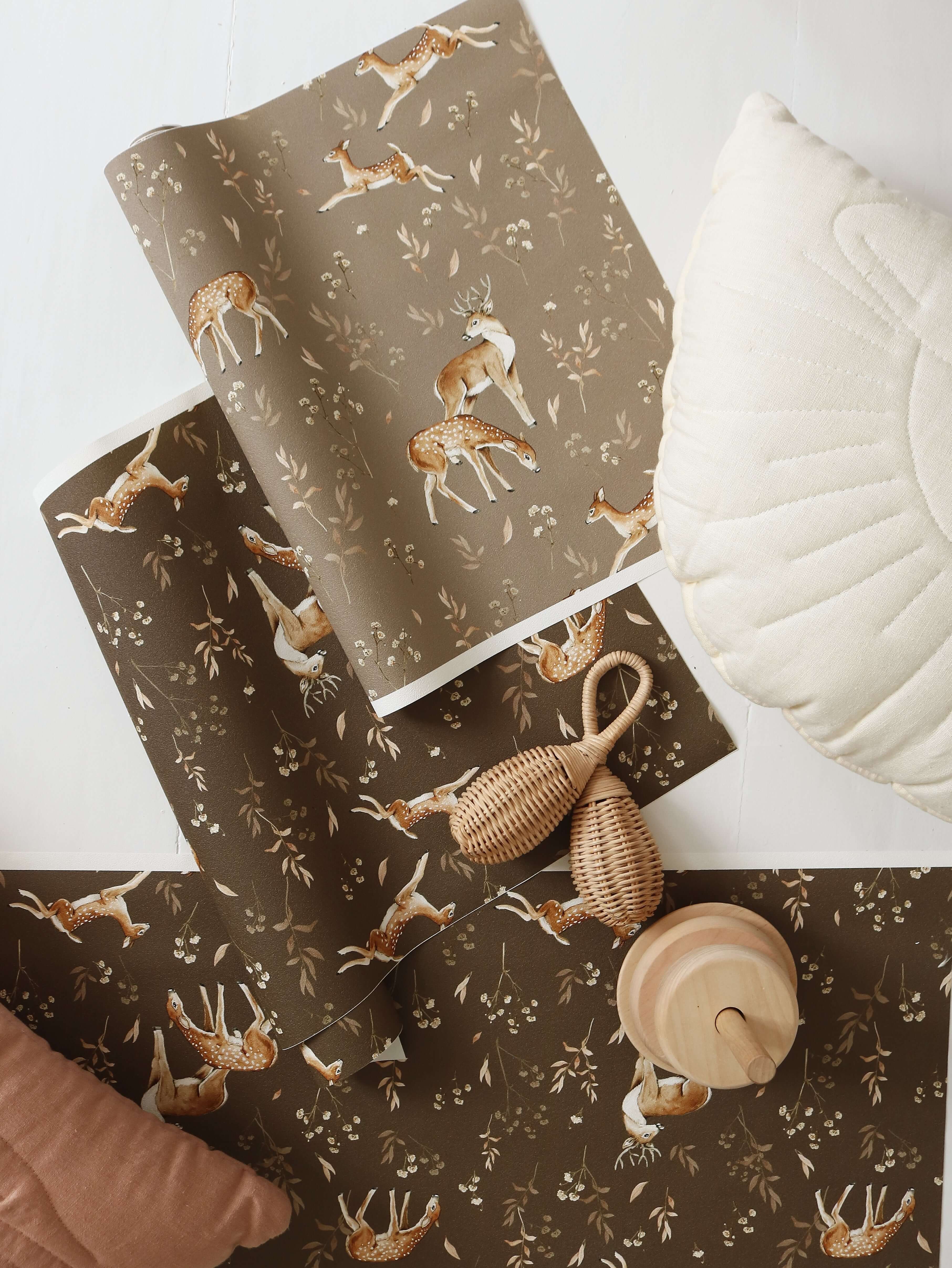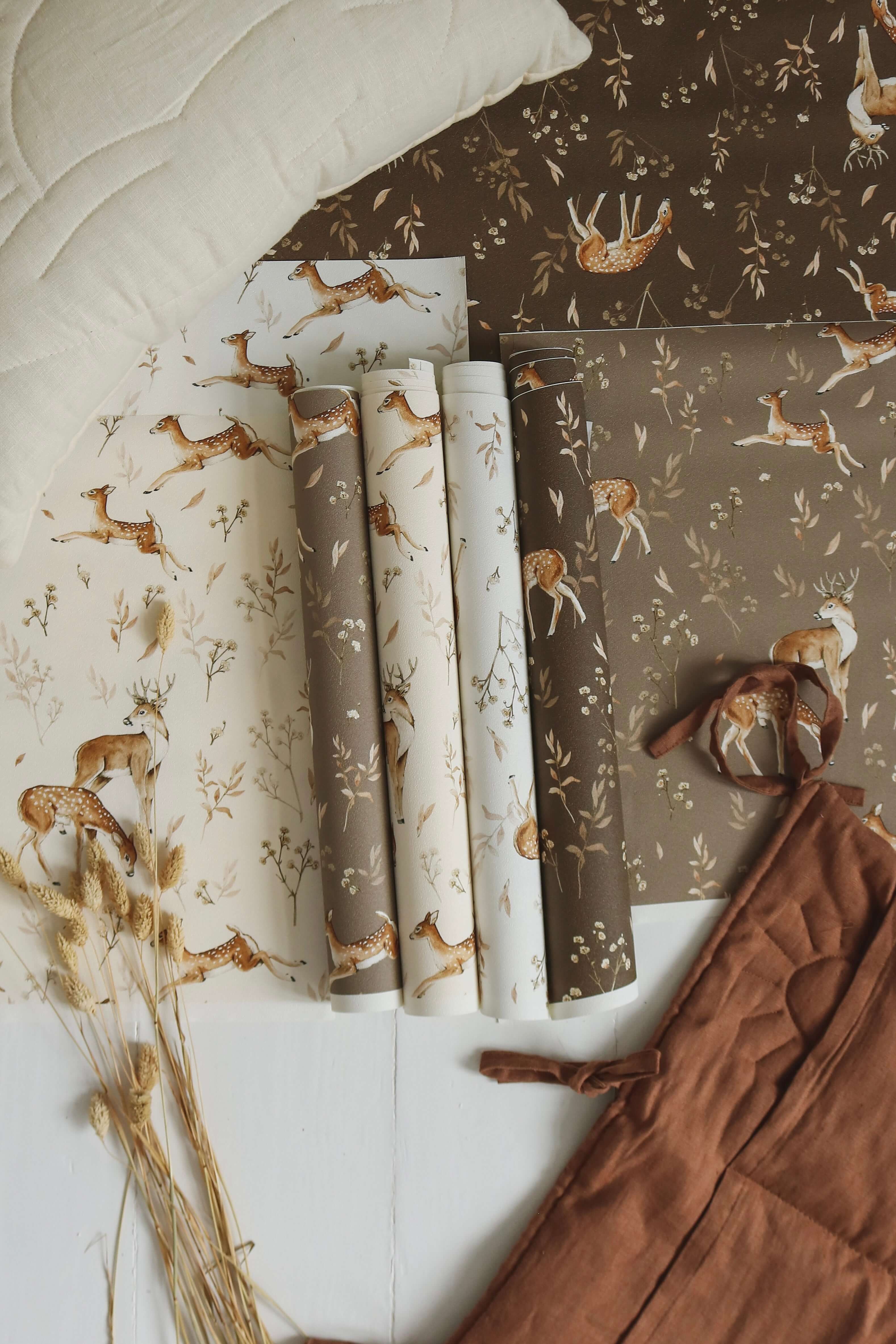 Bring the magic of the forest into your home with Deer Glade β dark beige wallpaper by Matuu. Featuring hand-drawn deer, delicate leaves, and woodland details on a soft dark beige background, this premium non-woven (flizelin) wallpaper creates a calm, nature-inspired atmosphere in nurseries, kidsβ rooms, bedrooms, or cozy corners. Perfect for Scandinavian-style interiors, Deer Glade β dark beige combines timeless design with easy installation and long-lasting quality. Whether for a feature wall or an entire room, this wallpaper adds subtle elegance and warmth. Why Youβll Love It Dark beige background with delicate deer and forest pattern Hand-drawn artistic details for a soft, nature-inspired feel Suitable for nurseries, kidsβ rooms, bedrooms, or Scandinavian interiors Premium non-woven (flizelin) material β paste-the-wall application Product Details Roll width: 50 cm Roll height: 270 or 310 cm Two rolls cover 1 meter of wall width Pattern repeat: every 50 cm Finish: matte, non-reflective Sizes & Installation β’ Available sizes: ββ 2 strips of 50 Γ 270 cm ββ 2 strips of 50 Γ 310 cm β’ Coverage: 1 set covers 1 meter of wall width Β Installation: β’ Paste the wall (not the wallpaper) β’ Use non-woven wallpaper paste β’ Surface must be clean, smooth, and dry β’ Instructions: Download the step-by-step non-woven wallpaper guide Production & Delivery β’ Production time: 1β3 business days β’ Delivery time: 2β7 business days (EU) Double-Check Before Installing Please carefully inspect your wallpaper before installation. Verify colours, pattern alignment, and length immediately upon delivery. We allow a cutting tolerance of up to 1 mm per strip. If the deviation is larger, we will gladly reprint your order. *Once the wallpaper has been cut and installed, it is no longer possible to objectively determine whether any irregularity originates from production or from handling during installation. For this reason, claims raised after installation are very difficult to assess. Important Notes This wallpaper is not kept in stock β itβs printed to order. Not sure about the colour or pattern scale?We recommend ordering a sample first.